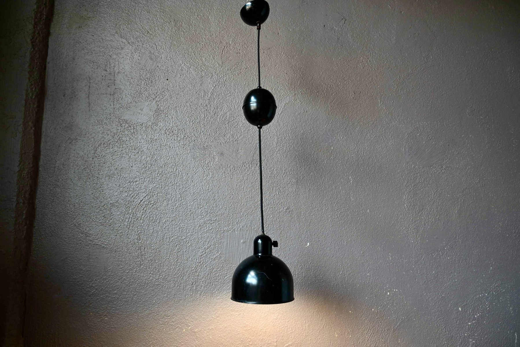 The Kaiser Idell suspension is old, it is a rare production from the 1930s. The height adjustment system is no longer operational. The ceiling cable cover is also original. The electrification has been redone. Some traces of use are visible on the black paint. We have several lamps of this model.