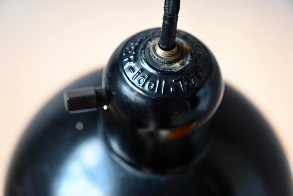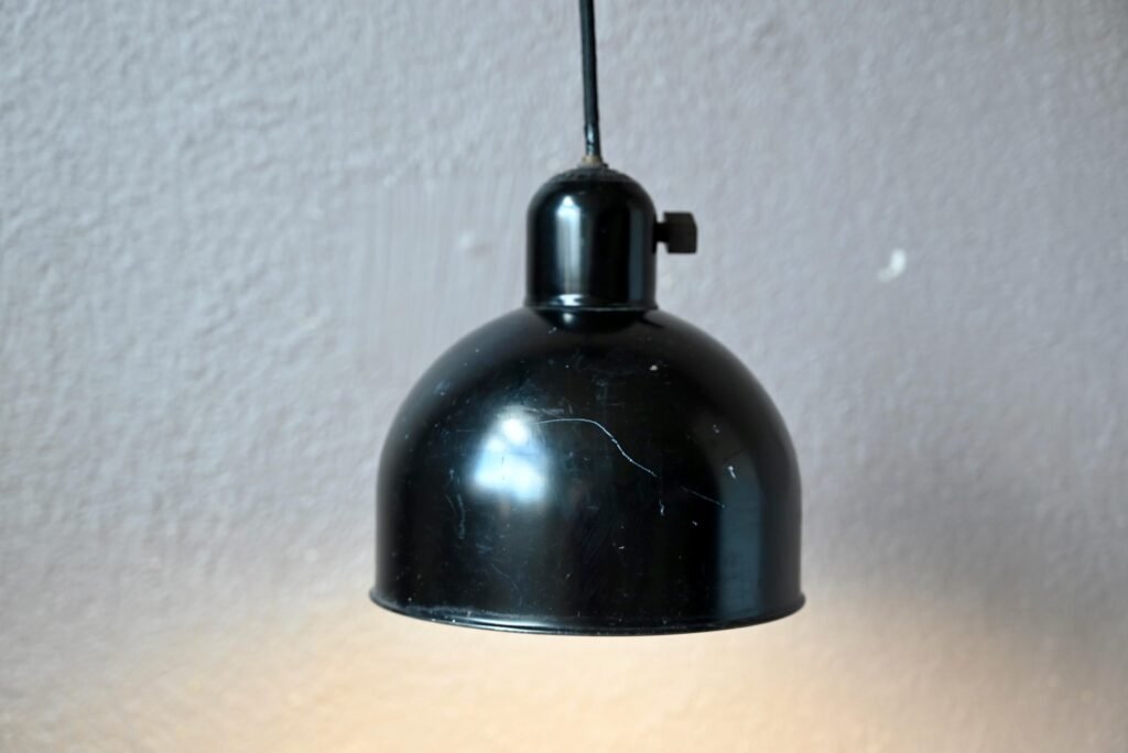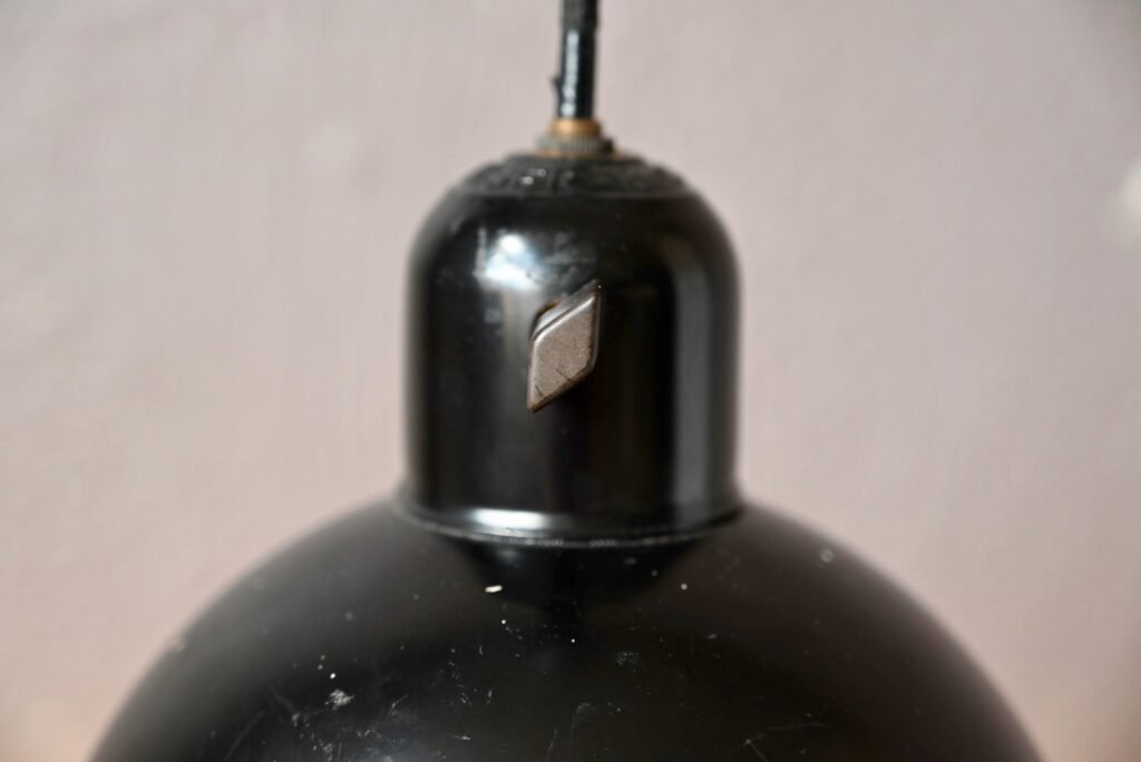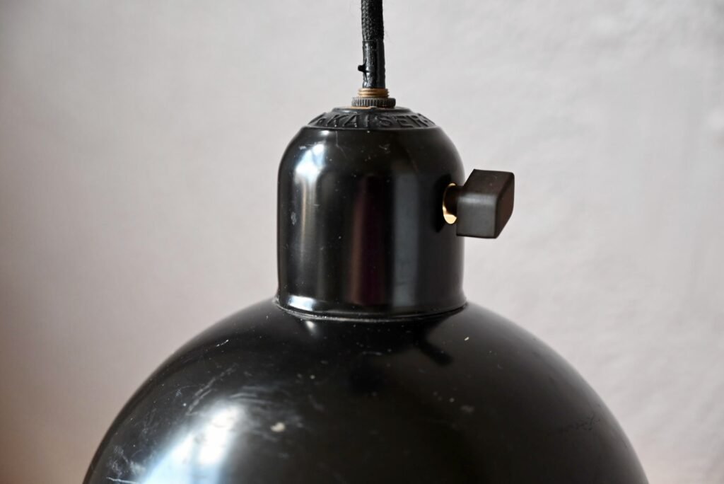 Diseñada por Christian Dell y fabricada y distribuida en la década de 1930 por la empresa Kaiser Idell, esta lámpara de aspecto industrial está totalmente en consonancia con los códigos de producción de los años de la Bauhaus. Su diseño de aspecto sobrio y elegante se basa en la función luminosa, una estética sencilla y eficaz, y la facilidad de producción en serie. Está fabricada en metal fundido con un mínimo de soldaduras. Este ejemplar es una edición original, estampada Kaiser Idell, y en un bello estado de conservación. El dispositivo de ajuste de la altura de la suspensión ya no está operativo. La lámpara dispone siempre de un interruptor giratorio en la parte superior del deflector.