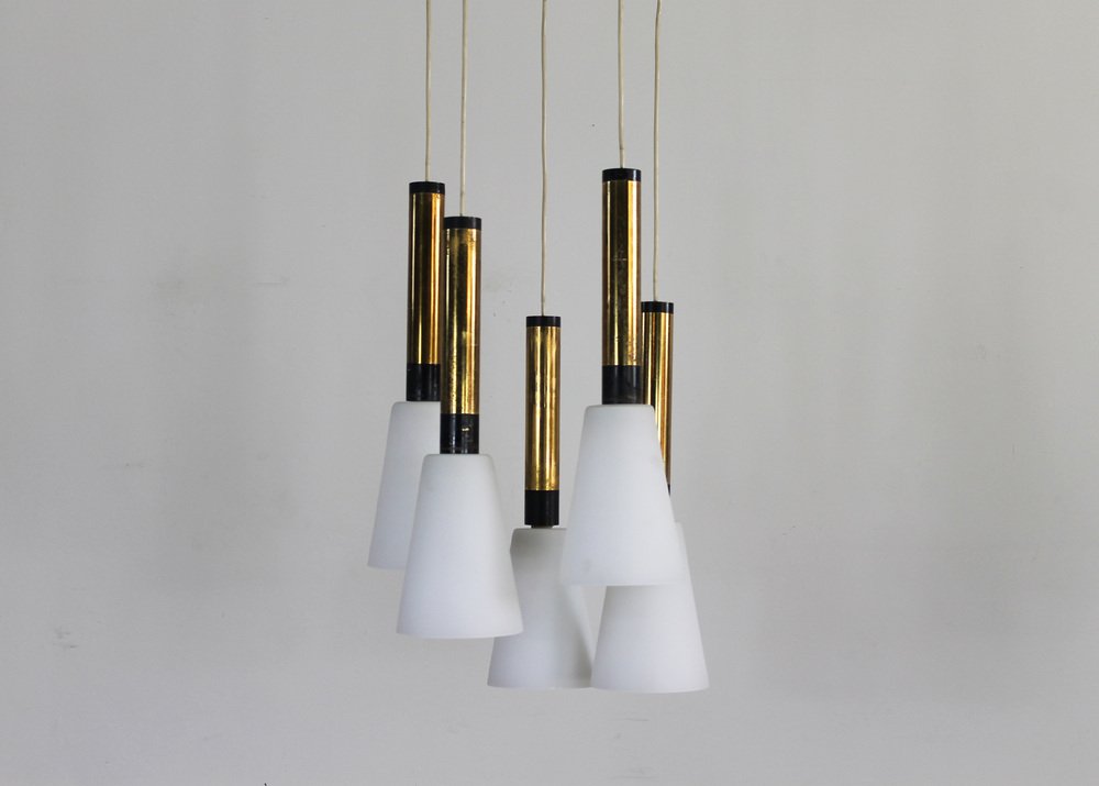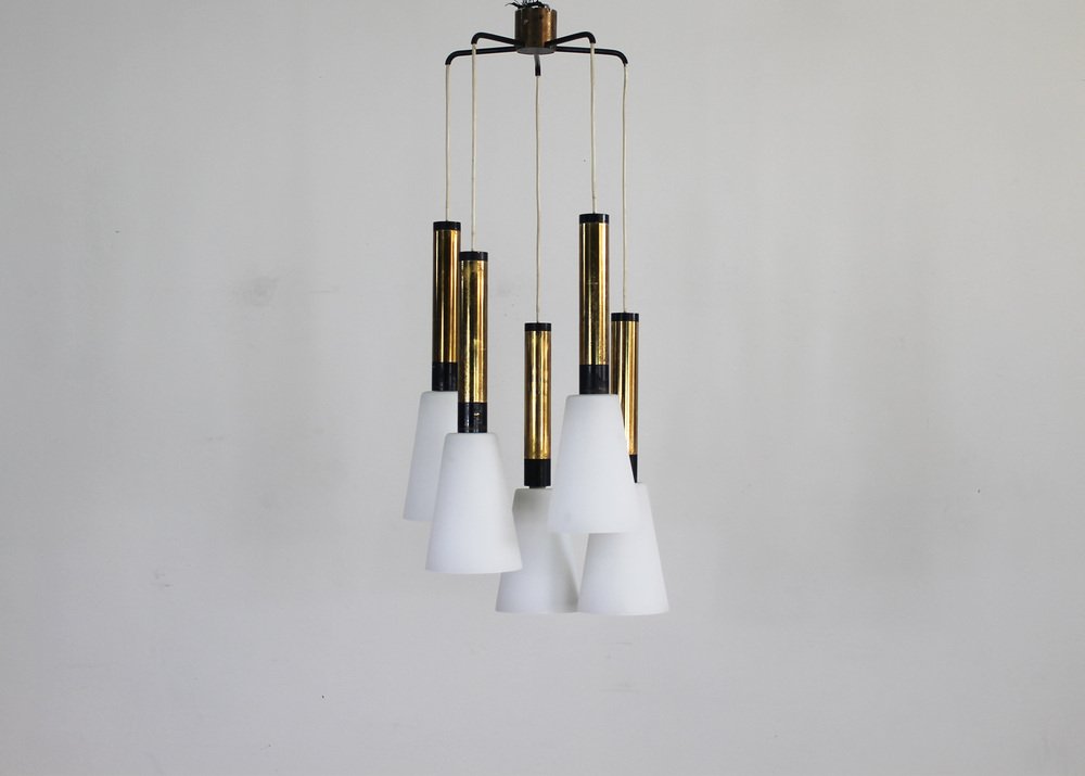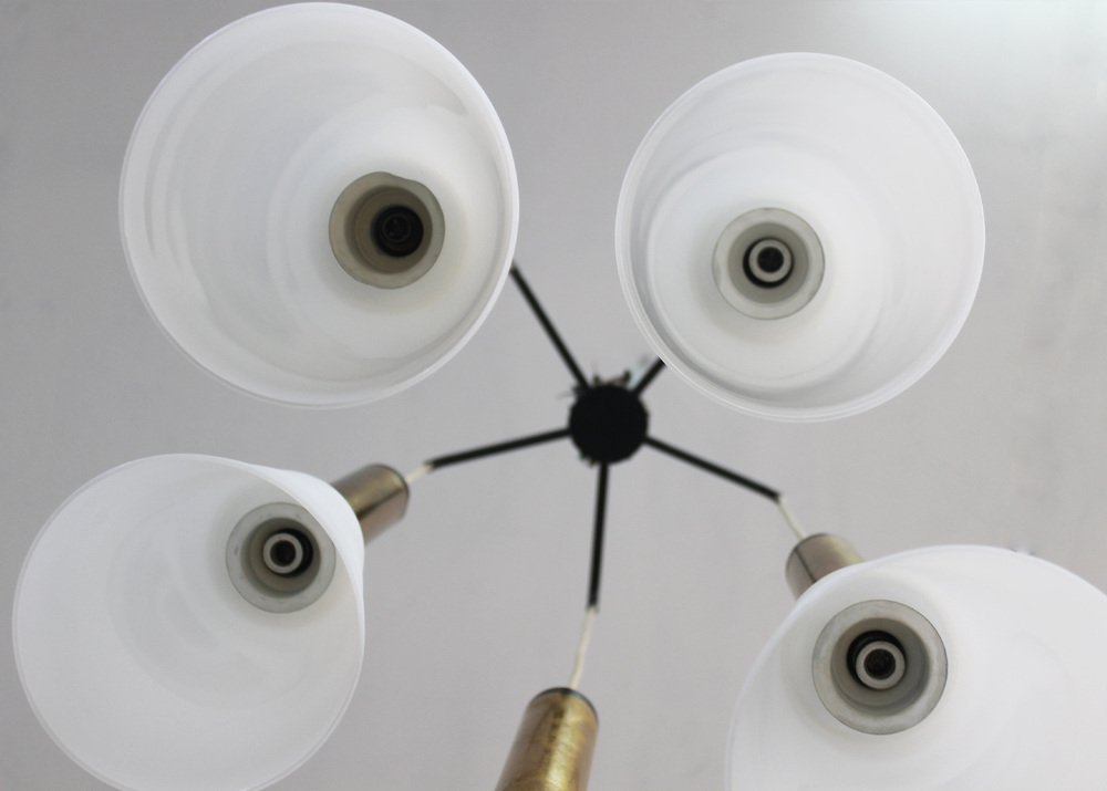 Pendant lamp with structure in lacquered metal and brass and five diffusers in opaline glass.