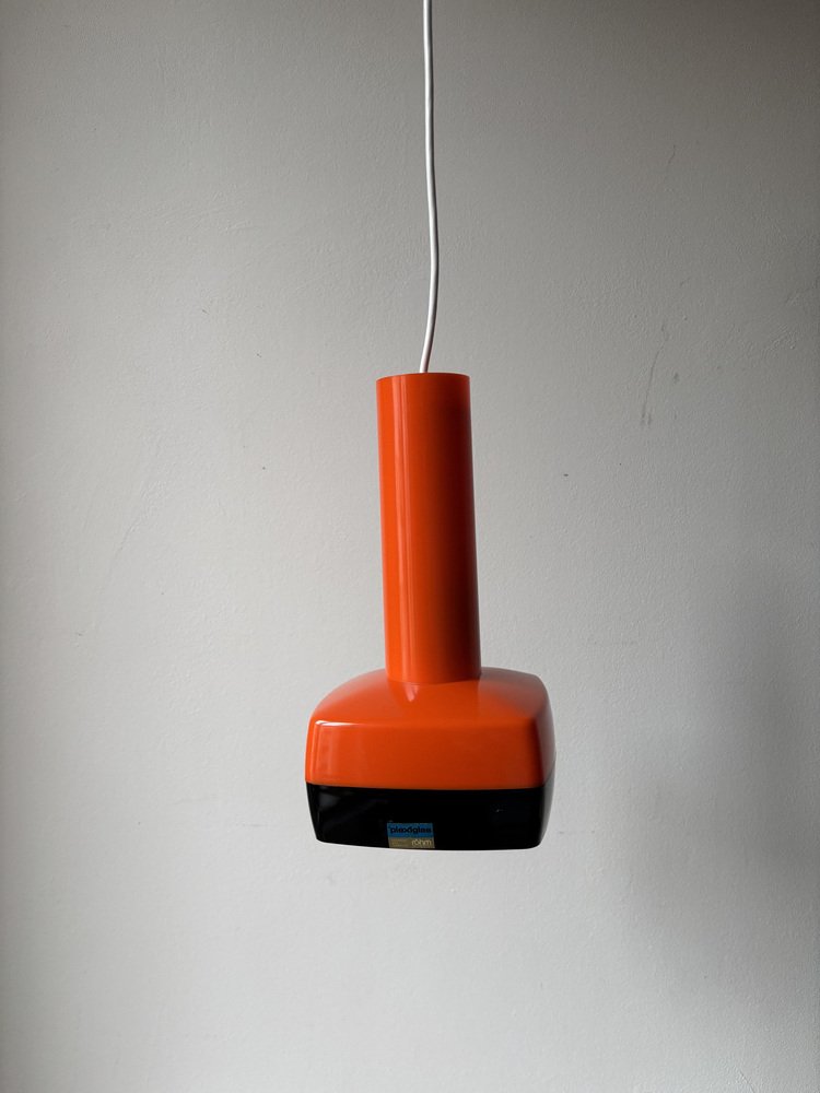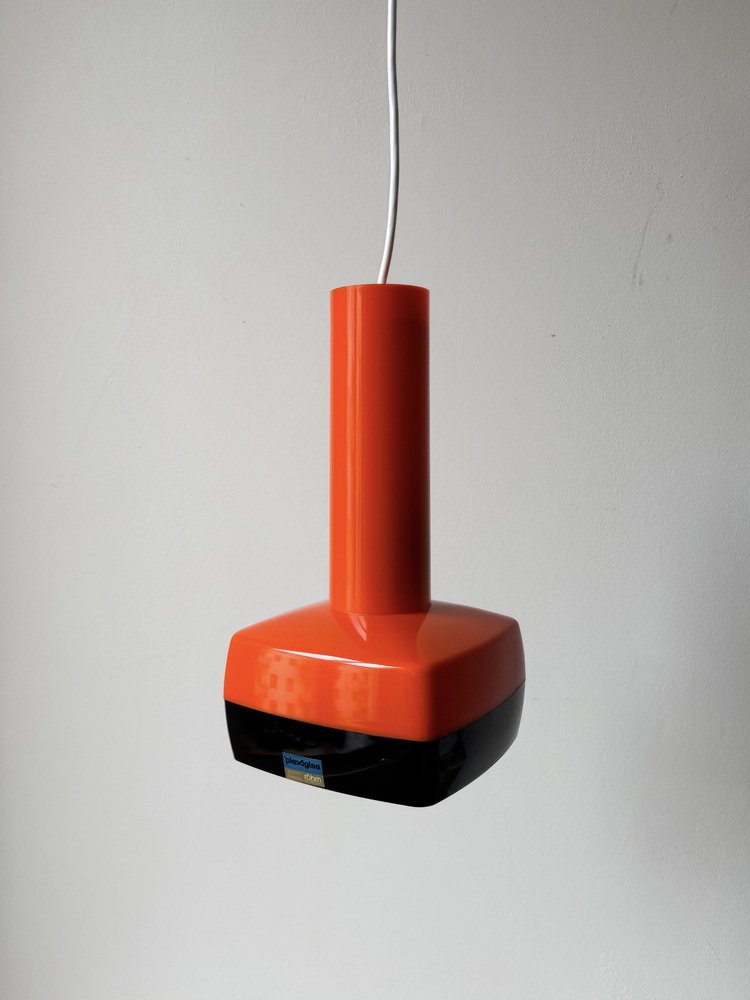 Pair of Cubic Pop Art ceiling torch lights, designed by Bent Karlby for Ask Belysninger (A. Schrøder Kemi) in Denmark during the 1970s. These striking fluorescent pendant lamps in acid orange and black acrylic glass embody the daring spirit of the Pop Art and Space Age eras—vibrant, sculptural, and unapologetically modern. Their geometric forms and vivid color contrast bring a playful yet refined energy to any interior.