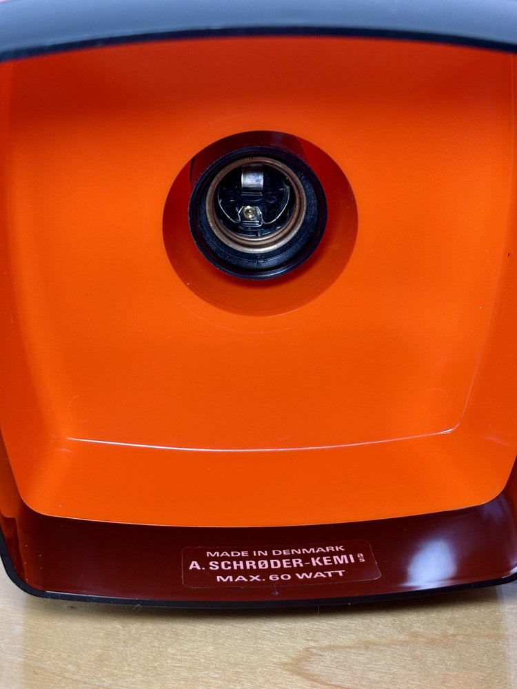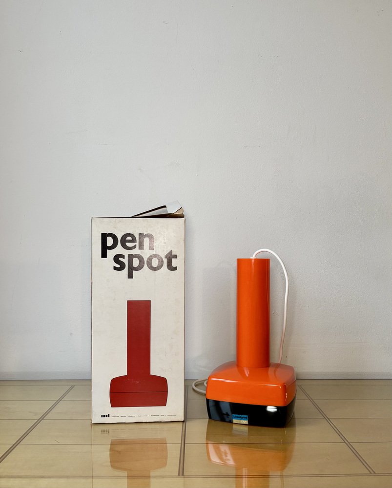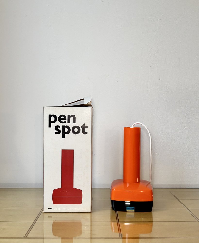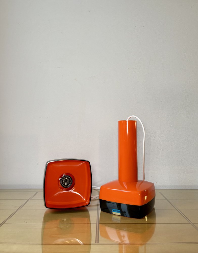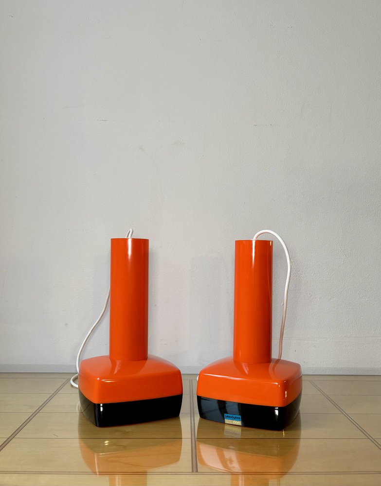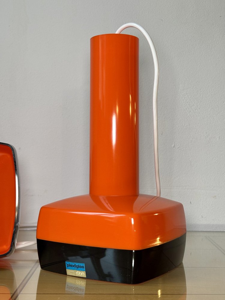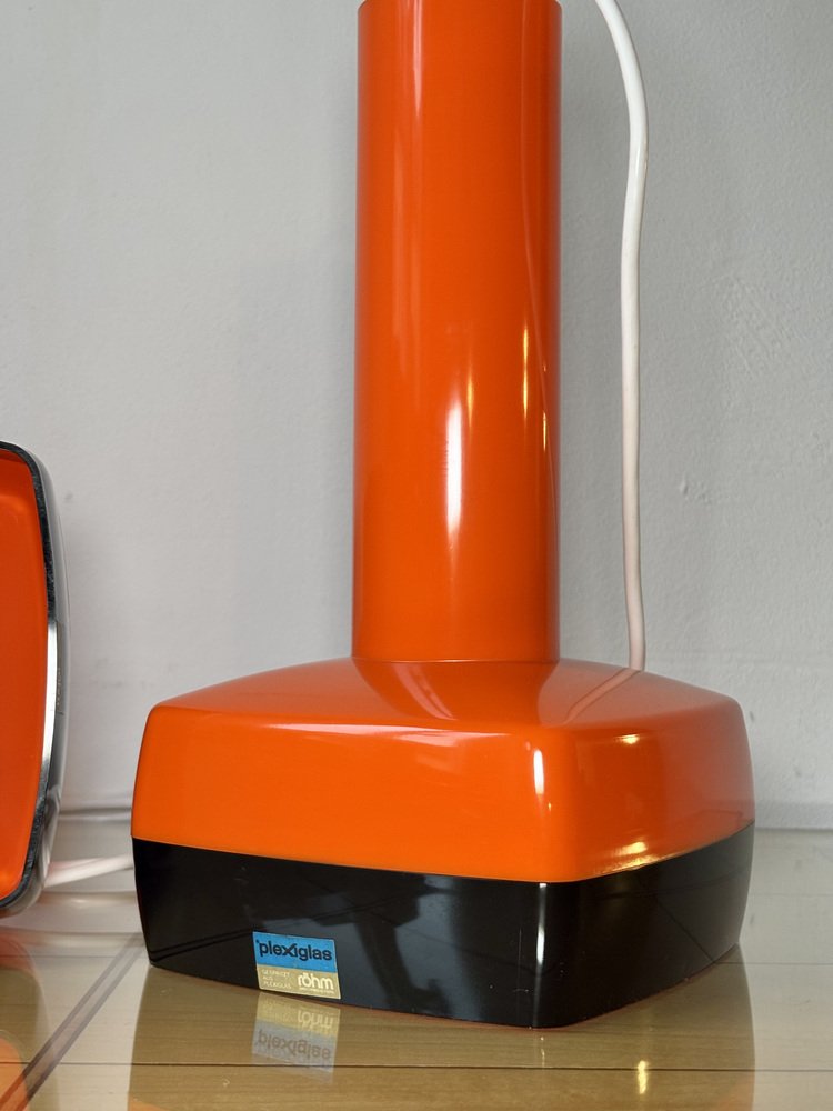 Crafted from high-quality acrylic glass, each lamp features a unique “torch-like” silhouette that diffuses light evenly while adding a dynamic pop of color. The combination of translucent orange and glossy black surfaces creates a captivating glow, ideal for mid-century or contemporary spaces seeking a touch of retro futurism. Despite their age, both lamps remain in well-kept, intact vintage condition, showing only minimal signs of wear. They even come in their original boxes, a rare find for design pieces of this era.