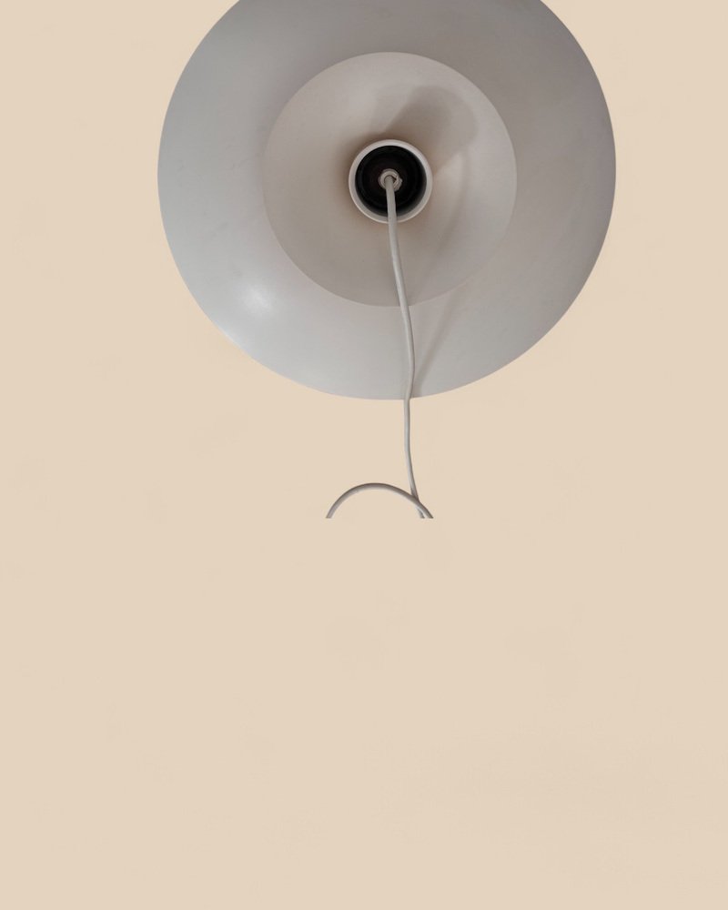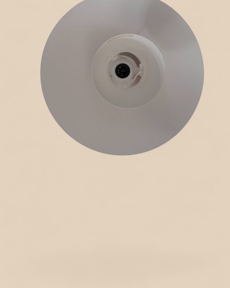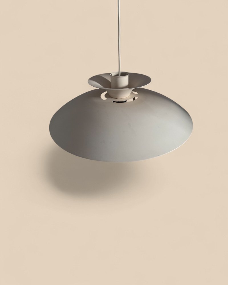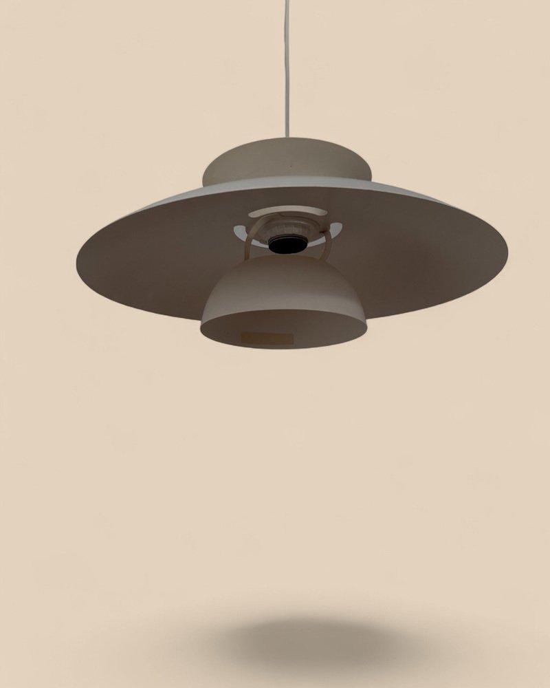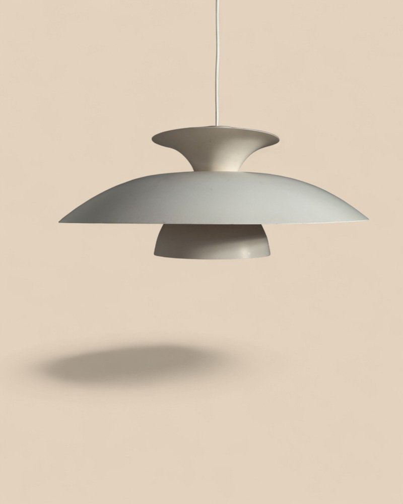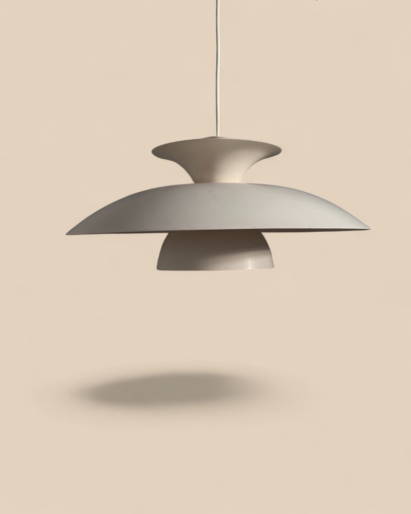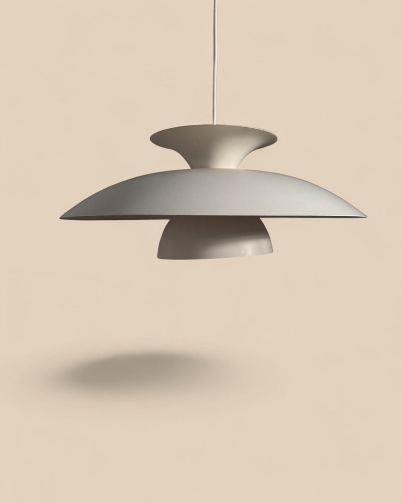 A minimalist Scandinavian pendant lamp made of lacquered metal, featuring a multi-layered shade construction designed to diffuse light evenly and reduce glare.