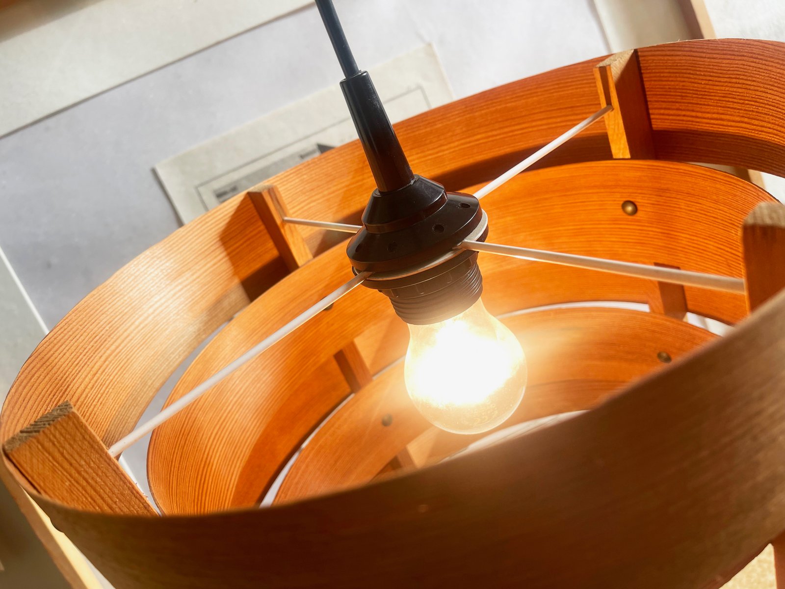 Beautifully designed pendant lamp from wood veneer, Scandinavian, possibly Sweden. 1960s Original.