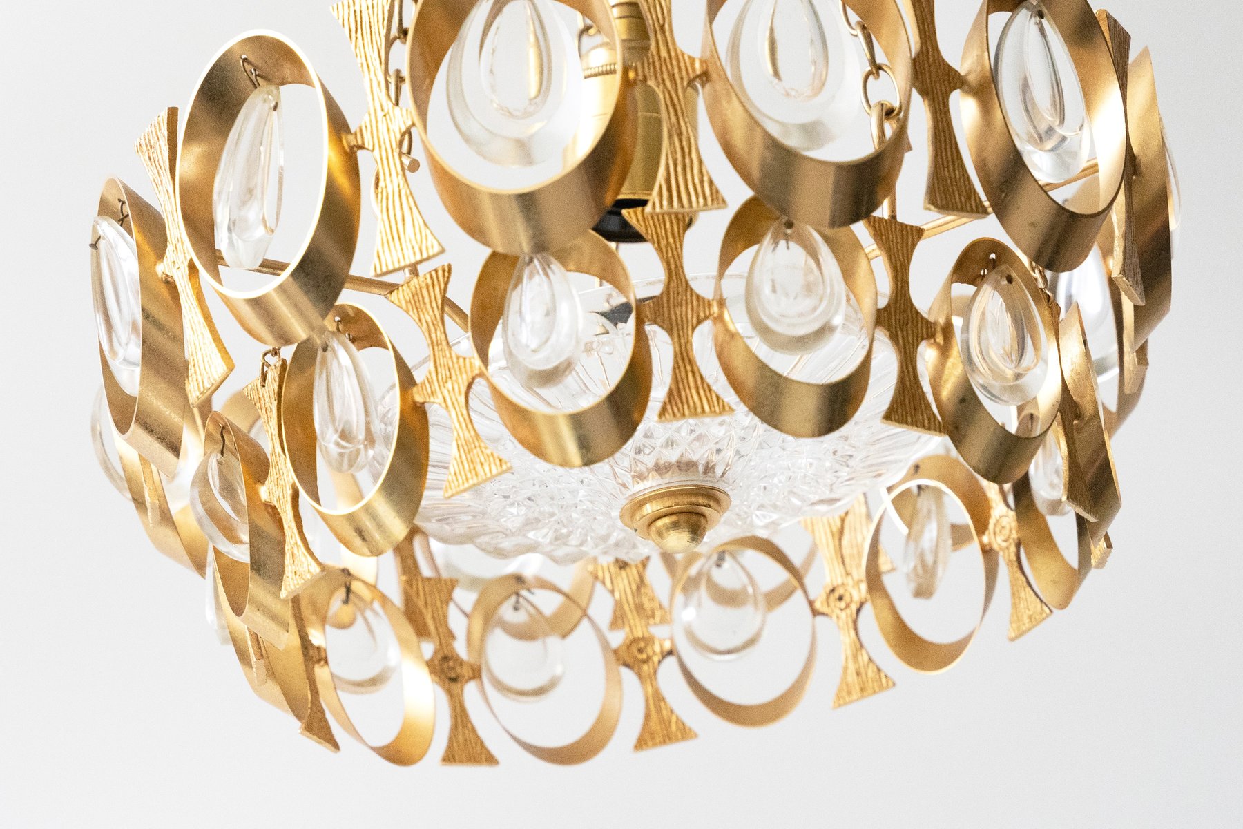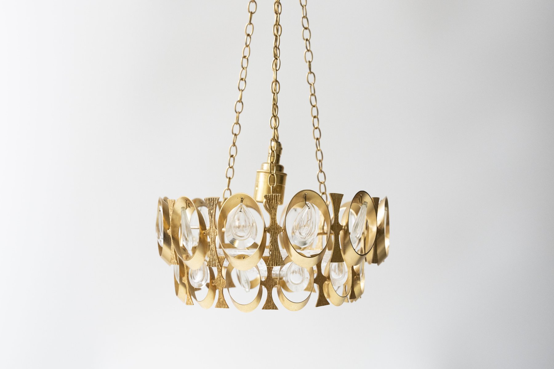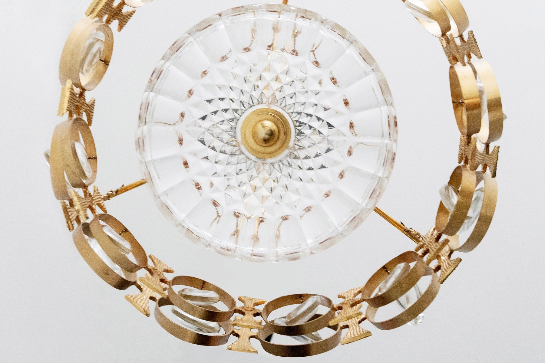 This chandelier exemplifies 20th century elegance and sophistication. Designed with a striking gold-finished base, it features an array of intricate, oval glass elements that reflect light in mesmerizing ways. The harmonious blend of gilded metal and glass creates a captivating visual effect, making it an eye catching piece. Suspended gracefully, this chandelier not only illuminates any space but also enhances the overall aesthetic, serving as a focal point in dining areas, living rooms, or entryways. A perfect choice for those seeking to elevate their home with timeless and luxurious design. It is in excellent vintage condition.