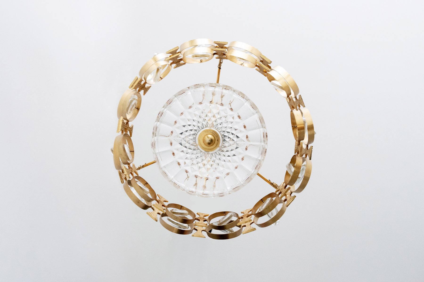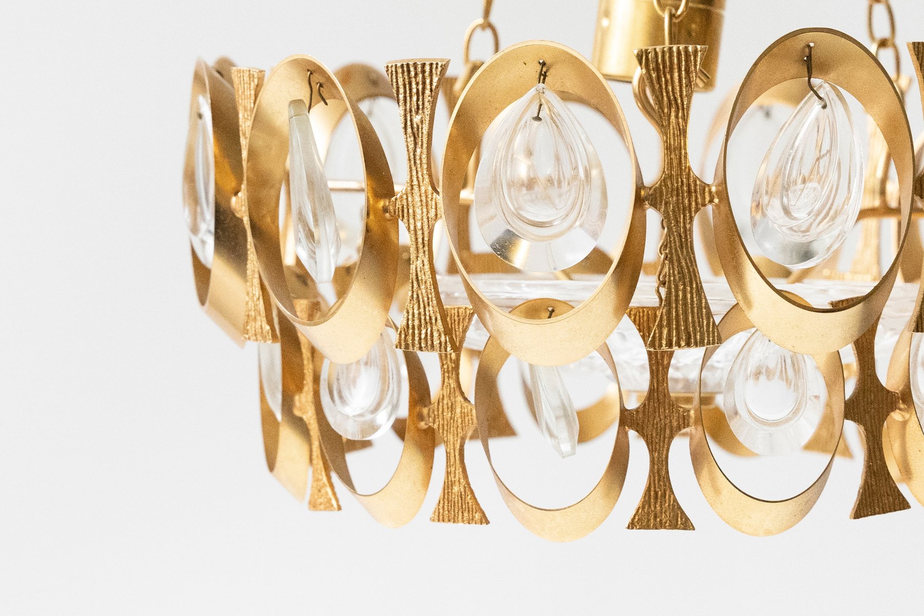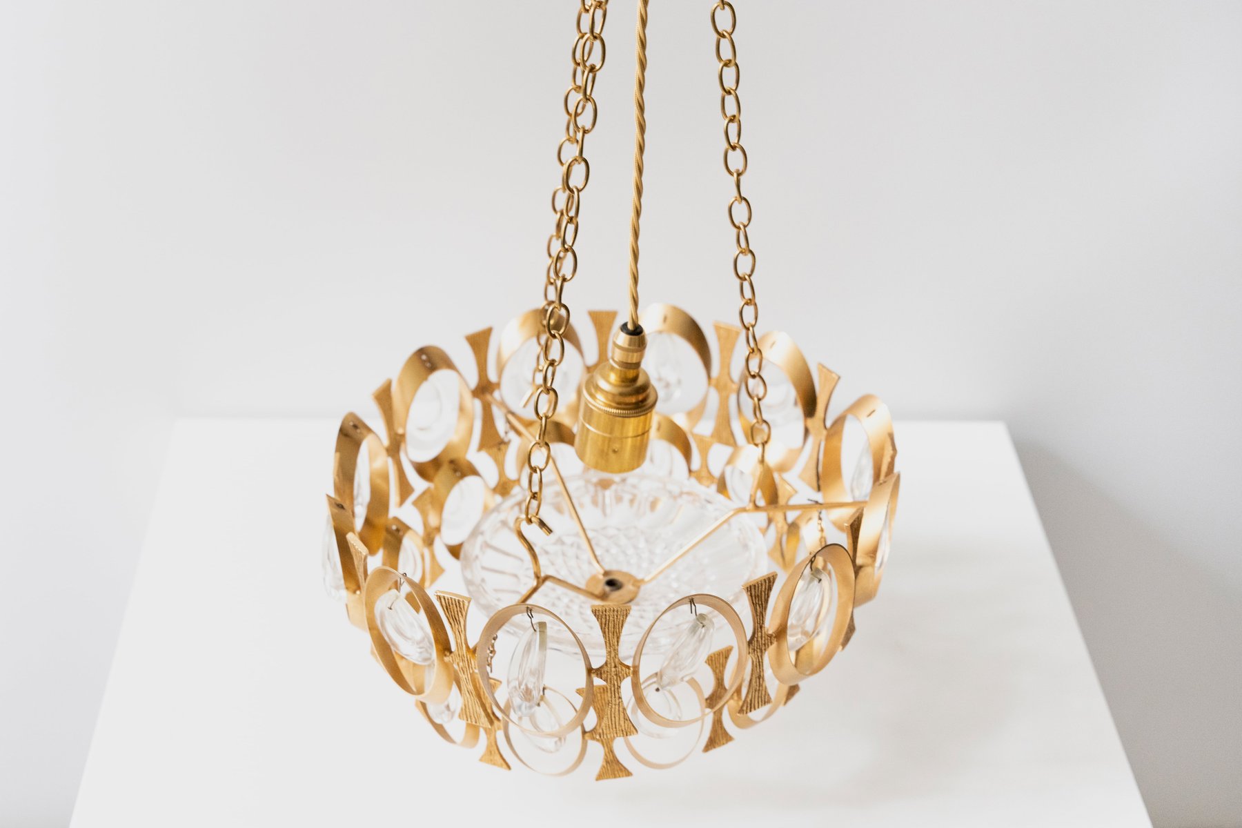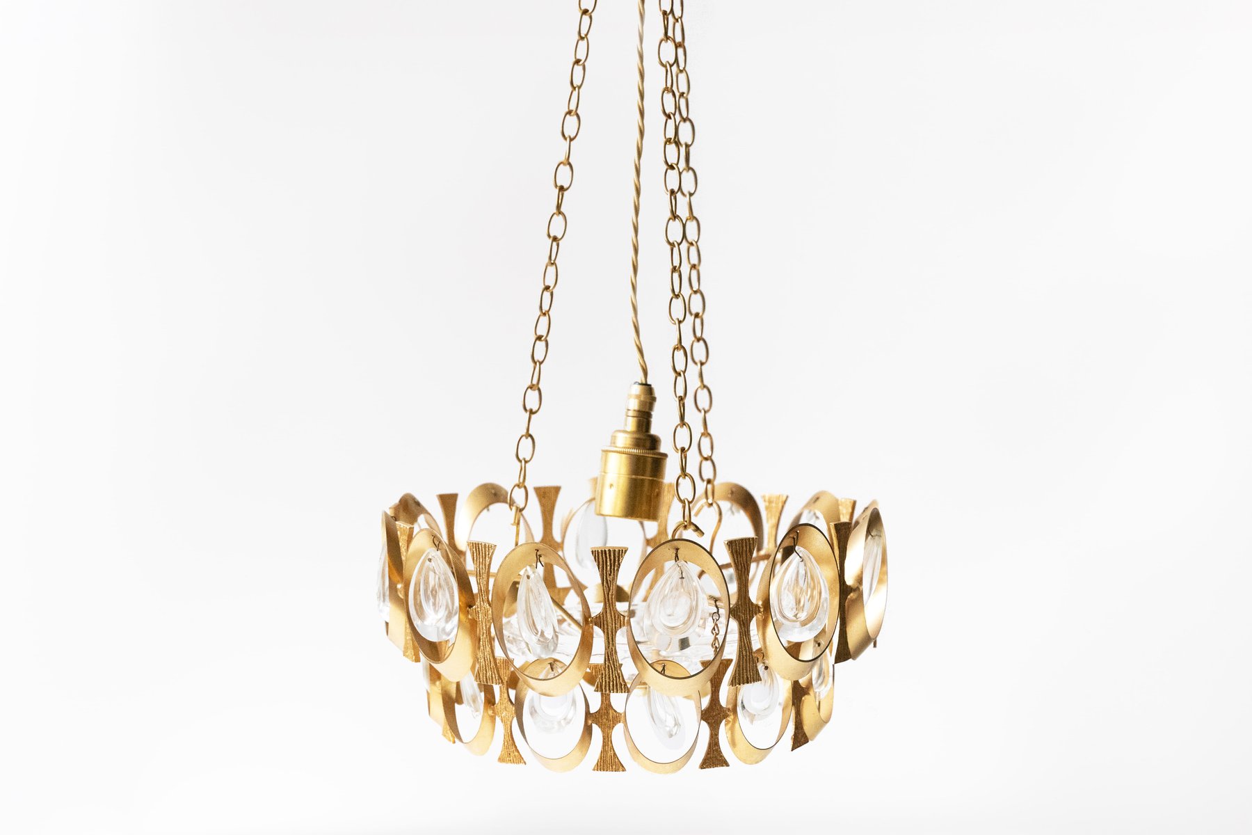 This chandelier exemplifies 20th century elegance and sophistication. Designed with a striking gold-finished base, it features an array of intricate, oval glass elements that reflect light in mesmerizing ways. The harmonious blend of gilded metal and glass creates a captivating visual effect, making it an eye catching piece. Suspended gracefully, this chandelier not only illuminates any space but also enhances the overall aesthetic, serving as a focal point in dining areas, living rooms, or entryways. A perfect choice for those seeking to elevate their home with timeless and luxurious design. It is in excellent vintage condition.