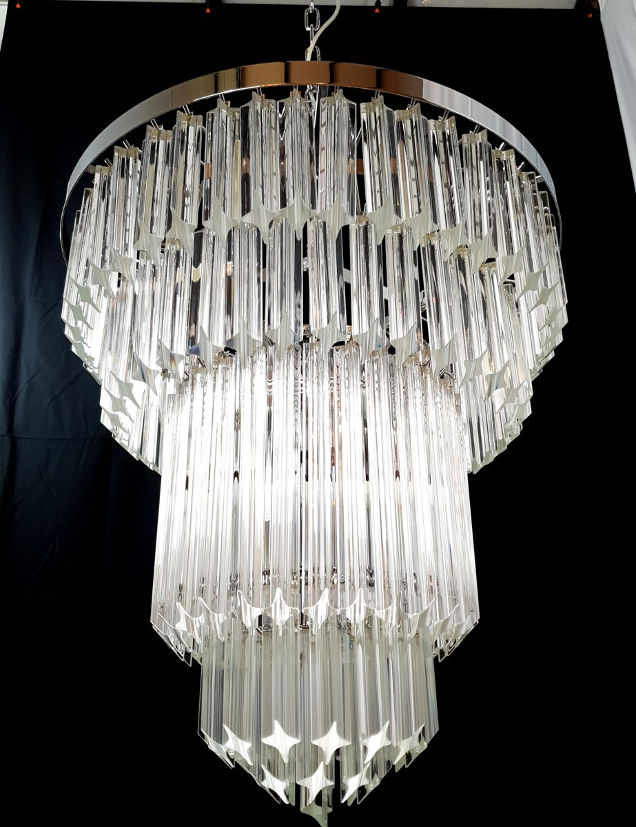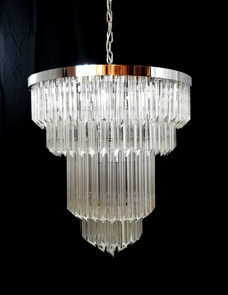 Vintage Murano chandelier, Venini style, 1970s. Beautiful, textured chandelier with handmade Murano glass prisms and crystal quadrihedrons. with an antique feel but a contemporary touch, it easily fits into modern settings, featuring the characteristic shape we call "Pyramid" here in Venice. The chandelier measures 58 cm in diameter and 65 cm in height, and features a polished chrome finish. Handcrafted Murano glass prisms and crystal quadrihedrons. Very bright, dramatic, and elegant. This chandelier was created and produced by our master glassmakers in our factory. Designed and made in Venice, Italy.