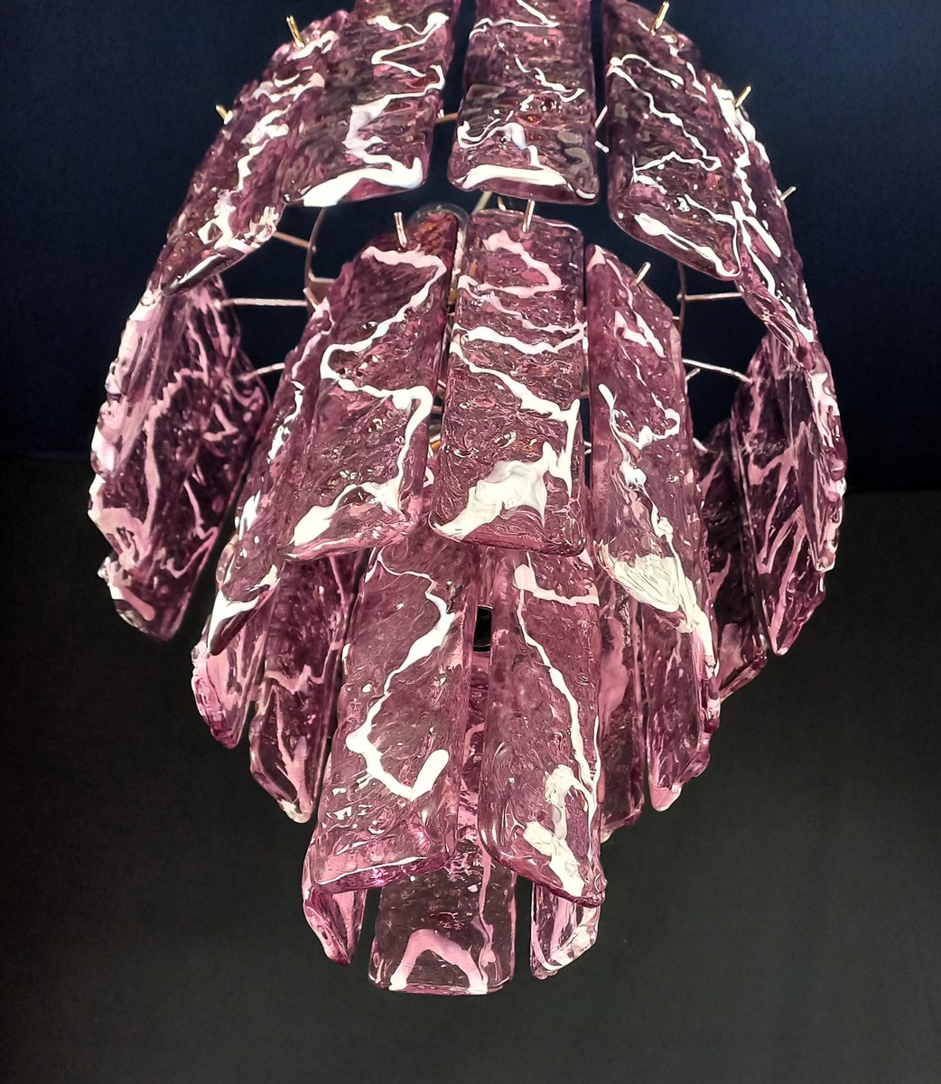 Vintage Murano chandelier Murrina art deco style, 90s. Colorful and cheerful chandelier suitable for any type of room, and also perfect to be combined with other chandeliers of the same line. It is made up of three levels of hammered glass strips, in amethyst colored crystal with a white core, very particular and worked with a texture that gives ripples and plays of light. This chandelier has n. 35 Murano glass strips, handmade. Polished chrome finish. Fills your rooms and homes with elegance and refinement. This chandelier has a diameter of 40 cm. and a height of 48 cm. It has n. 4 E14 lights. This chandelier was created and produced by our Masters, in our company.