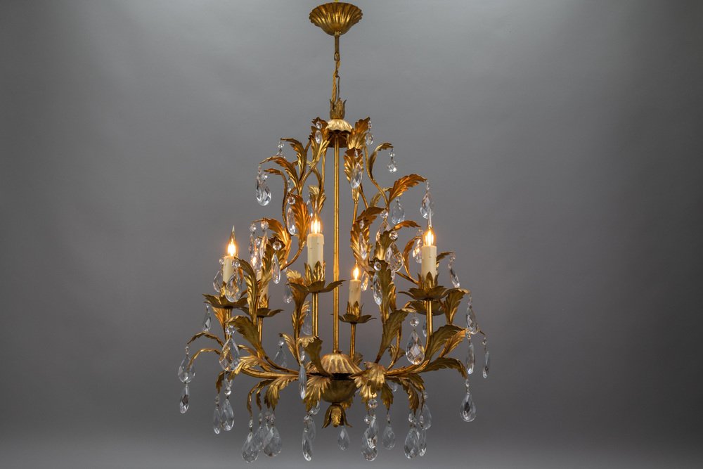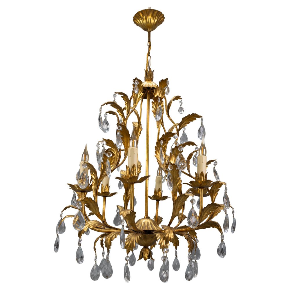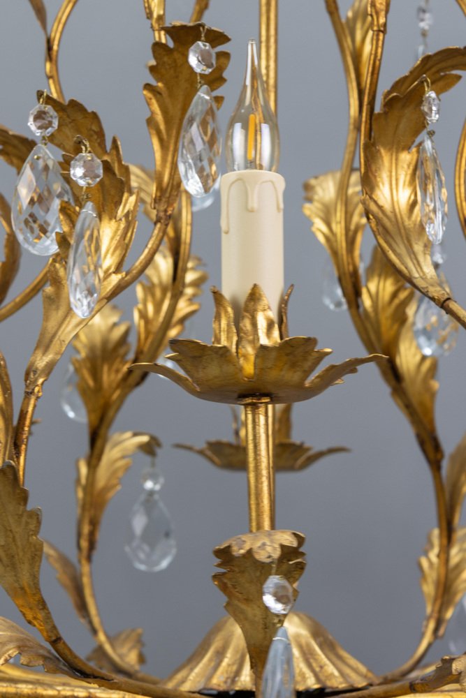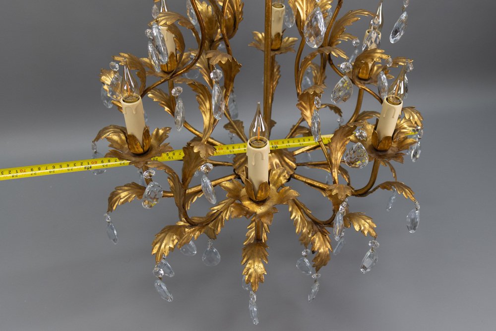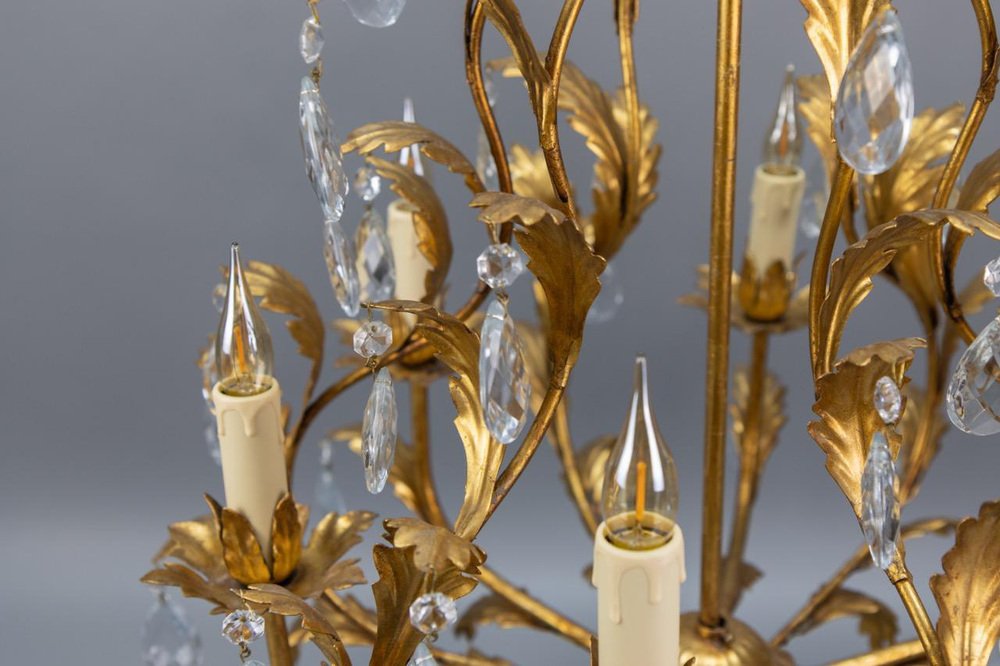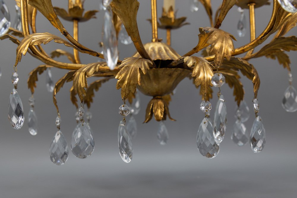An elegant Hollywood Regency–style chandelier made in Italy circa 1970s, featuring a gilt metal frame with intricate foliate detailing and cascading crystal glass pendants.