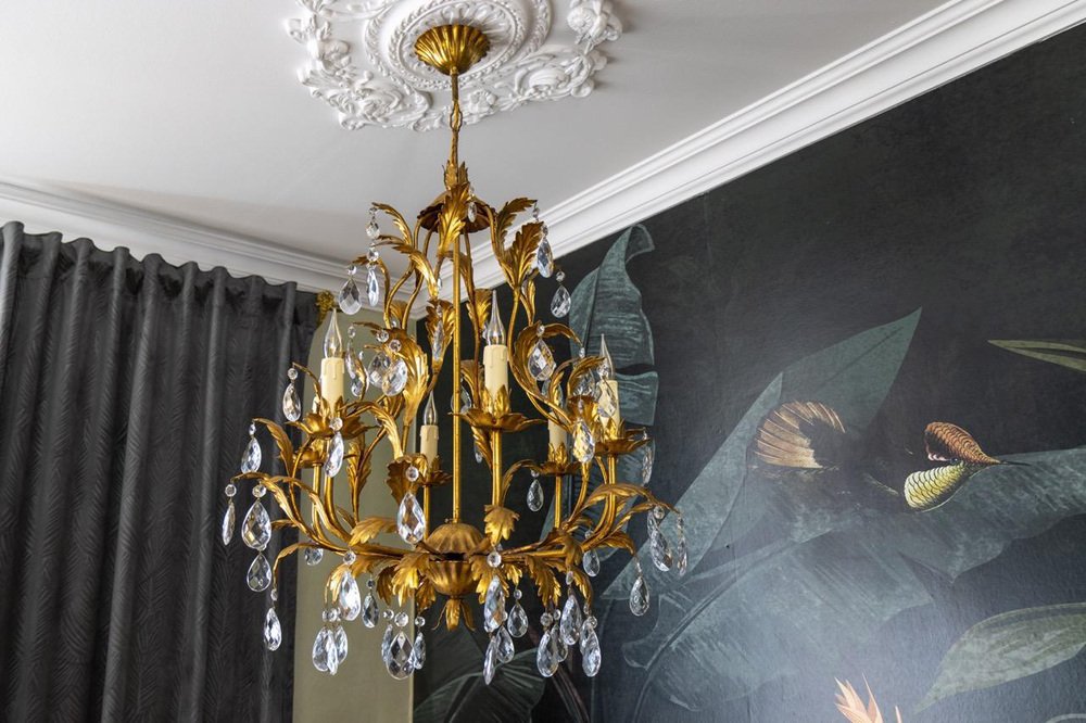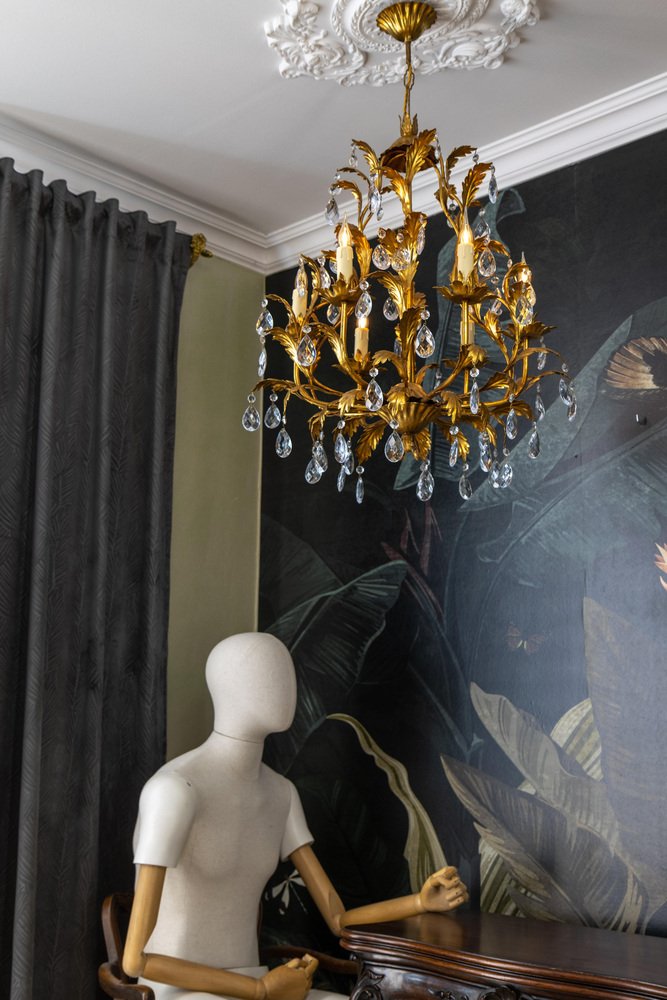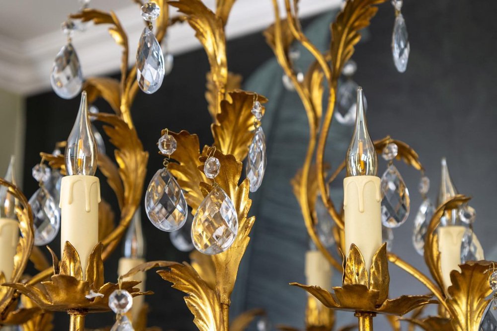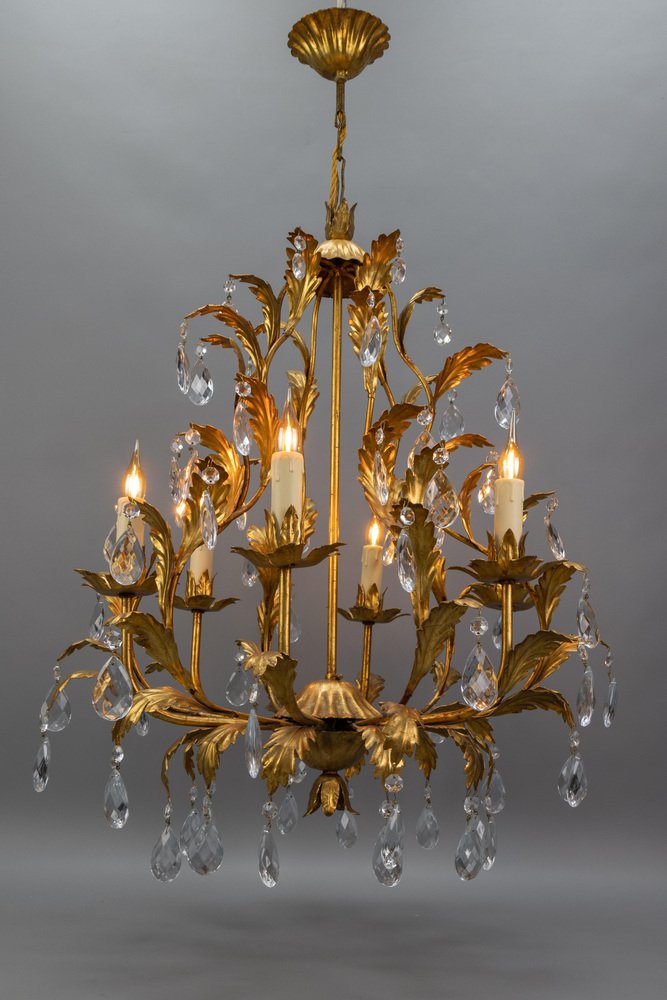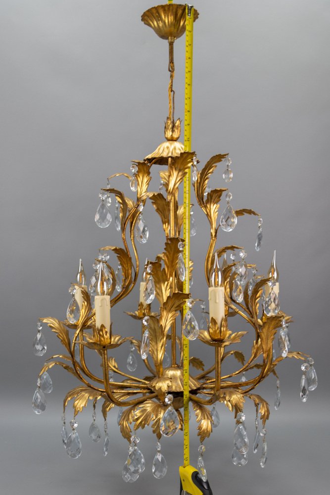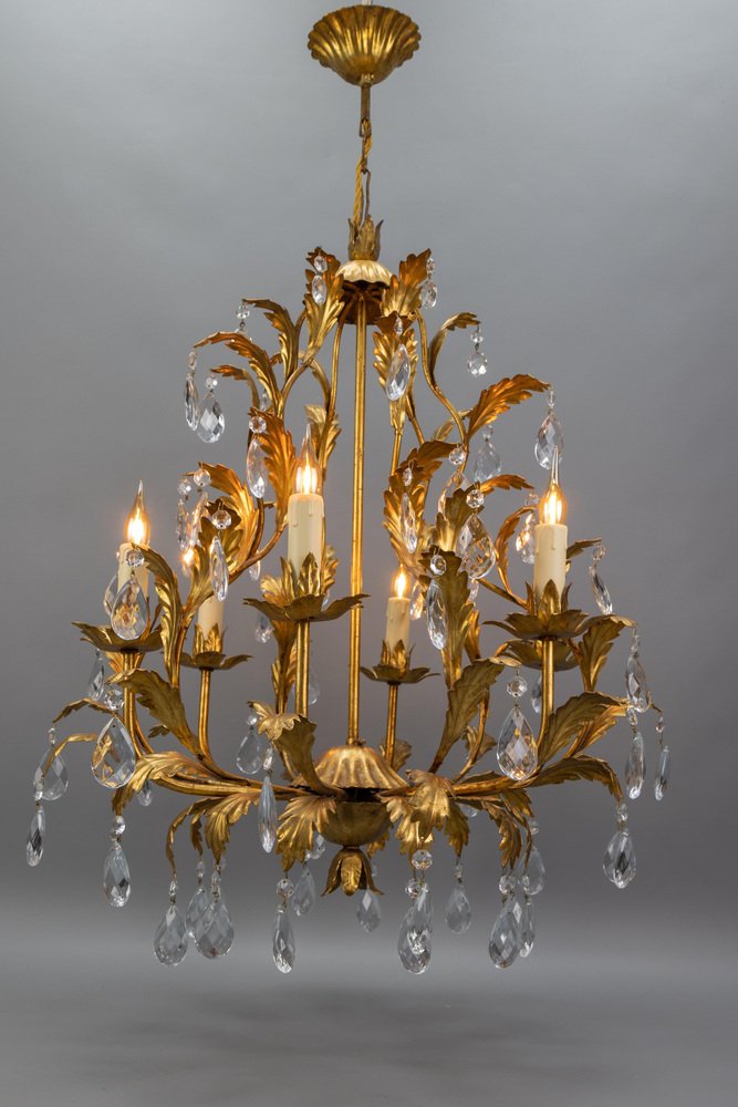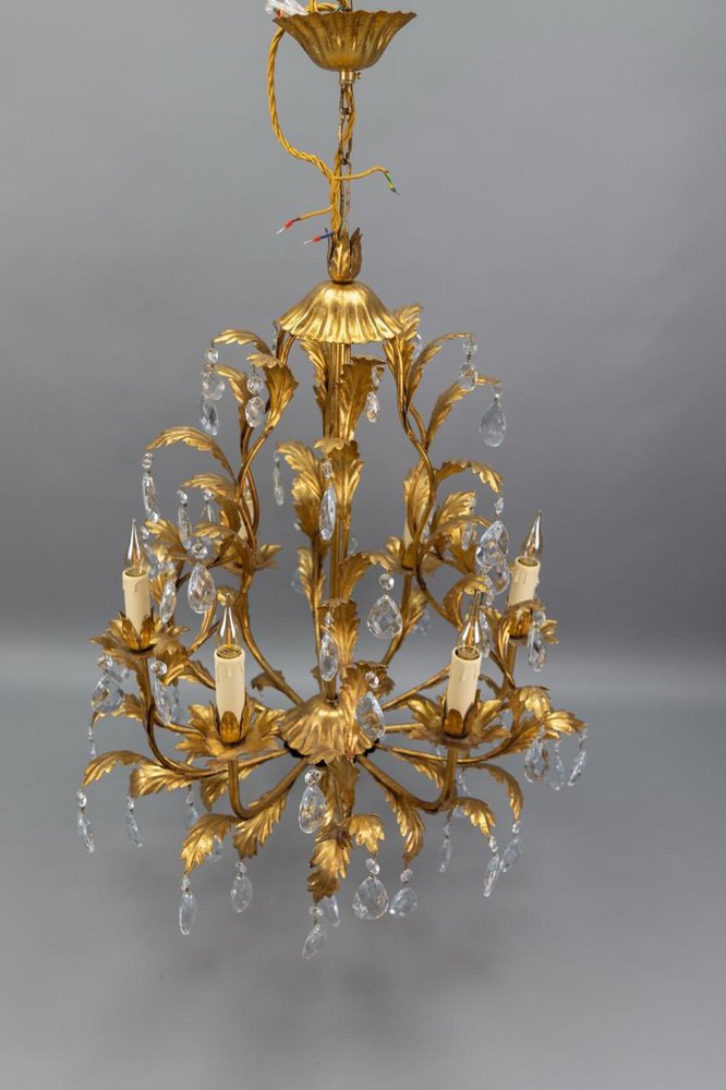 An elegant Hollywood Regency–style chandelier made in Italy circa 1970s, featuring a gilt metal frame with intricate foliate detailing and cascading crystal glass pendants.