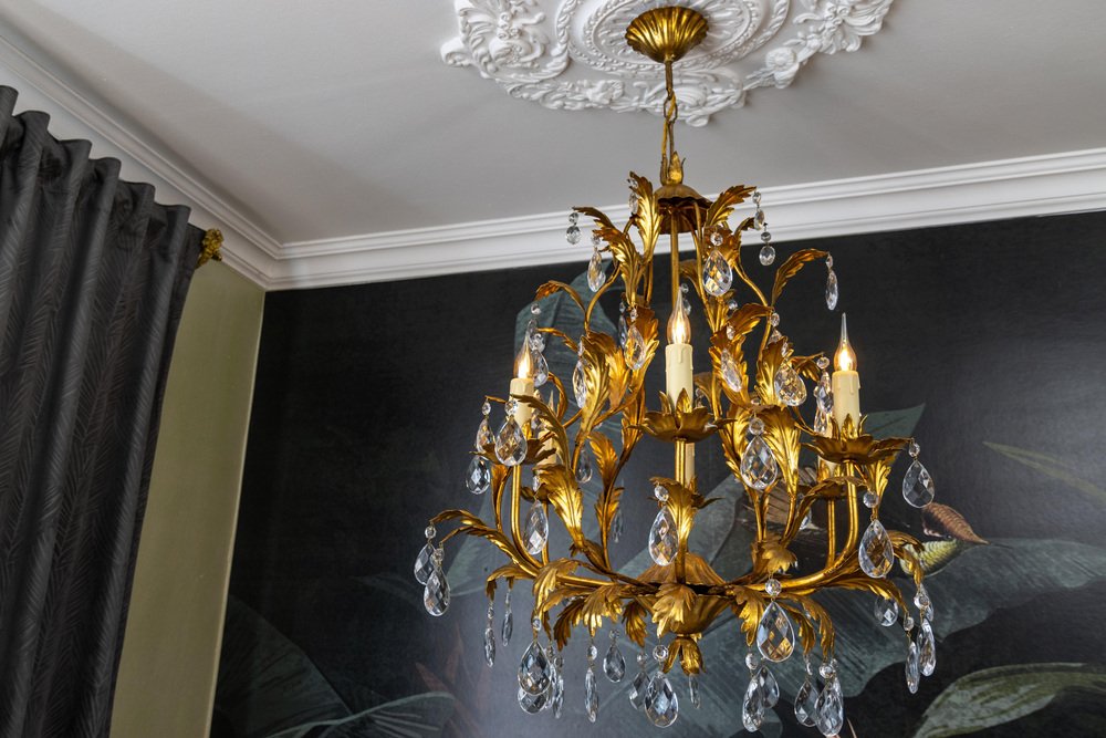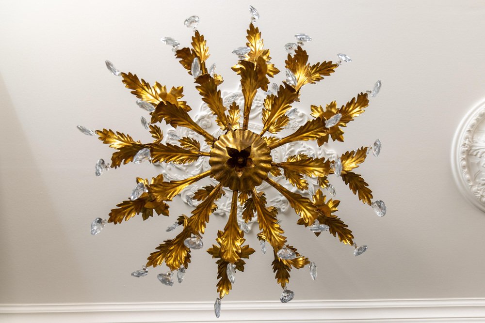 El cálido acabado dorado contrasta maravillosamente con las brillantes gotas de cristal, creando una mezcla atemporal de glamour y sofisticación característica del estilo Hollywood Regency.