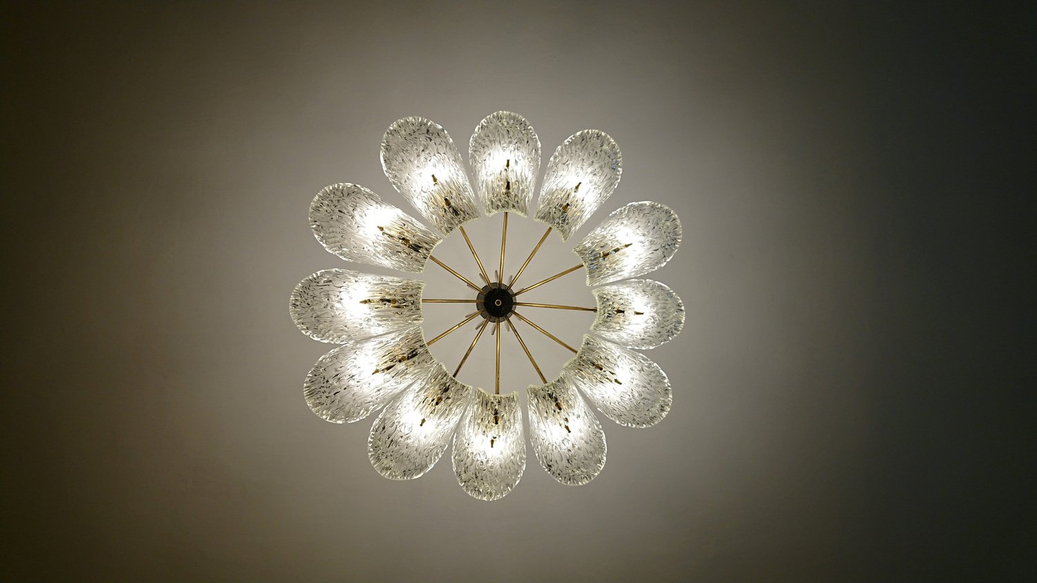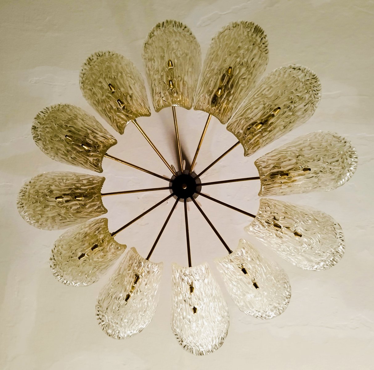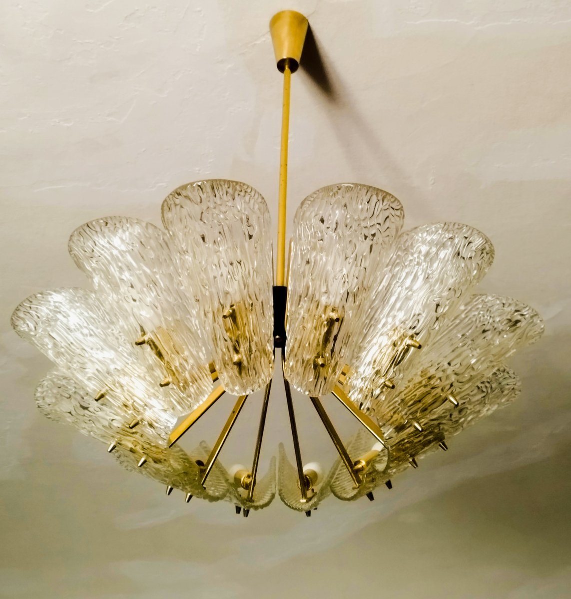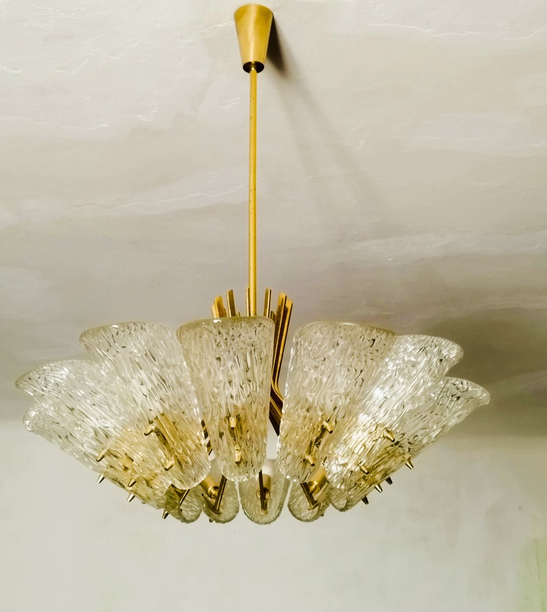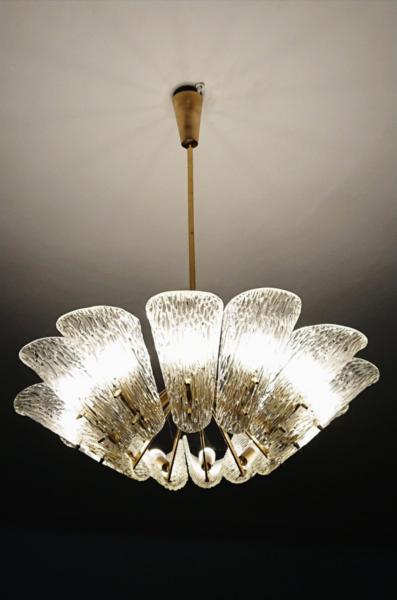 Presenting a large charming brass chandelier attributed to J.T. Kalmar of Vienna, Austria, crafted in the 1960's. This beautiful piece features twelve elegantly spoon-shaped, textured ice glass lampshades gracefully suspended from brass hardware. The chandelier is in good condition, displaying a nice patina. Dimensions: Height without the steam is 45 cm, diameter is 80 cm, and total height including the steam is 95 cm.
