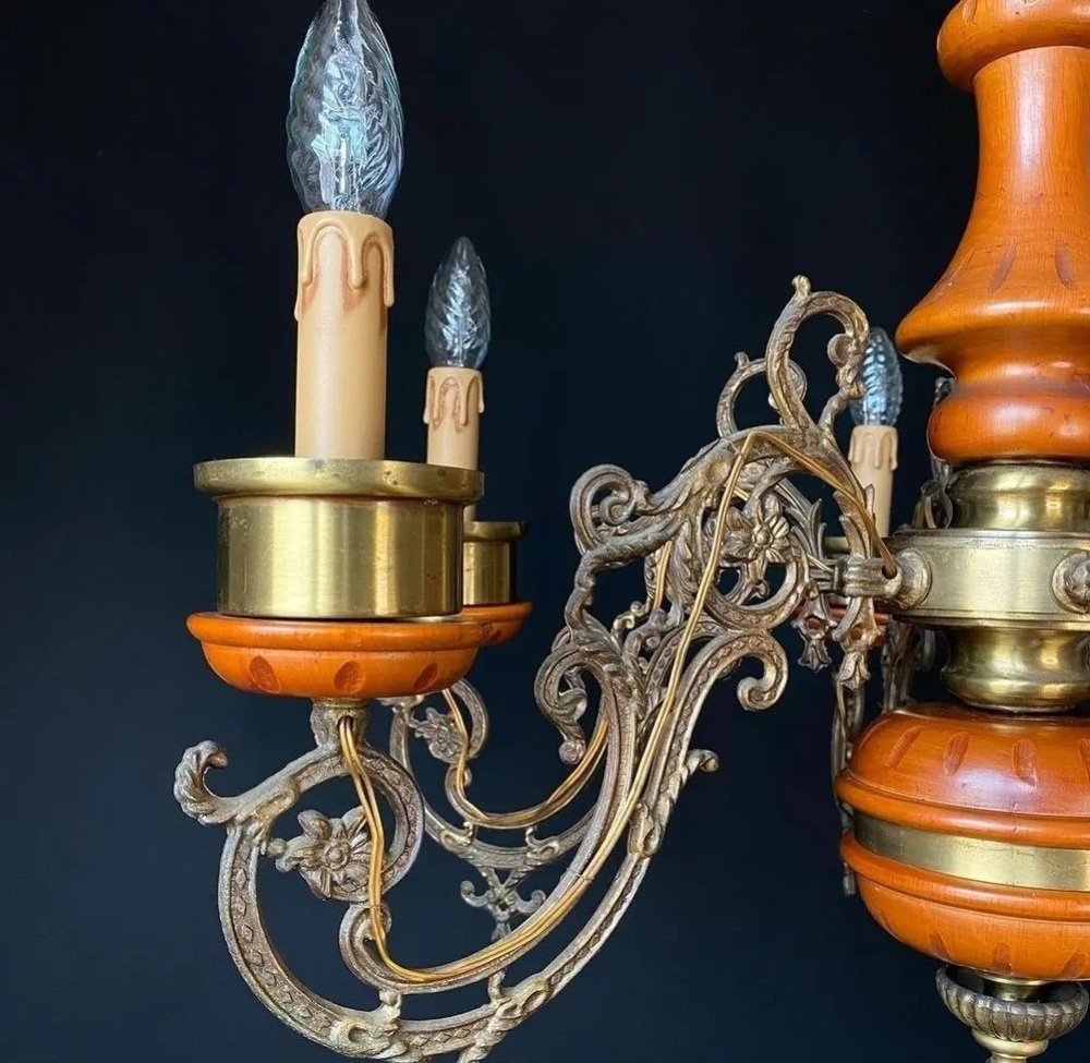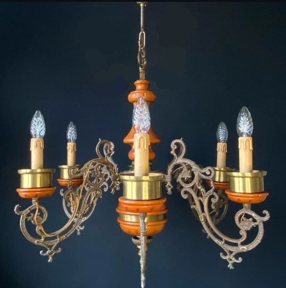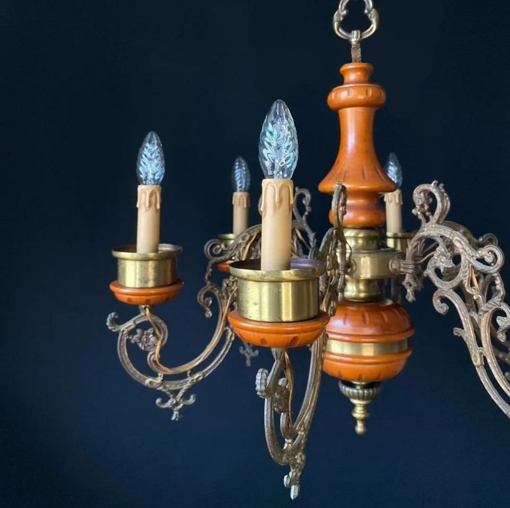 Lámpara de araña italiana antigua de madera y latón, años 50