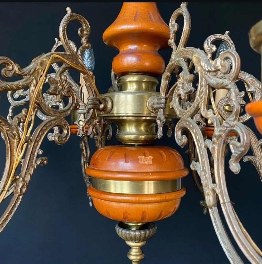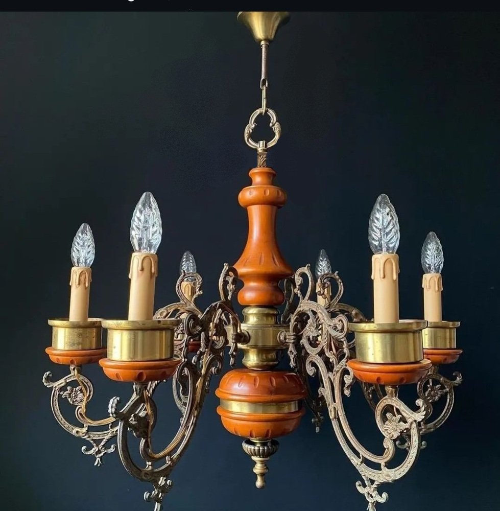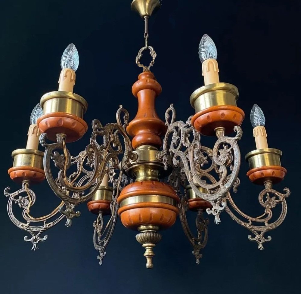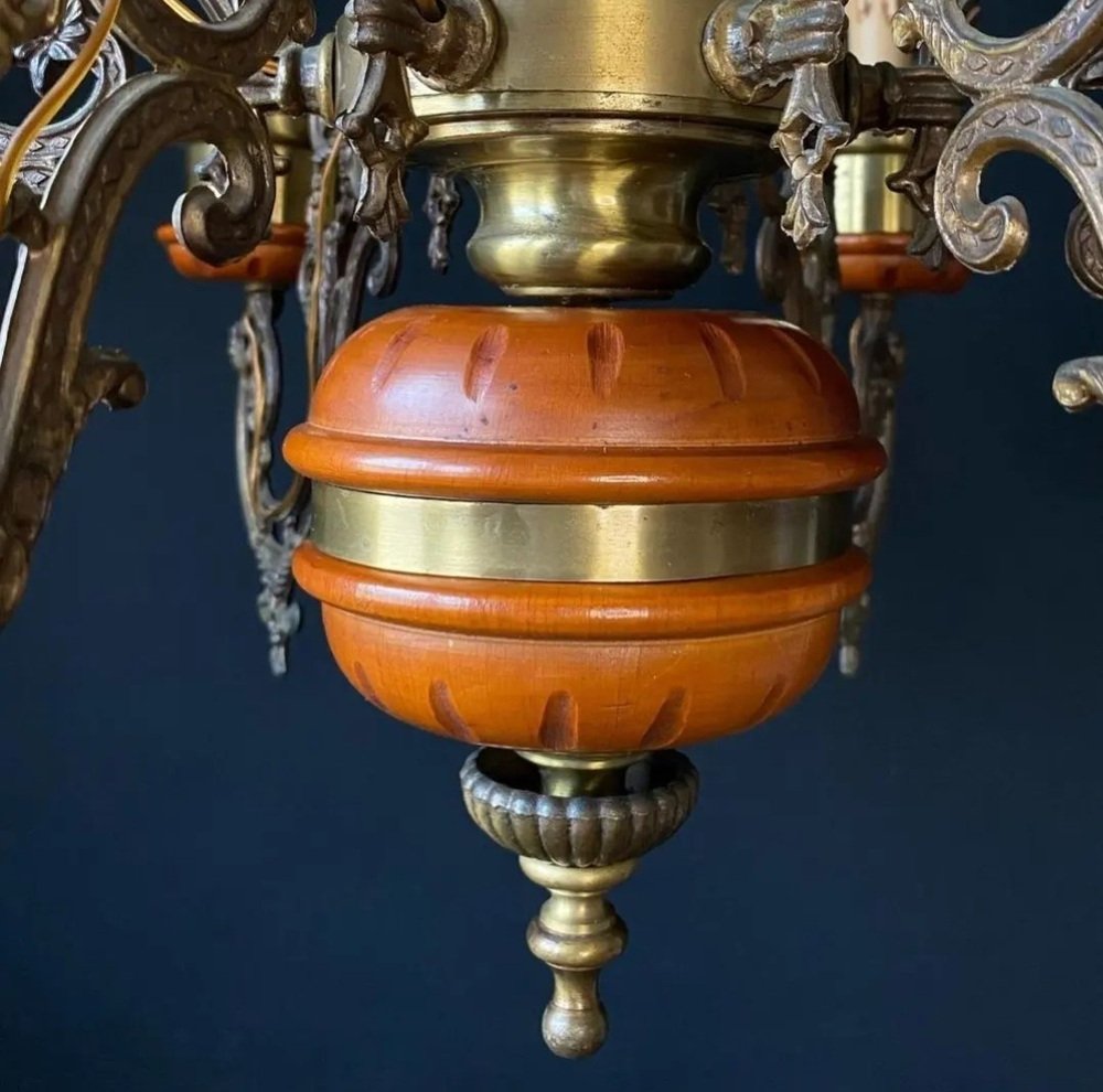 Lámpara de araña italiana antigua de madera y latón, años 50