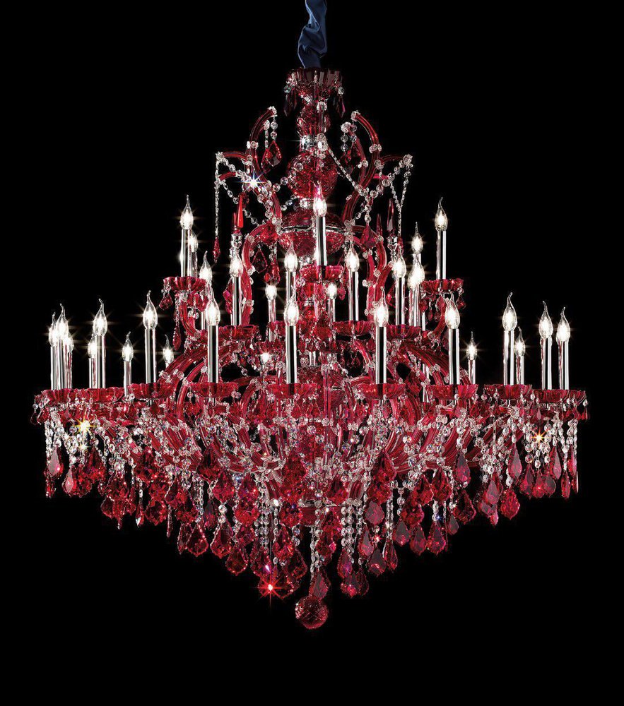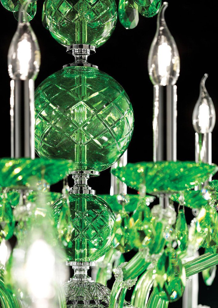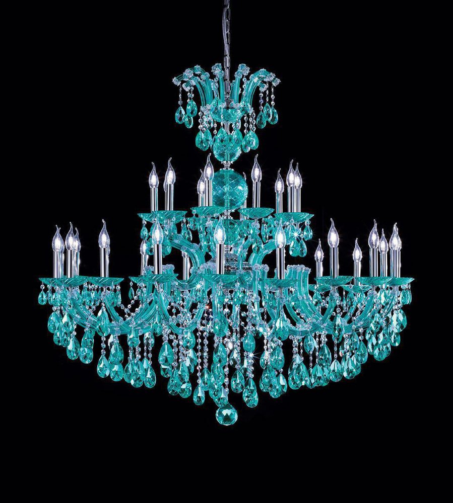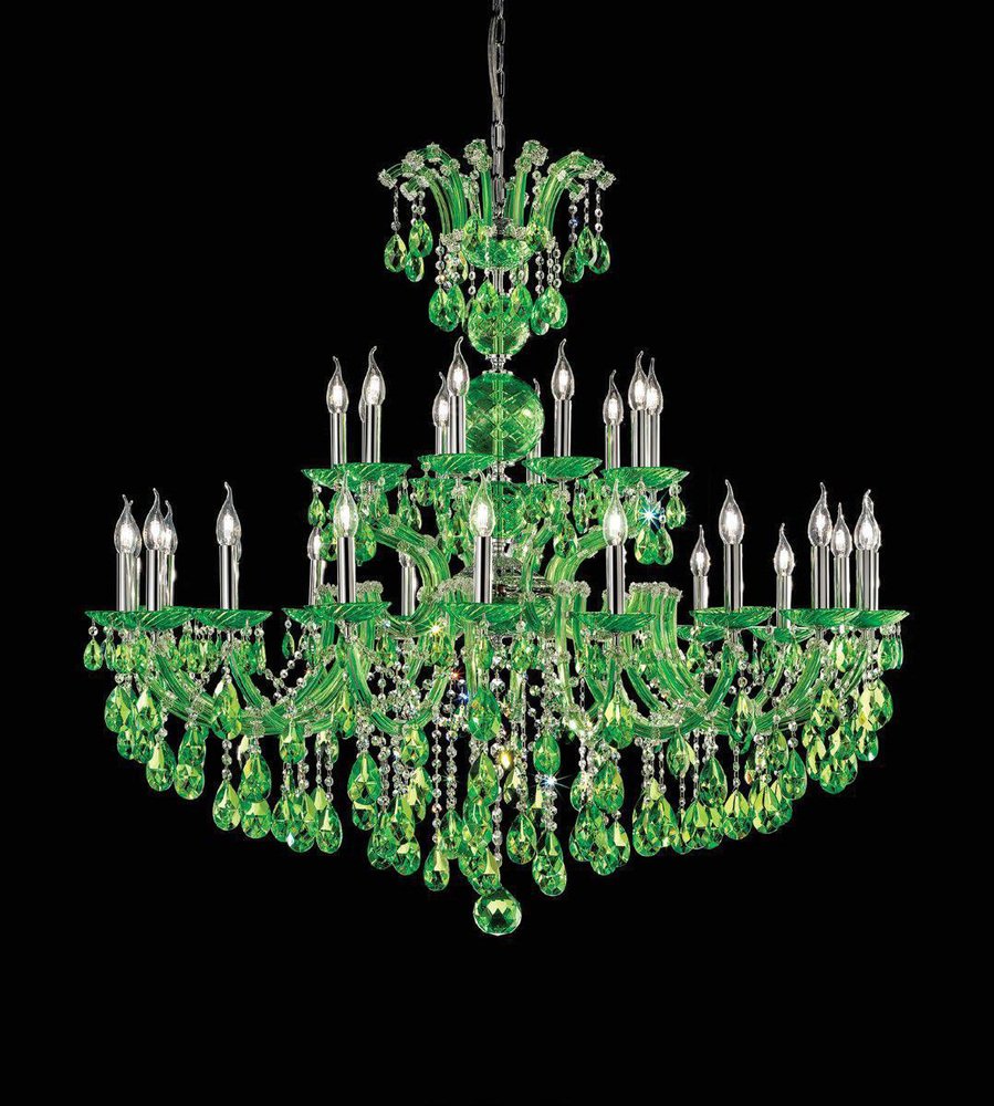 Maria Theresa 30 Lights Chandelier in Colored Artisan Crystal by Aggiolight. Dimensions: D 125 x H 120 cm. Materials: Polished Chrome, Colored Full Cut Crystal. Equipped with 30 x E14 (Max 33W) lights to ensure a brilliant, sophisticated glow. The Maria Theresa Color collection brings a vibrant, modern energy to the classic Bohemian silhouette. By incorporating high-quality tinted crystals in artistic shades such as Sapphire, Lime, Ruby, and Watermarine, Aggiolight transforms a traditional neo-classic design into a contemporary masterpiece. This 30-light fixture is fully customizable, allowing designers to choose specific color palettes or monochrome themes to perfectly match their interior projects.