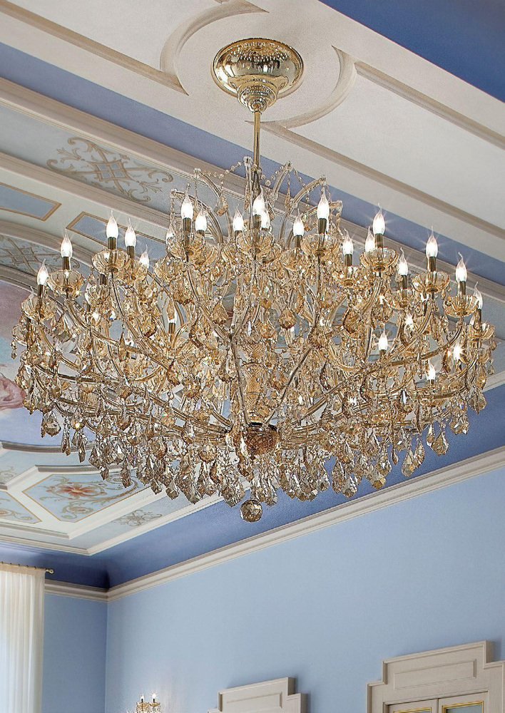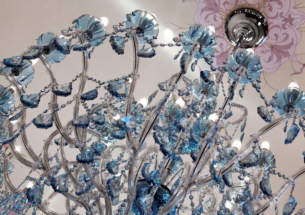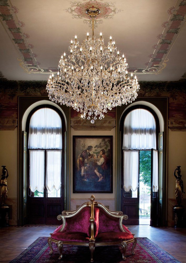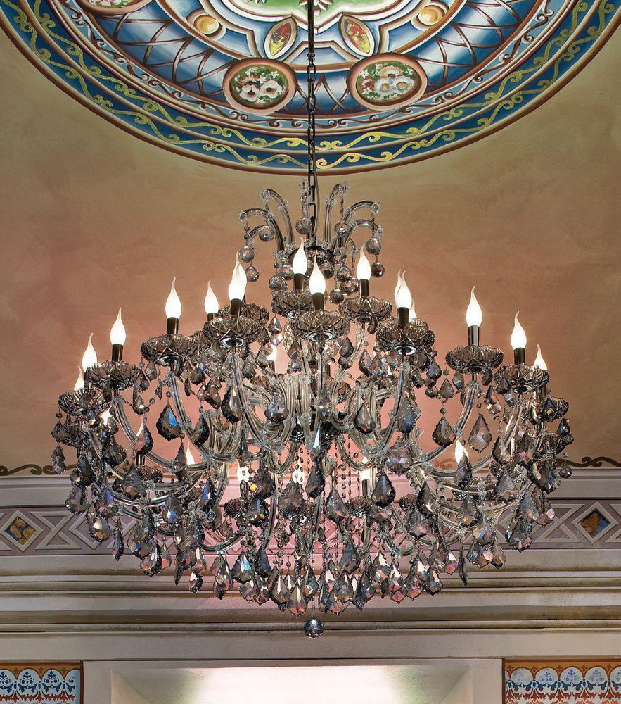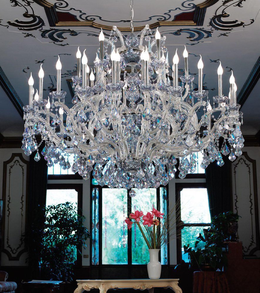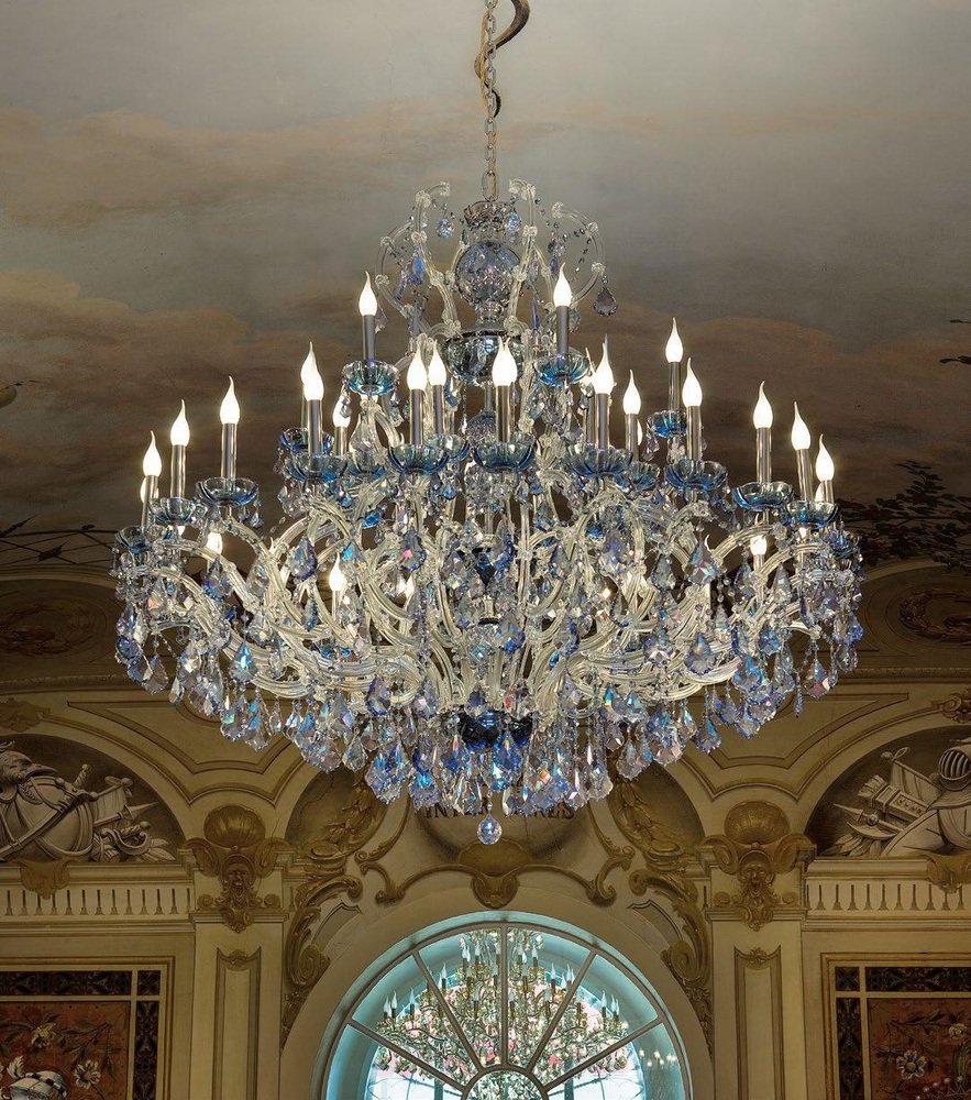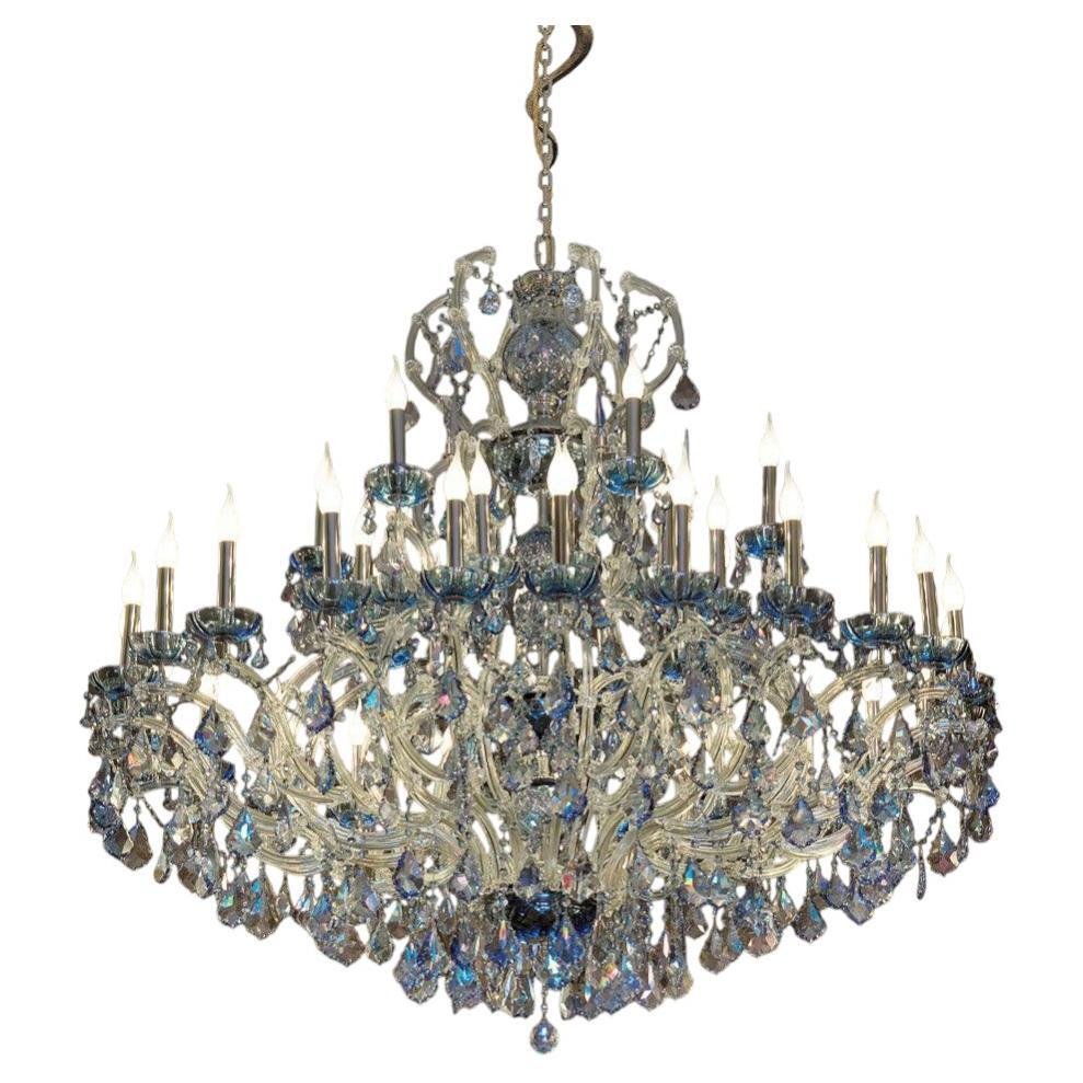 Maria Theresa 30 Lights Chandelier in Polished Chrome and Crystal by Aggiolight. Dimensions: D 125 x H 120 cm. Materials: Polished Chrome, Full Cut Crystal. Equipped with 30 x E14 (Max 33W) lights to ensure a brilliant, sophisticated glow. The Maria Theresa series represents the timeless elegance of neo-classic lighting. This 30-light chandelier features a polished metal structure adorned with premium full-cut clear crystals, creating a brilliant landscape of light and reflections. As a staple of luxury interior design, this model serves as a base for endless customizations. The collection includes a wide range of sizes, from intimate pendants to grand ballroom fixtures, as well as matching wall sconces.
