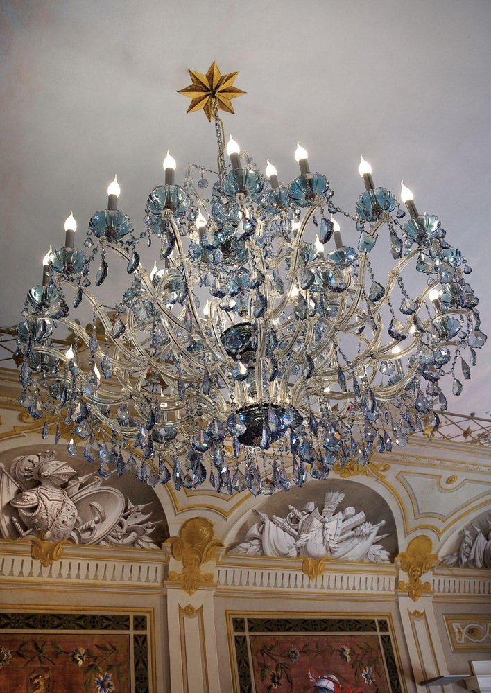 Lámpara de araña Maria Theresa de 30 luces en cromo pulido y cristal de Aggiolight. Dimensiones: D 125 x H 120 cm. Materiales: cromo pulido, cristal tallado. Equipada con 30 luces E14 (máx. 33 W) para garantizar un brillo sofisticado y brillante. La serie Maria Theresa representa la elegancia atemporal de la iluminación neoclásica. Esta lámpara de araña de 30 luces cuenta con una estructura de metal pulido adornada con cristales transparentes de corte completo de primera calidad, lo que crea un brillante paisaje de luz y reflejos. Como elemento básico del diseño de interiores de lujo, este modelo sirve de base para infinitas personalizaciones. La colección incluye una amplia gama de tamaños, desde lámparas colgantes íntimas hasta grandes lámparas para salones de baile, así como apliques de pared a juego.