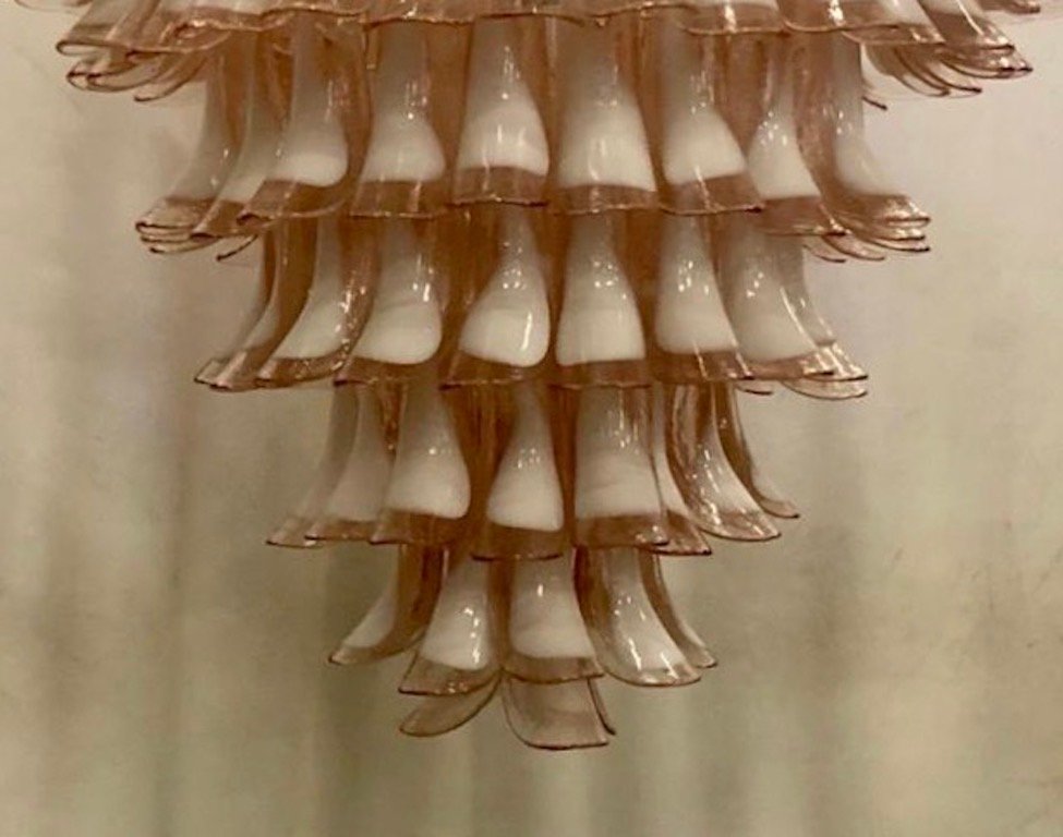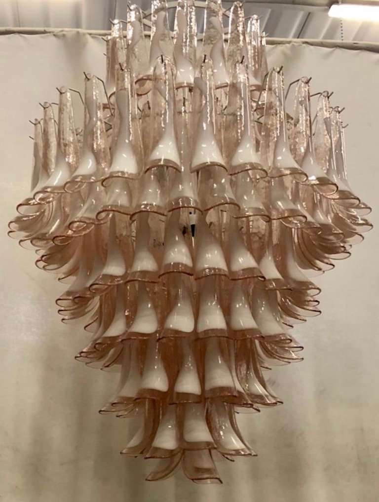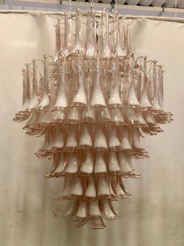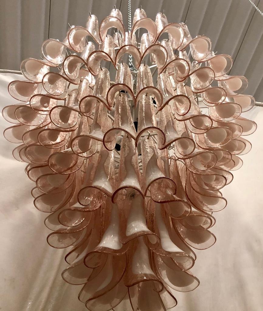 Lámpara de araña Mid-Century redonda de cristal de Murano rosa claro y blanco de Mazzega, años 70
