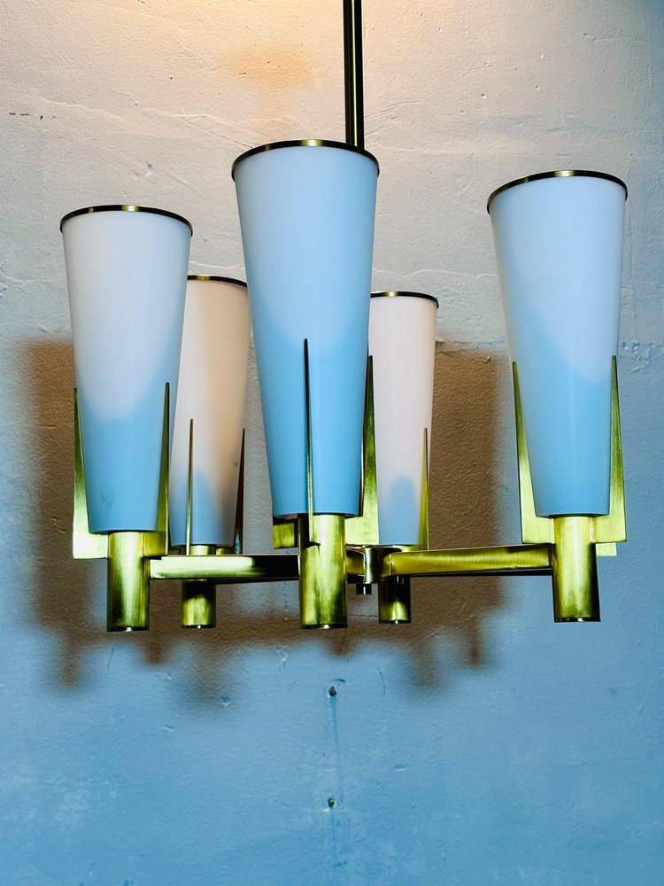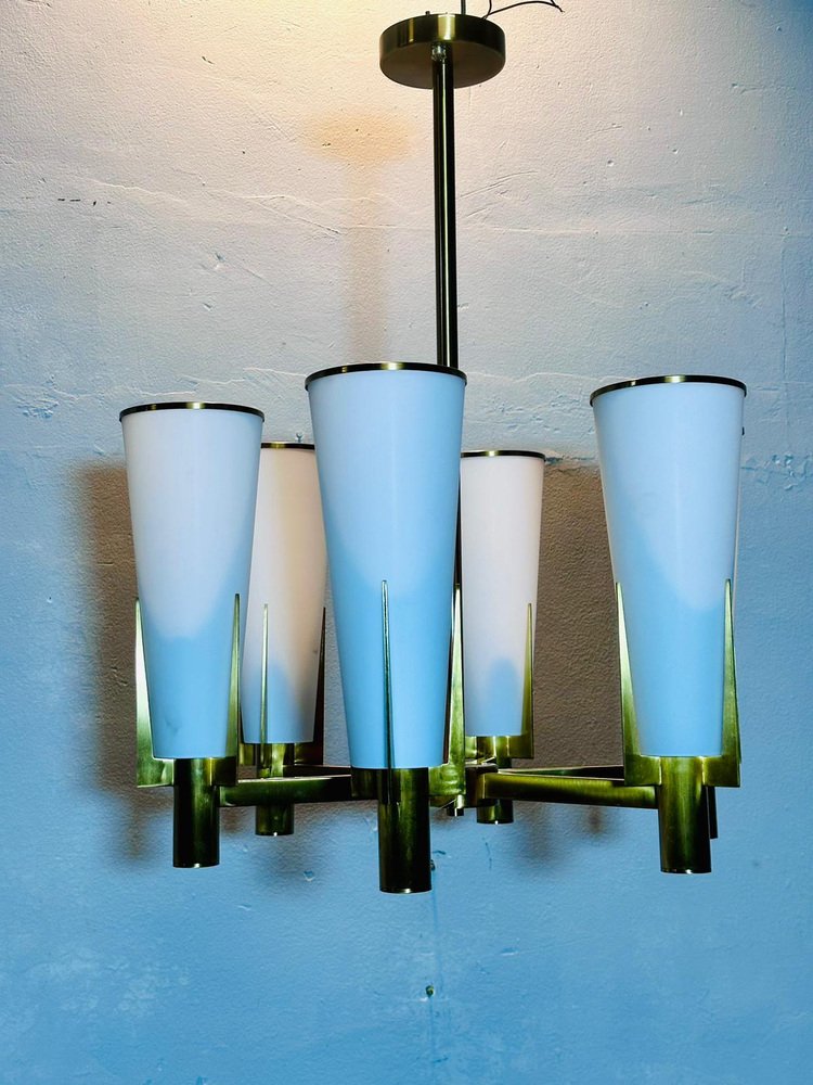 The metal frame with brass finish houses six conical white opaline glass diffusers, embellished with golden metal details.