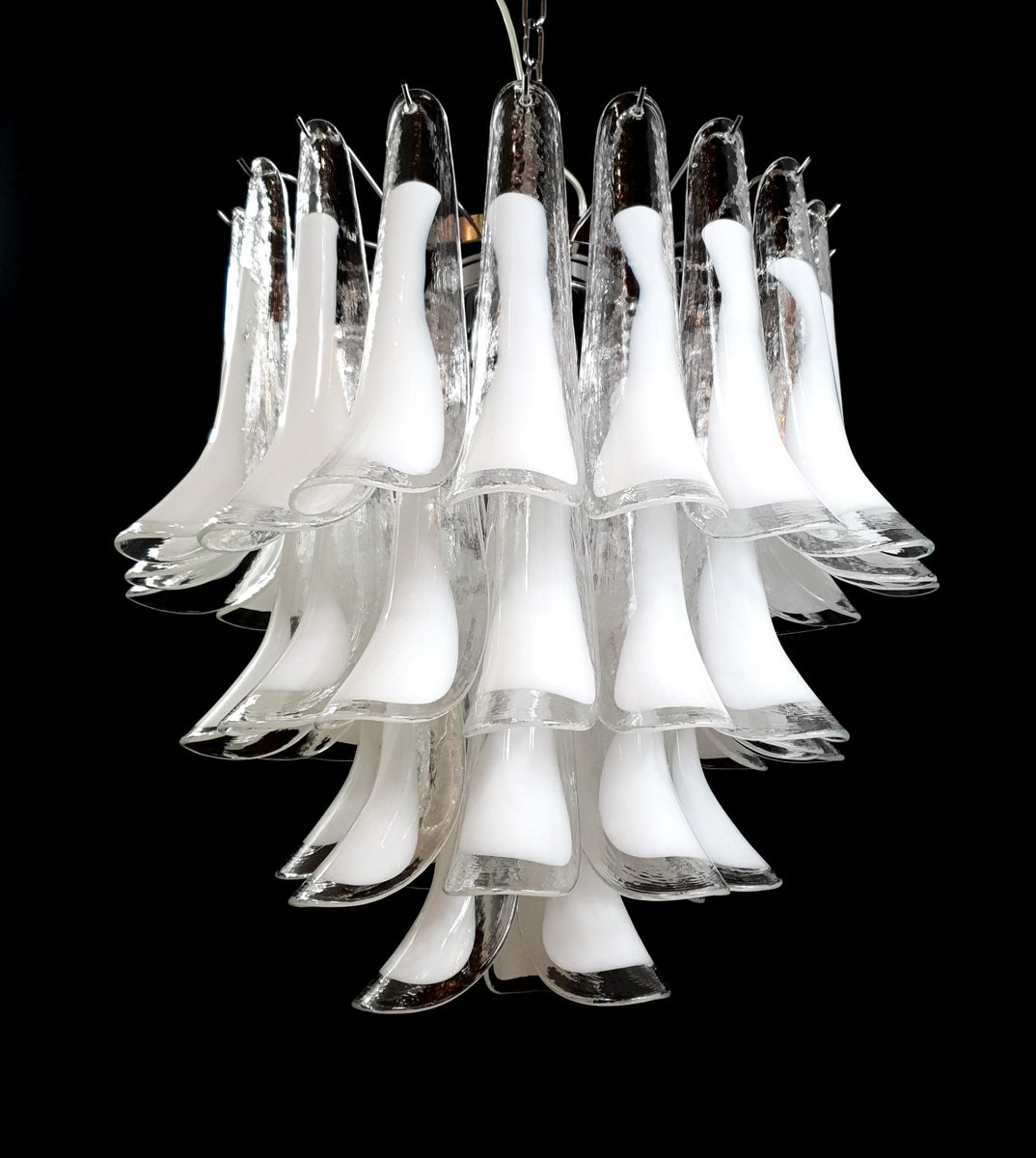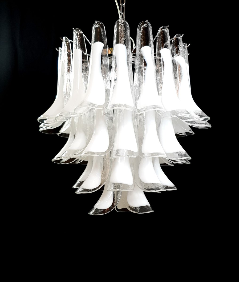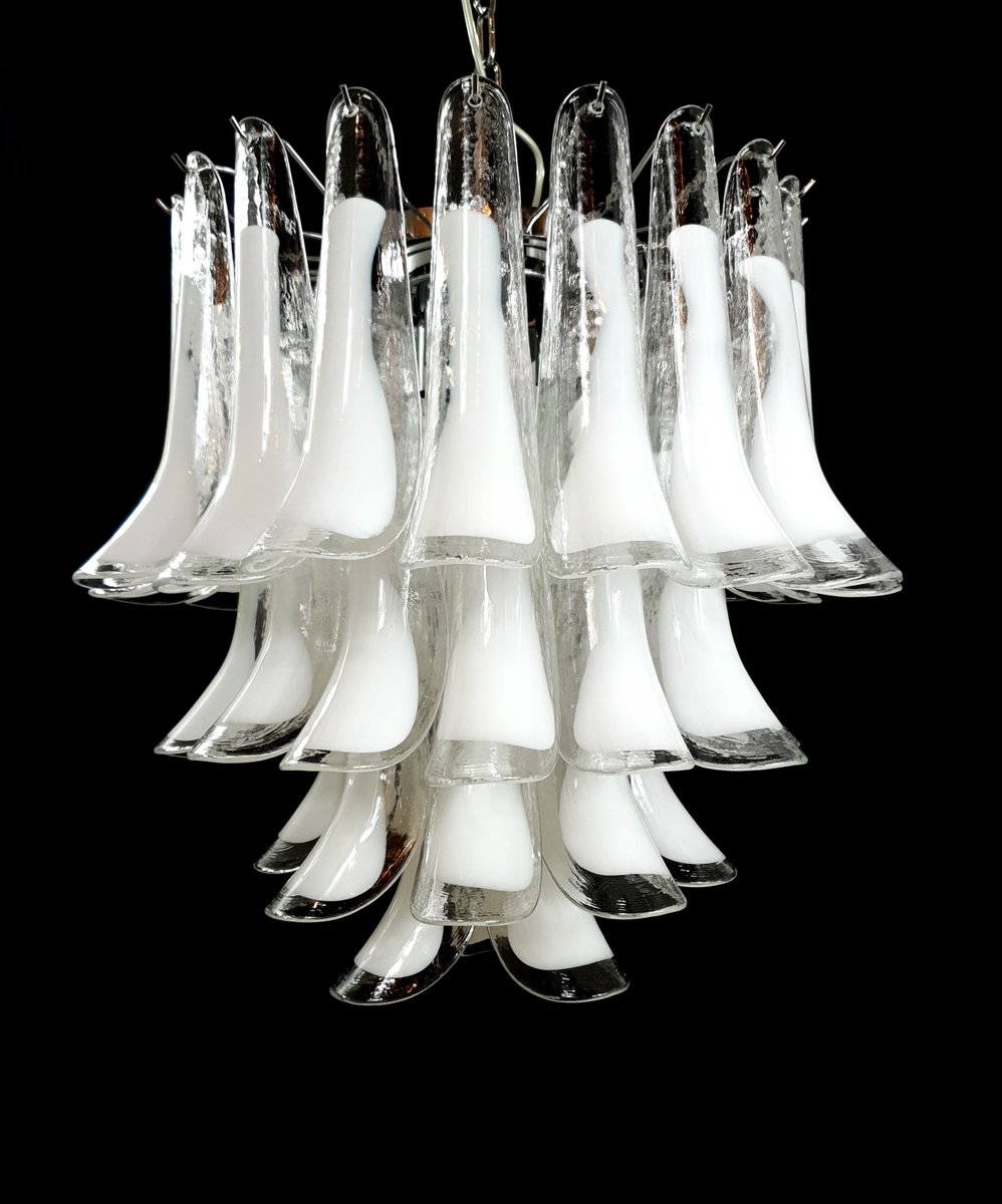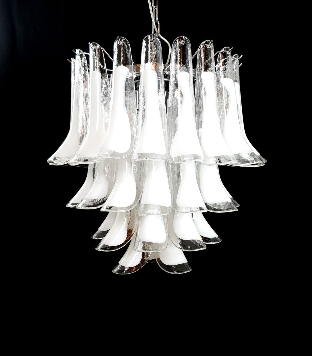 Vintage Murano chandelier, Mazzega style, from the 1980s, round and suitable for any space. This chandelier is composed of 44 Murano petal-shaped glass pieces, crystal with a milky white core. The chandelier has very special light reflections when viewed from different angles. The petal-shaped crystal glass with a white core exudes a sense of refinement and refinement. Finished in a beautiful, highly elegant polished chrome. Very exclusive, it fills the room with color yet sobriety. with its full, full shape, you won't be able to stop looking at it from the myriad angles of light. Seen from below, the chandelier resembles a flower blooming in spring, a fragrant daisy. This chandelier has a diameter of 65 cm and a height of 60 cm. It takes 3 E27 bulbs. This chandelier was created and produced in our factory by our master craftsmen.