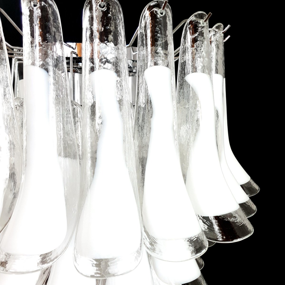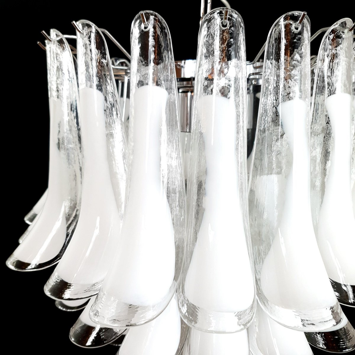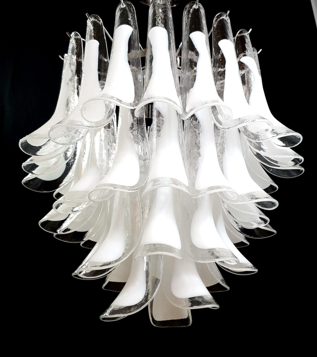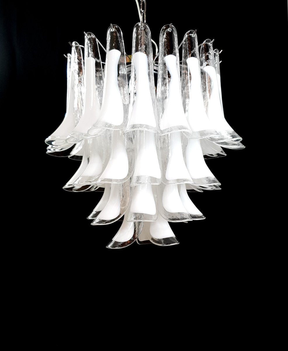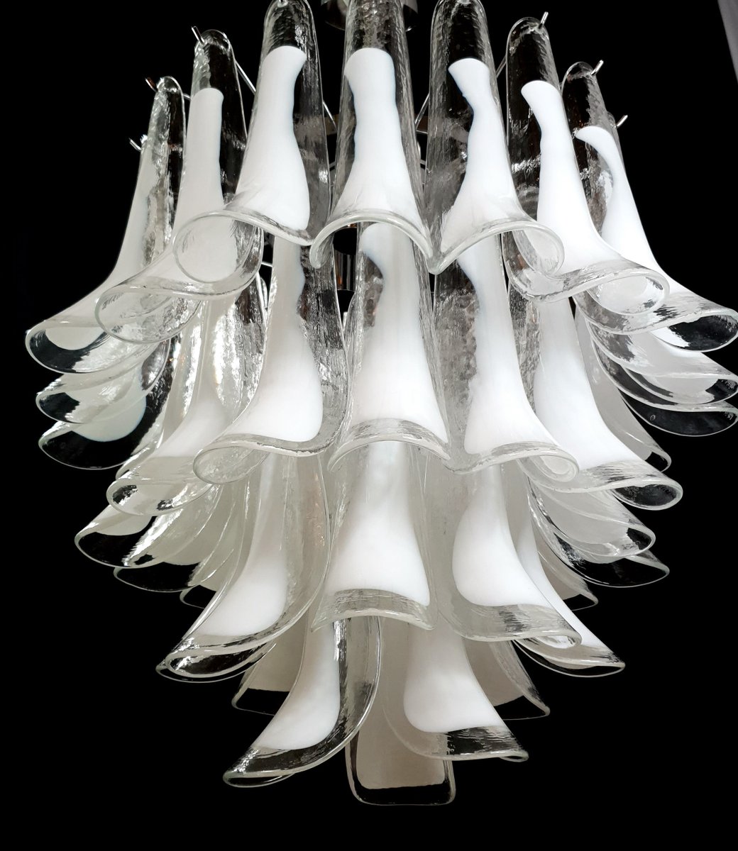 Vintage Murano chandelier, Mazzega style, from the 1980s, round and suitable for any space. This chandelier is composed of 44 Murano petal-shaped glass pieces, crystal with a milky white core. The chandelier has very special light reflections when viewed from different angles. The petal-shaped crystal glass with a white core exudes a sense of refinement and refinement. Finished in a beautiful, highly elegant polished chrome. Very exclusive, it fills the room with color yet sobriety. with its full, full shape, you won't be able to stop looking at it from the myriad angles of light. Seen from below, the chandelier resembles a flower blooming in spring, a fragrant daisy. This chandelier has a diameter of 65 cm and a height of 60 cm. It takes 3 E27 bulbs. This chandelier was created and produced in our factory by our master craftsmen.