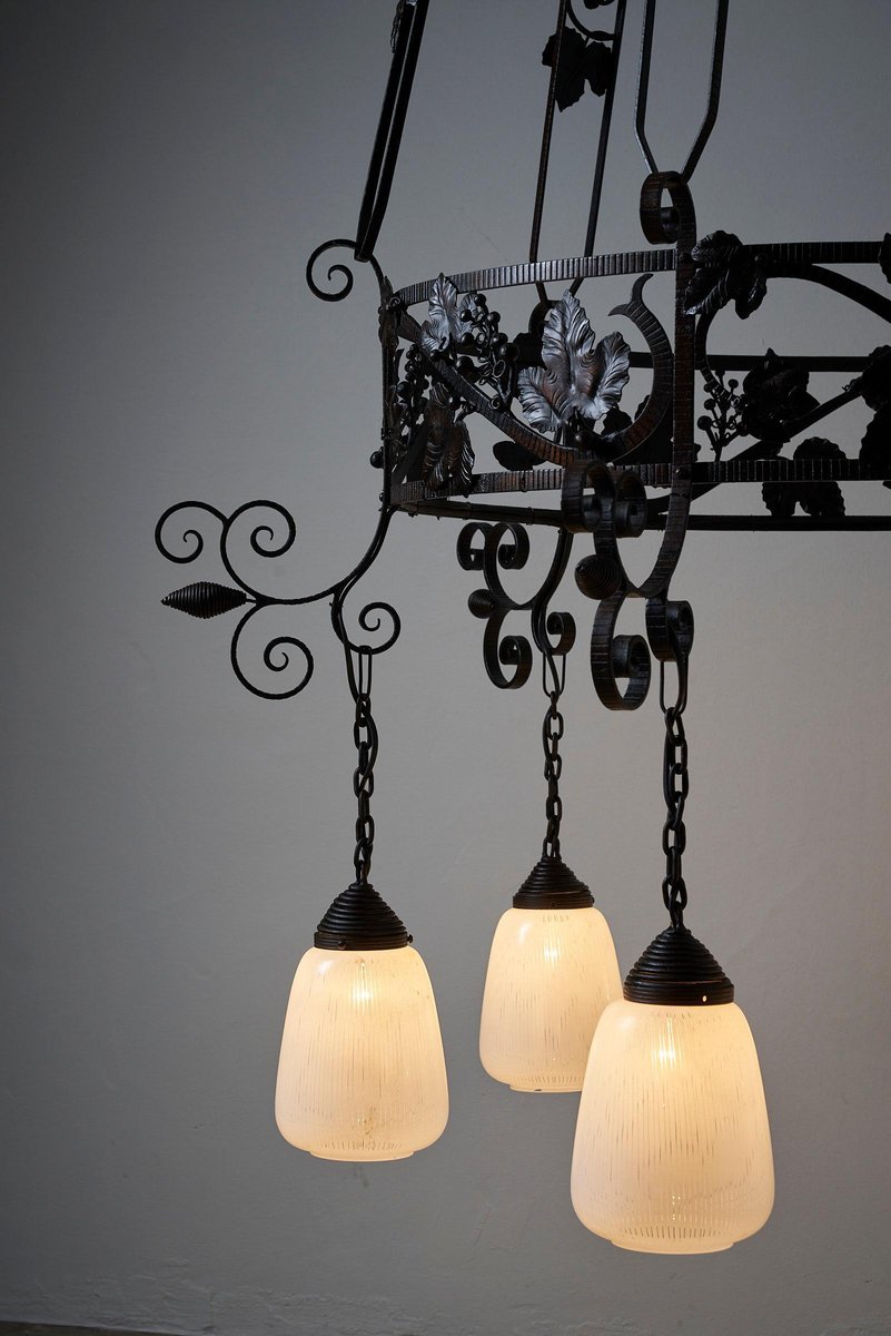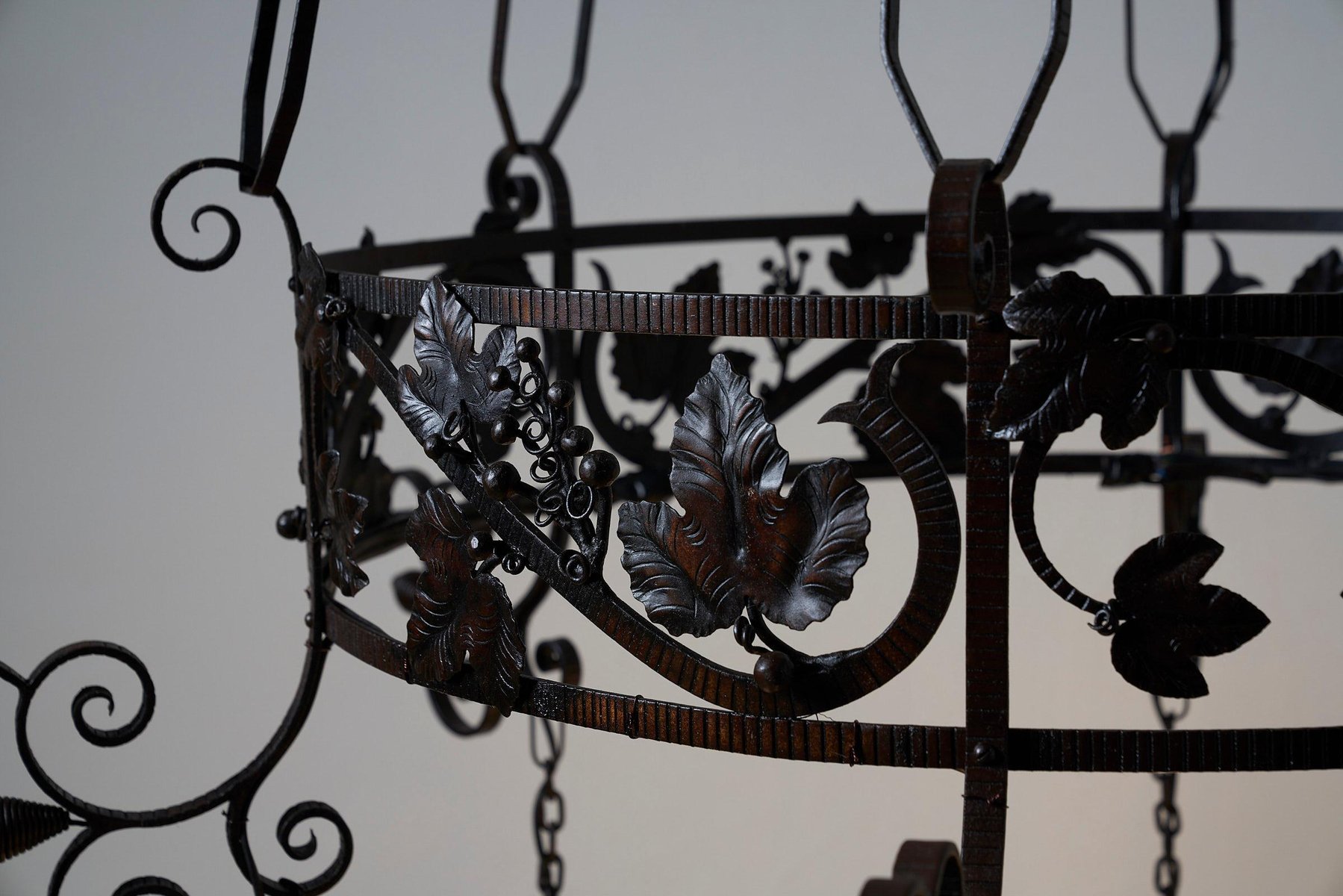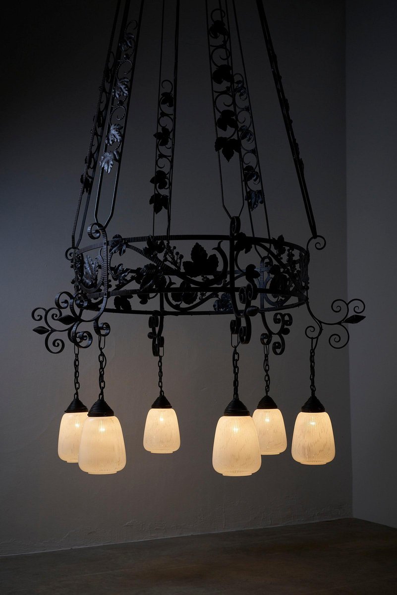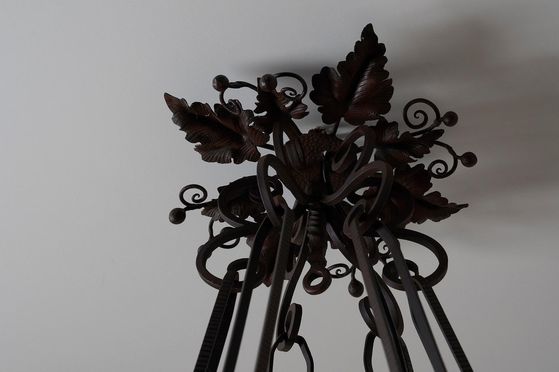 Lámpara de araña vintage de hierro forjado con hojas de vino, años 20