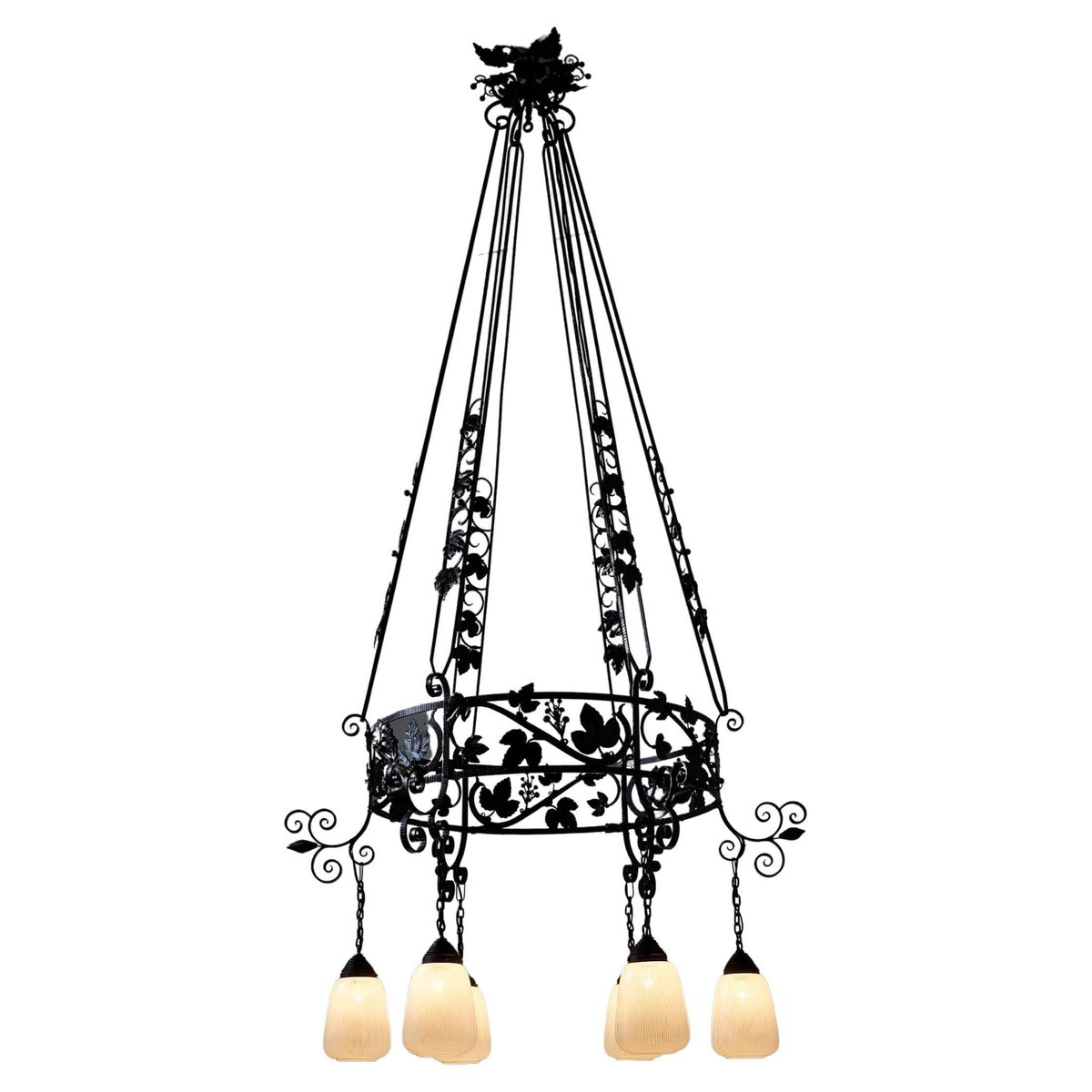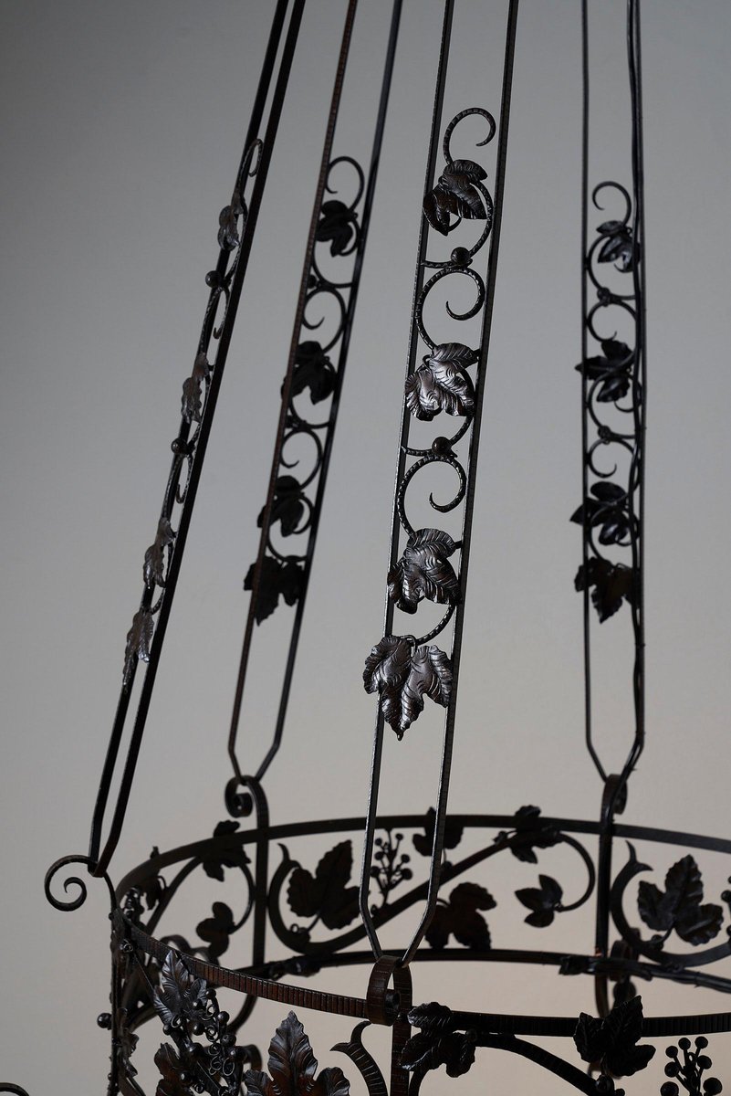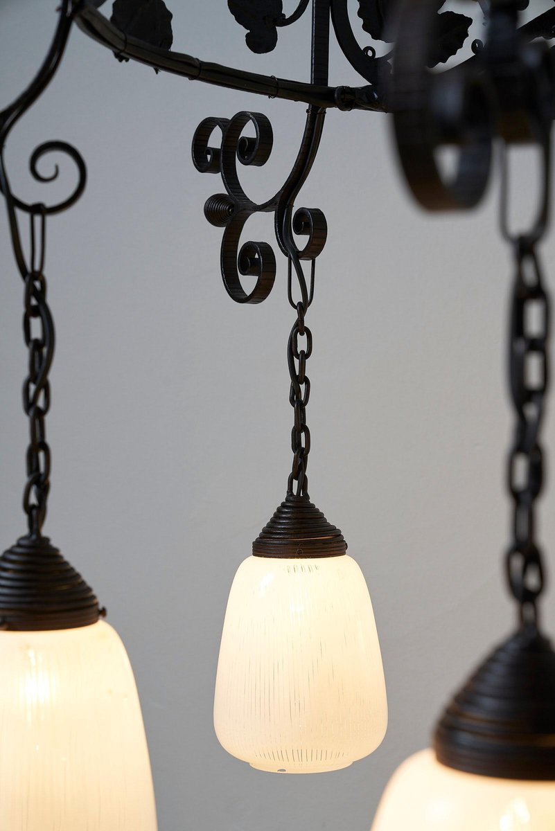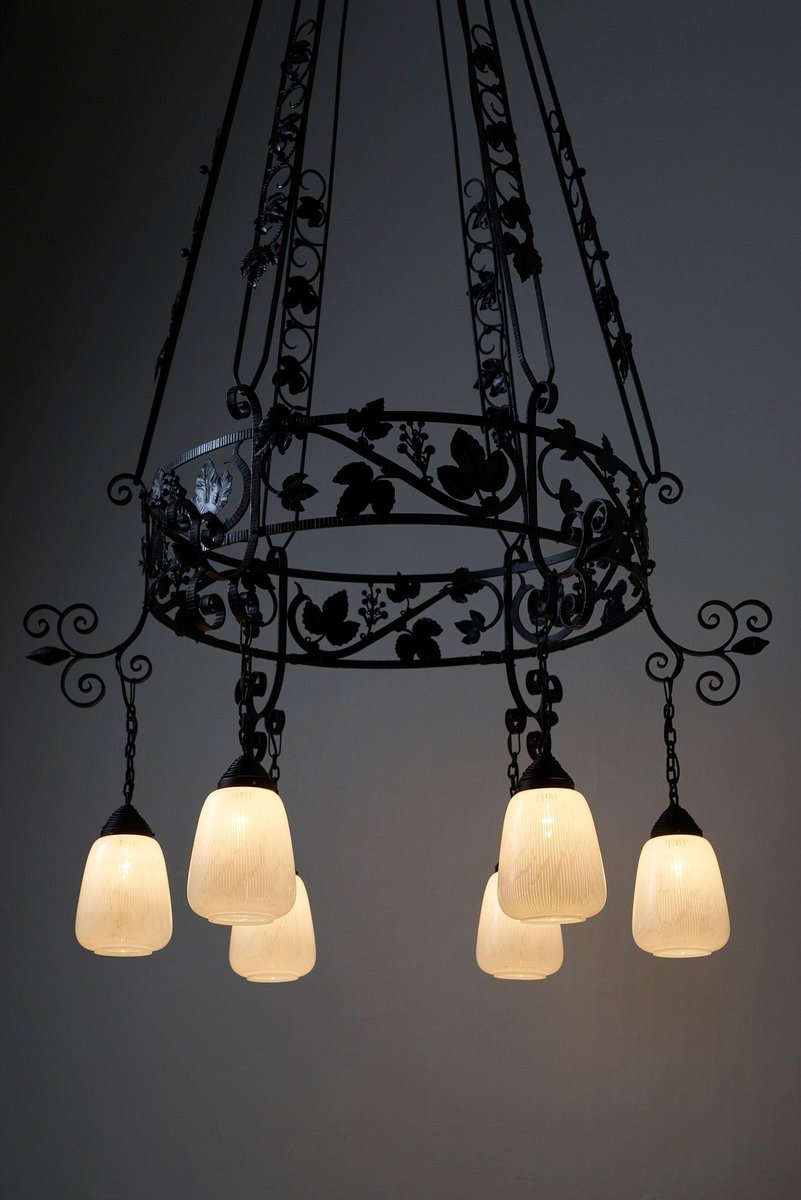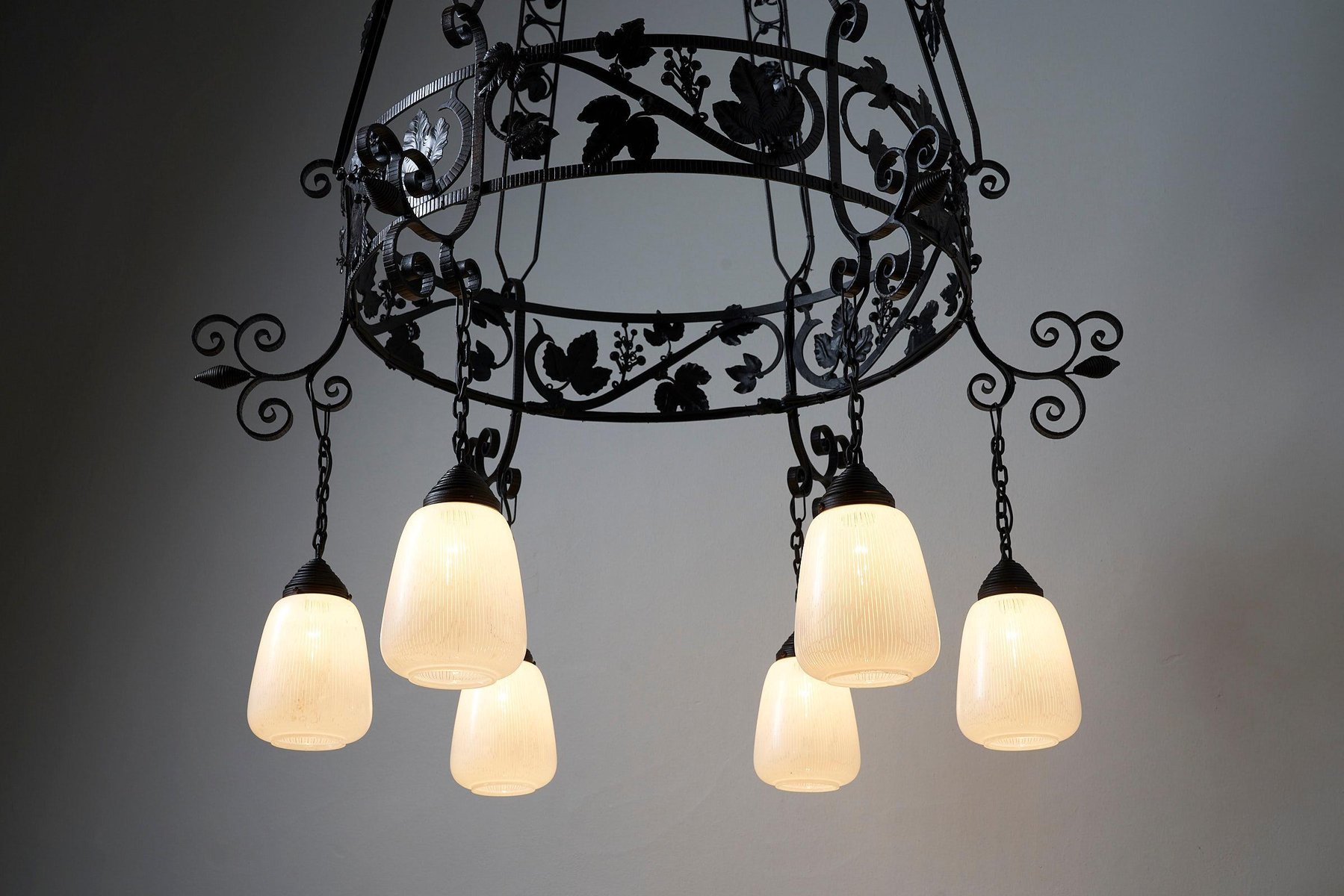 Lámpara de araña vintage de hierro forjado con hojas de vino, años 20