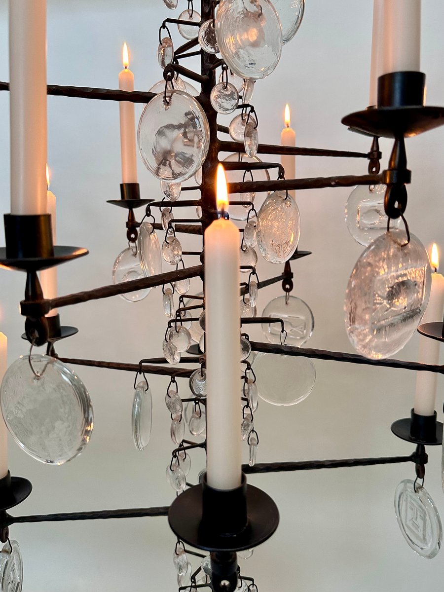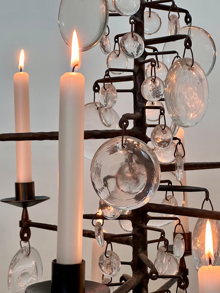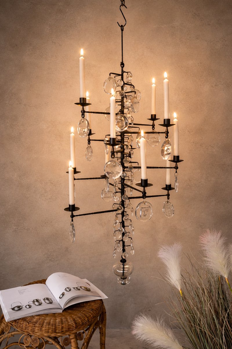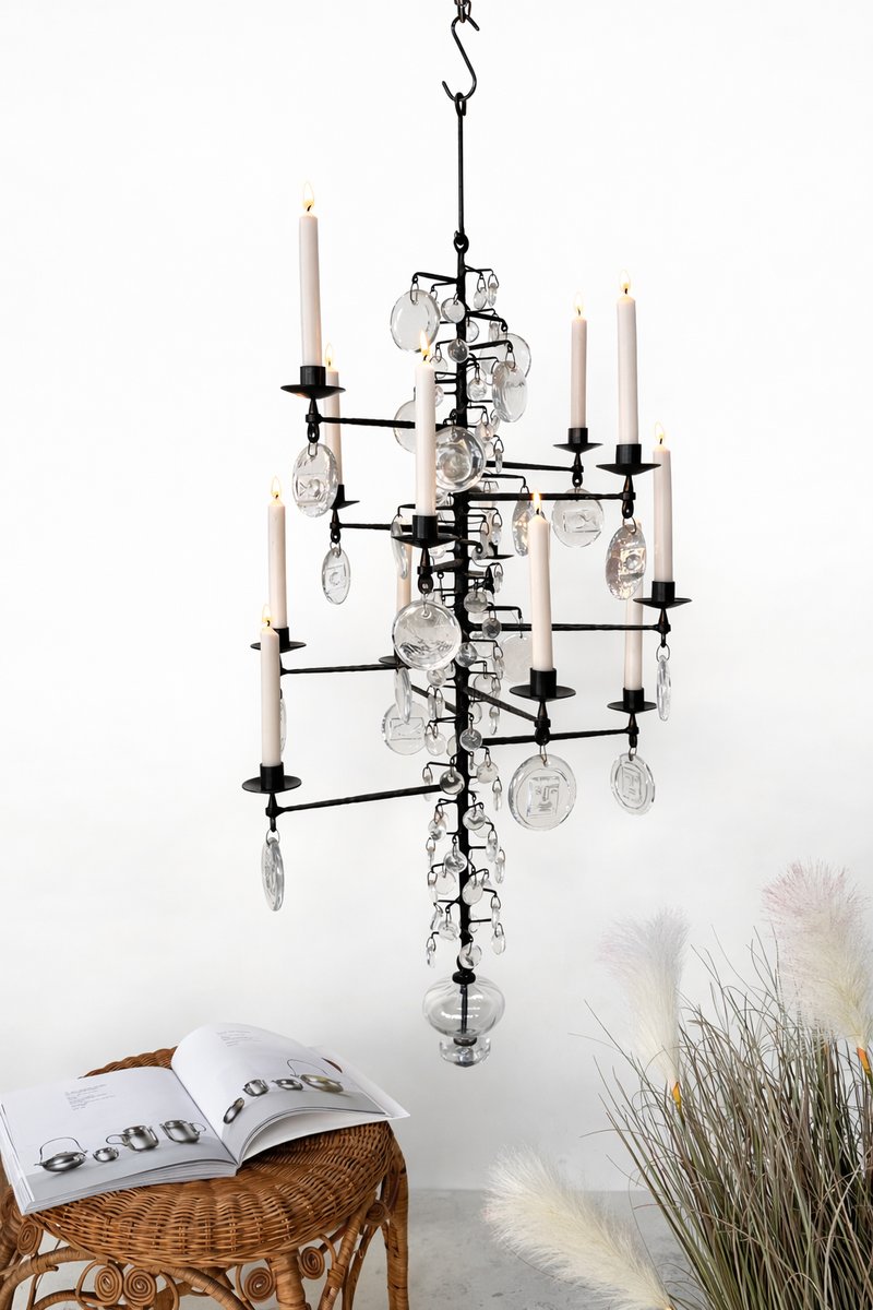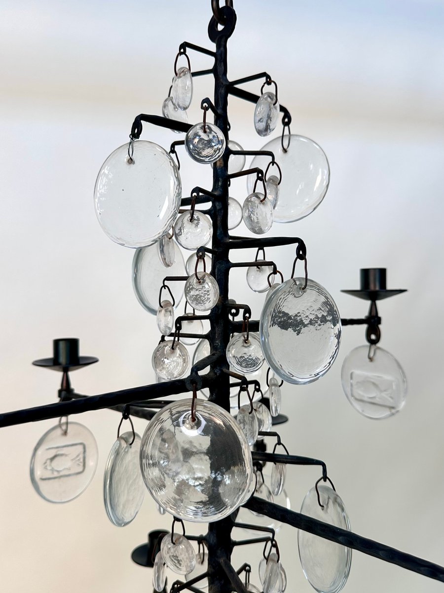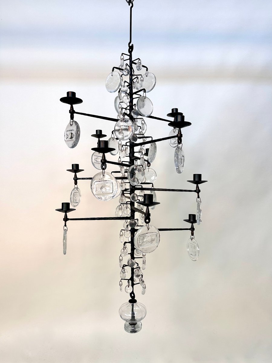 Lámpara de araña vintage grande de vidrio soplado y hierro forjado de Erik Höglund para Boda Smide, años 60