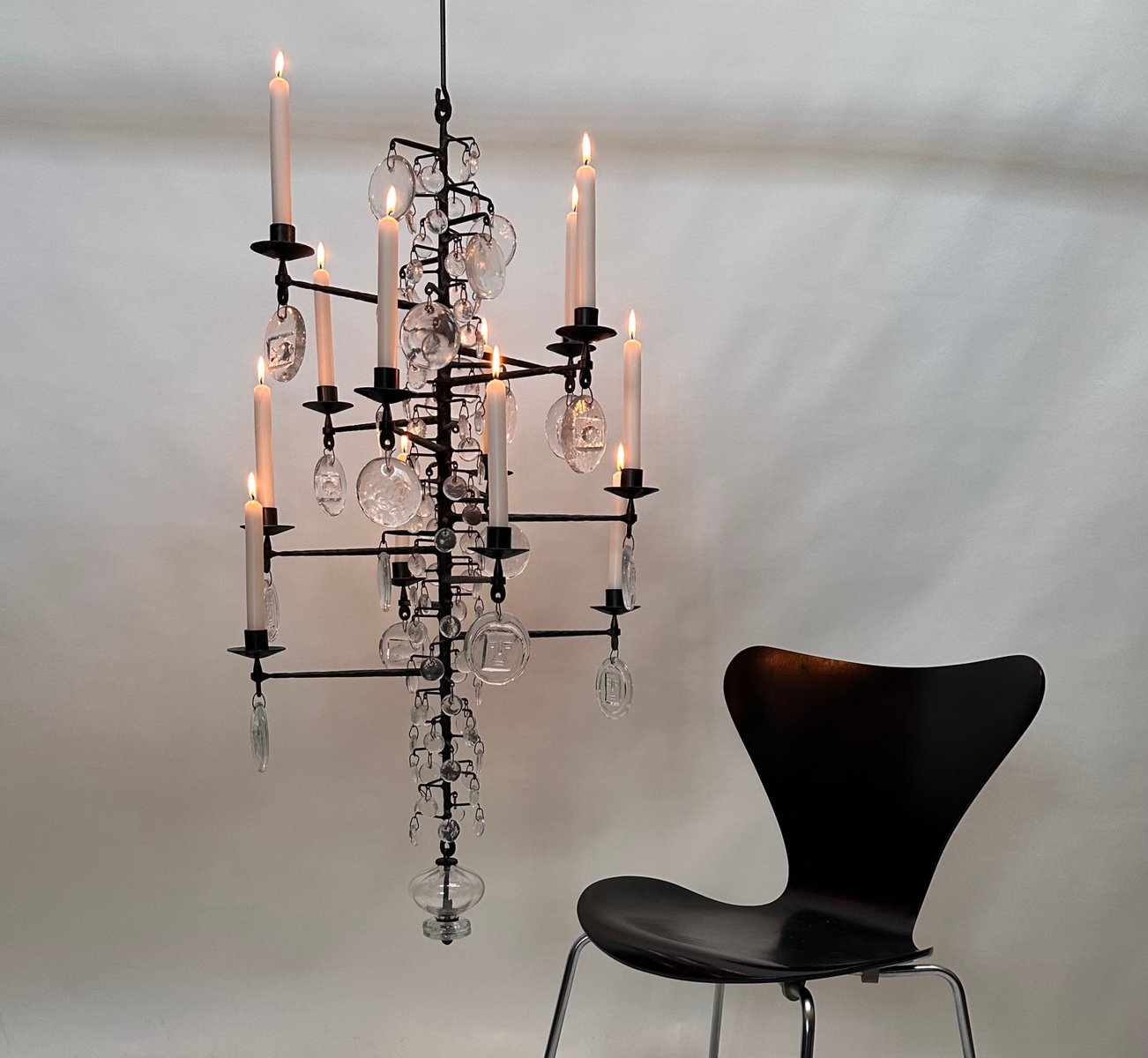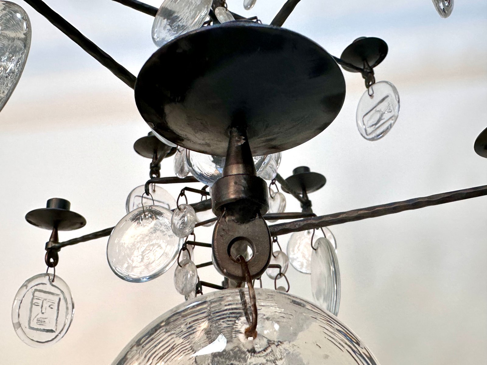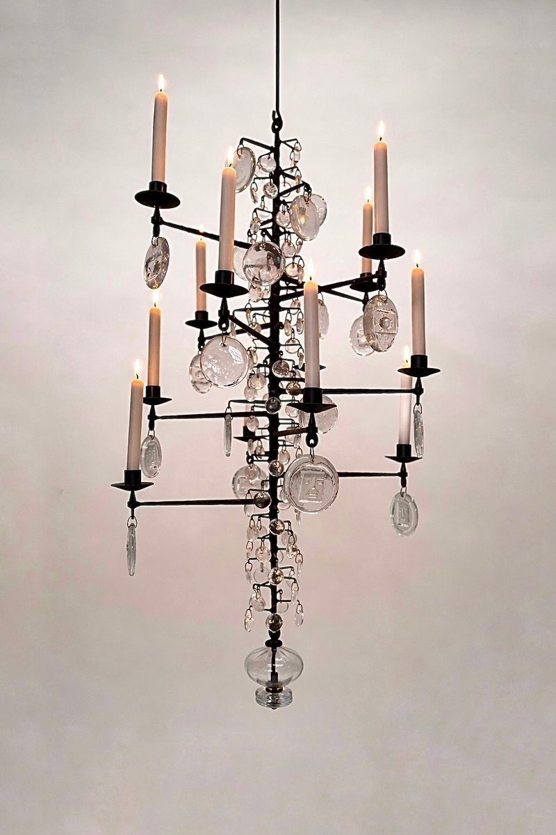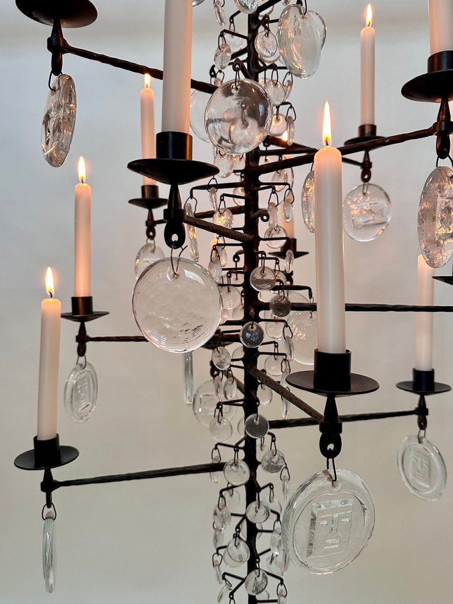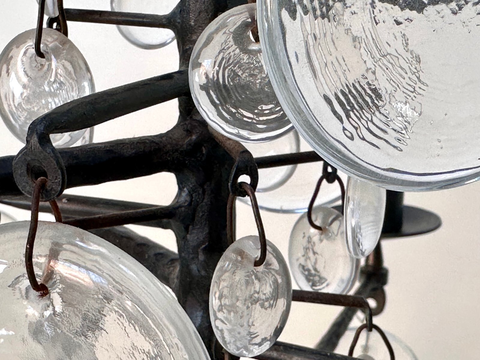 Lámpara de araña vintage grande de vidrio soplado y hierro forjado de Erik Höglund para Boda Smide, años 60