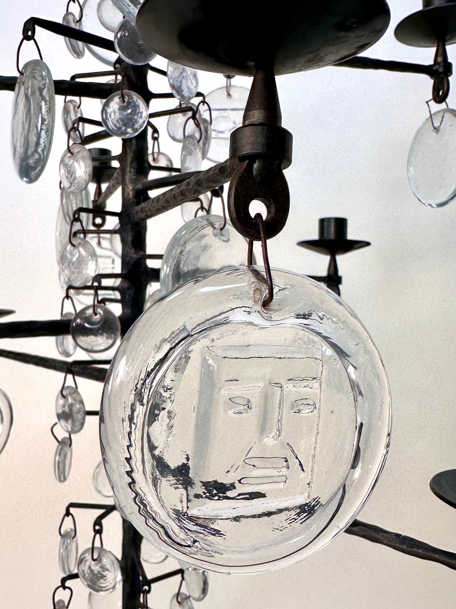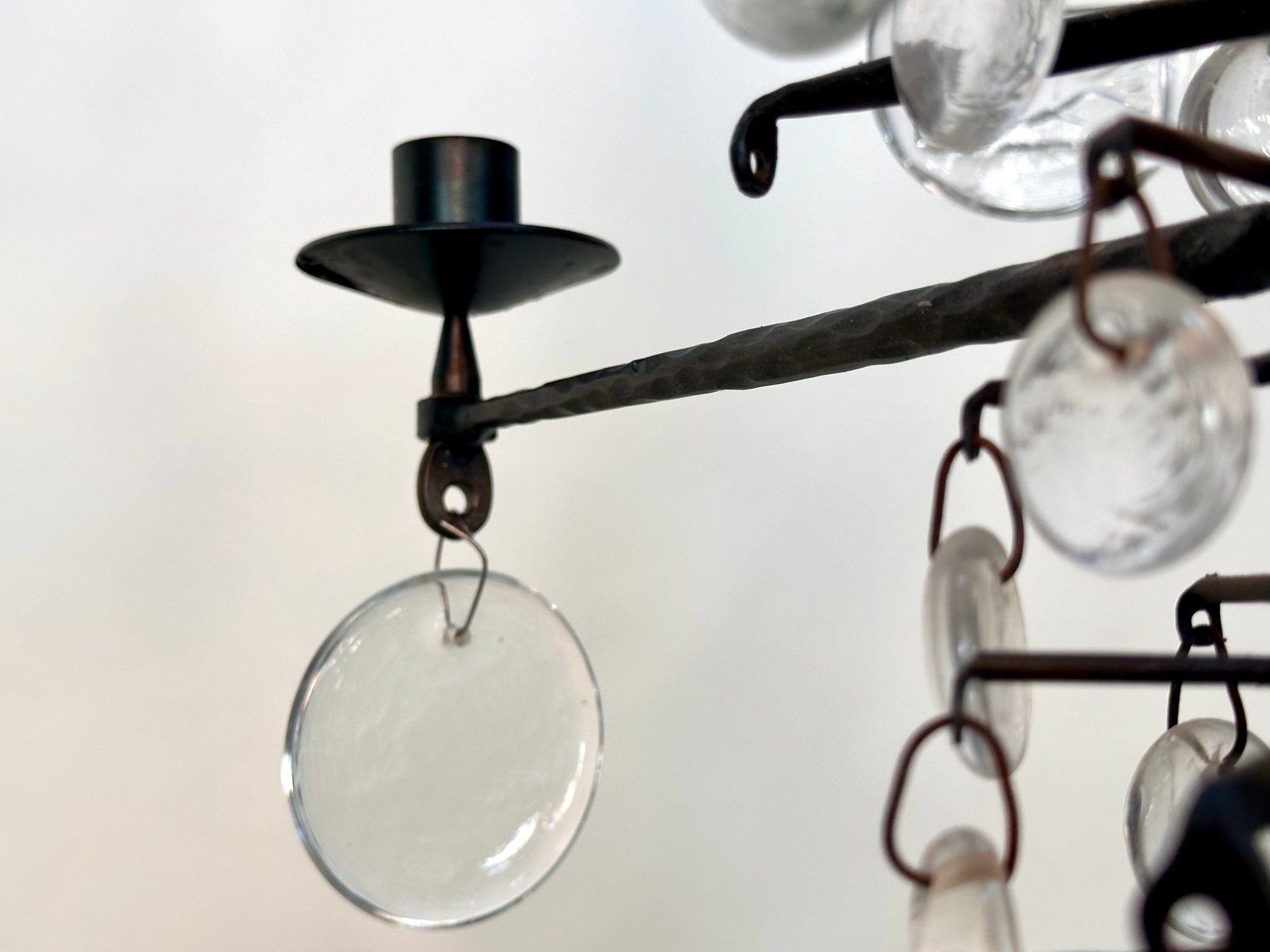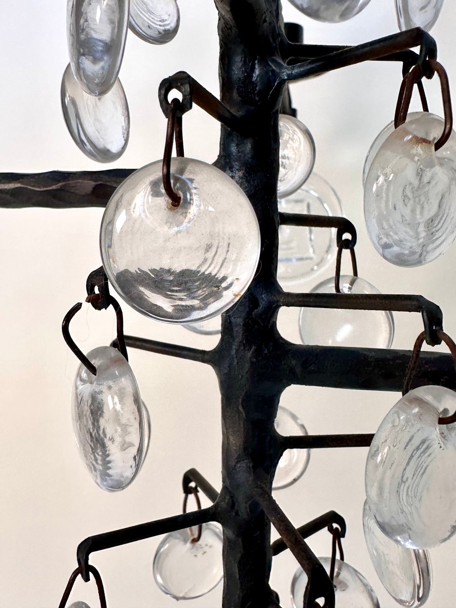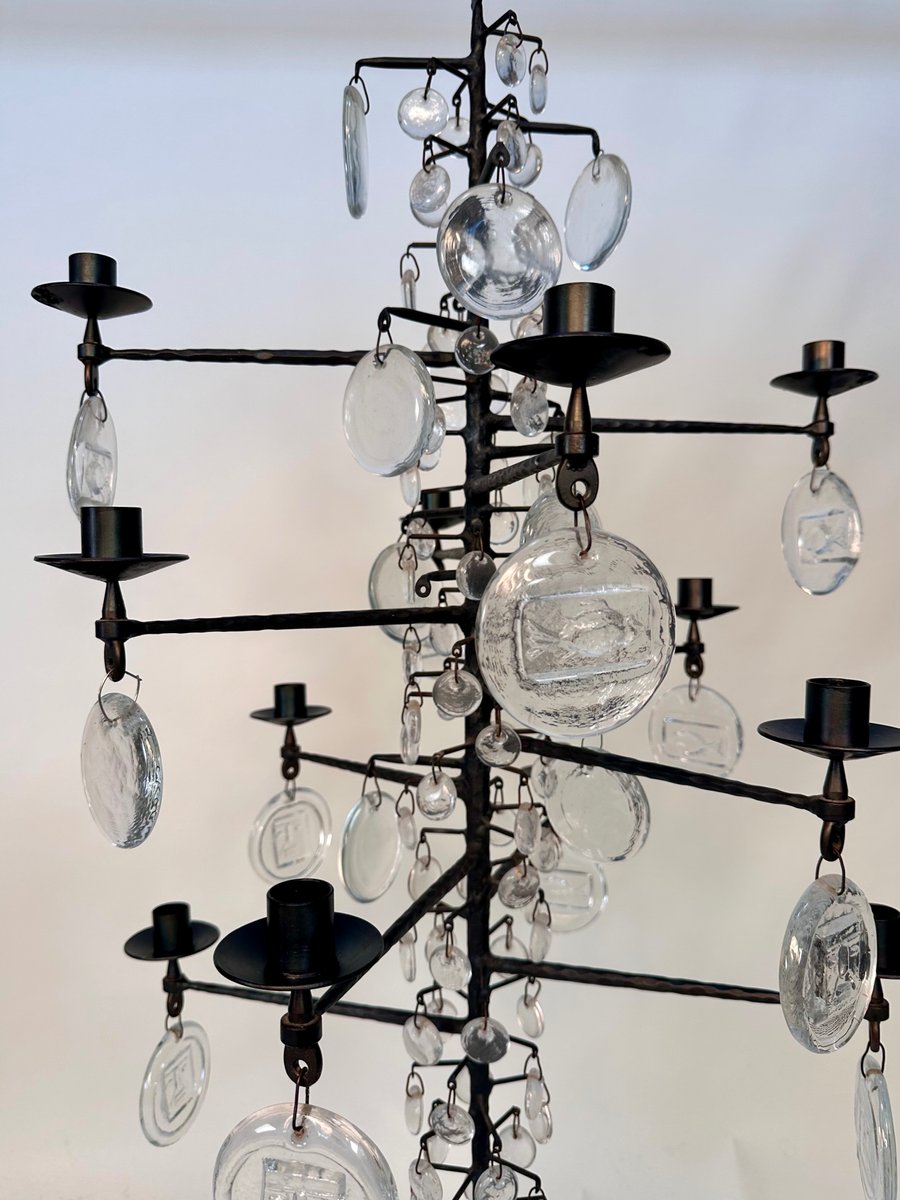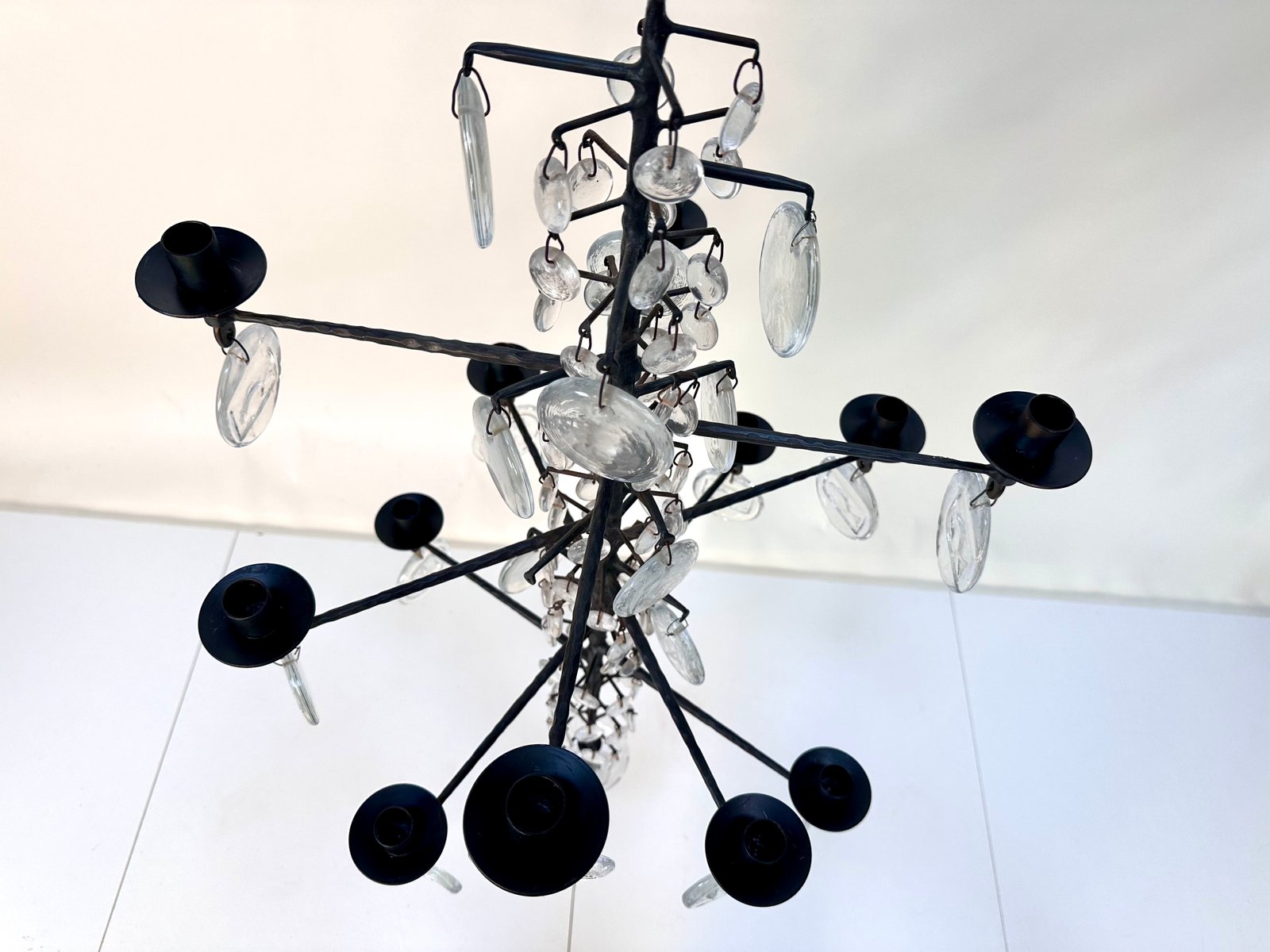 Lámpara de araña vintage grande de vidrio soplado y hierro forjado de Erik Höglund para Boda Smide, años 60