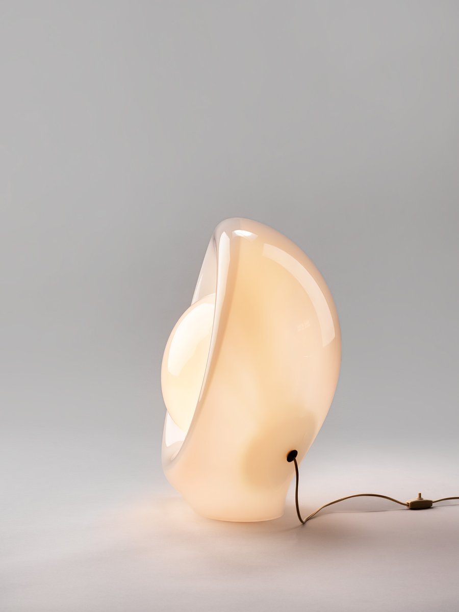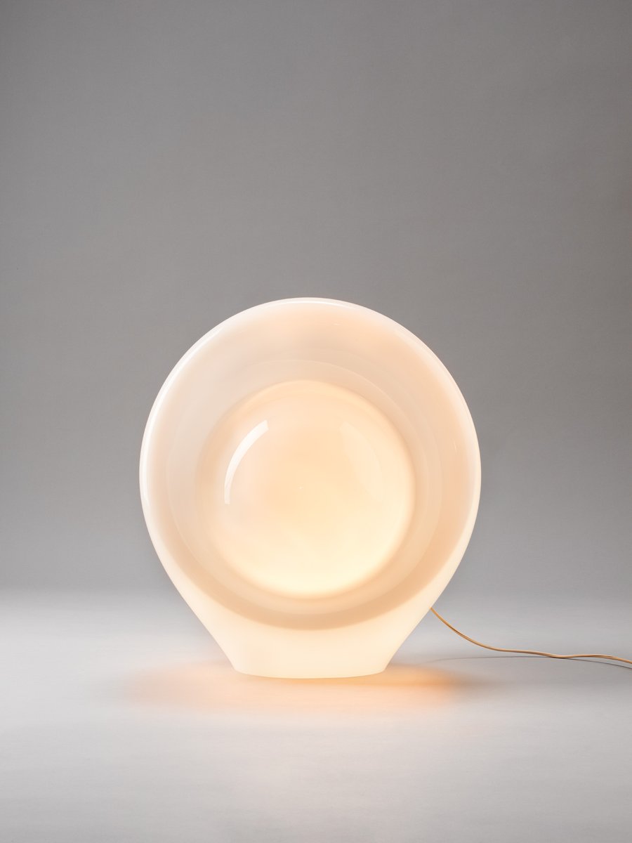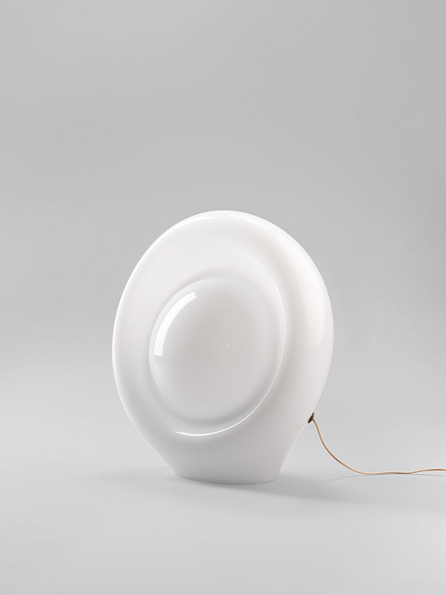 La lámpara que aquí se presenta forma parte de un grupo de modelos realizados entre finales de los años sesenta y mediados de la década siguiente: una serie de lámparas de vidrio opalino, de gran tamaño y formas orgánicas poco habituales.