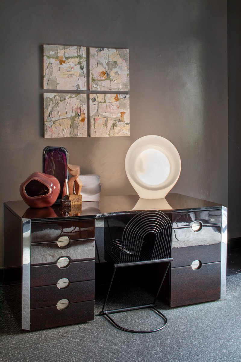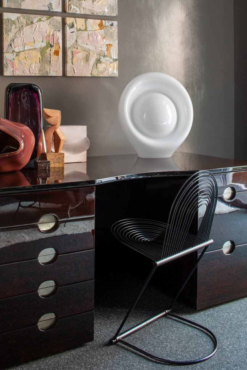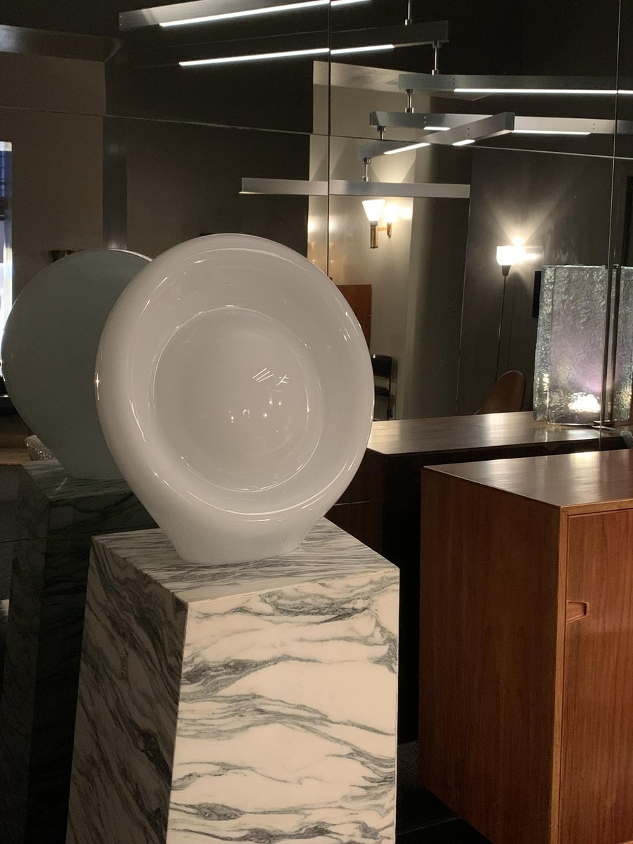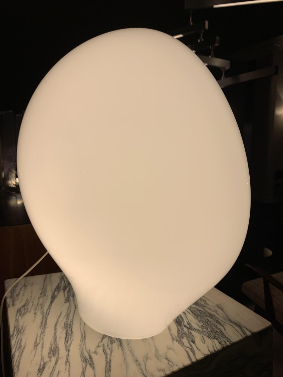 La lámpara que aquí se presenta forma parte de un grupo de modelos realizados entre finales de los años sesenta y mediados de la década siguiente: una serie de lámparas de vidrio opalino, de gran tamaño y formas orgánicas poco habituales.