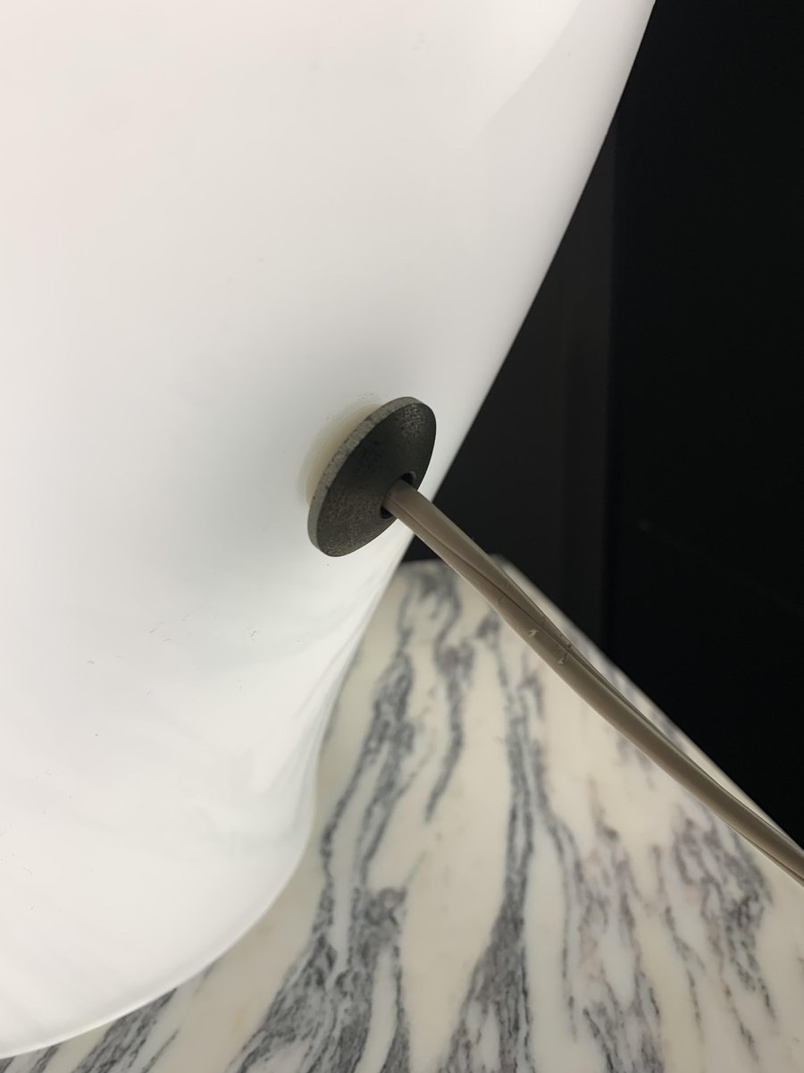The lamp presented here is part of a group of models made between the end of the 1960s and the middle of the following decade: a series of opaline glass lamps, large in size and with unusual organic shapes.