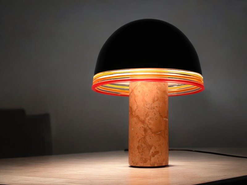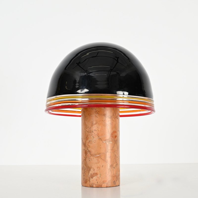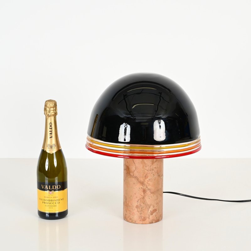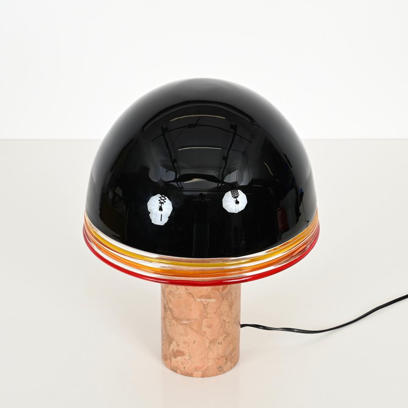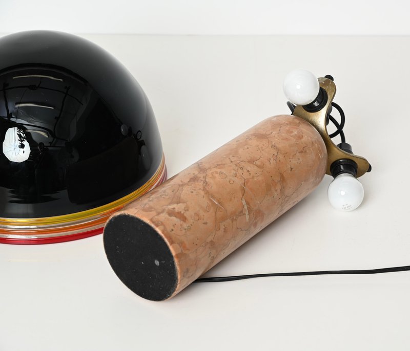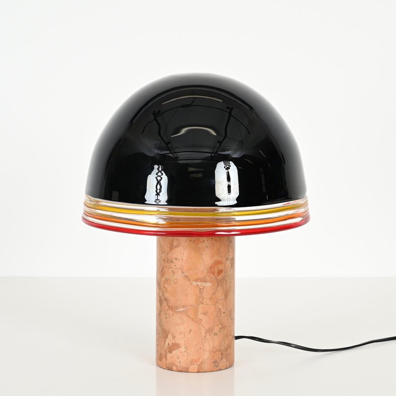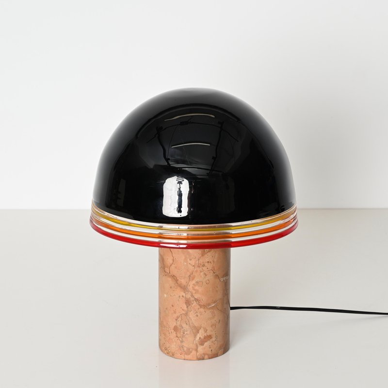 Spectacular "Febo" Table lamp in solid red Verona marble, brass and a stunning shade in mouth-blown Murano glass. This incredibly rare lamp was designed by Roberto Pamio & Renato Toso and produced by Leucos in Italy during the 1970s. In amazing conditions, this breathtaking lamp has base in red Verona marble which is known to be one of the most precious Italian marbles. The dome-shaped shade made by Leucos is in a gorgeous Murano mouth-blown glass, incredibly rare in the black version, with decorative yellow, orange and red rims and white glass internally to amplify the light reflection. When lit the lamp is simply spectacular, enhancing the veining of the red Verona marble. The shade lays on a sturdy brass support, with a triple light bulb system. It comes wired and tested, compatible with both US and EU/UK standards, it uses three E26/27 light bulbs. Produced in the 1970s, this lamp stands as a testament to Italian design excellence. Its harmonious balance of craftsmanship and style makes it a perfect statement piece for any interior setting. A magnificent and unique table lamp that will become the focal point of a midcentury living room. Dimension (cm): Diameter - 31 Height - 42.