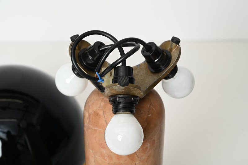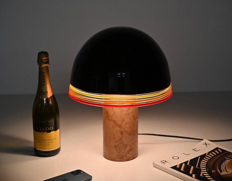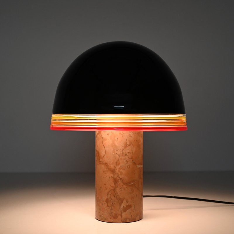 Espectacular lámpara de sobremesa "Febo" de mármol rojo macizo de Verona, latón y una impresionante pantalla de cristal de Murano soplado a boca. Esta lámpara increíblemente rara fue diseñada por Roberto Pamio & Renato Toso y producida por Leucos en Italia durante la década de 1970. En unas condiciones increíbles, esta impresionante lámpara tiene la base de mármol rojo de Verona, conocido por ser uno de los mármoles italianos más preciados. La pantalla en forma de cúpula fabricada por Leucos es de un precioso cristal soplado de Murano, increíblemente raro en la versión negra, con bordes decorativos amarillos, naranjas y rojos y cristal blanco en el interior para amplificar el reflejo de la luz. Cuando está encendida, la lámpara es simplemente espectacular, realzando las vetas del mármol rojo de Verona. La pantalla descansa sobre un robusto soporte de latón, con un sistema de triple bombilla. Se suministra cableada y probada, compatible con las normas de EE.UU. y de la UE/Reino Unido, y utiliza tres bombillas E26/27. Fabricada en la década de 1970, esta lámpara es un testimonio de la excelencia del diseño italiano. Su armonioso equilibrio de artesanía y estilo la convierte en una pieza perfecta para cualquier interior. Una lámpara de mesa magnífica y única que se convertirá en el centro de atención de un salón de mediados de siglo. Dimensiones (cm): Diámetro - 31 Altura - 42.