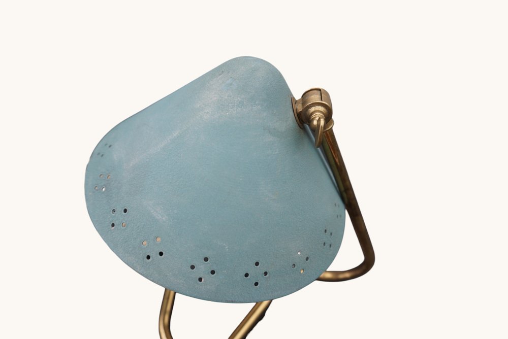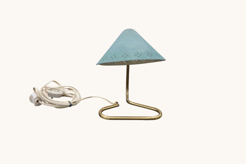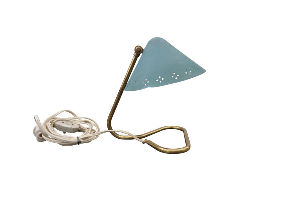 Turquoise table lamp, model GK14, by Erik Wärnå for Gnosjö Konstsmide, Sweden, 1950s. This elegant mid-century lamp features a perforated metal shade in a characteristic turquoise, combined with brass details and a slender, angled stem. The original wiring is visually consistent with its period; however, a professional inspection is recommended for daily use. Its compact footprint and focused light make it ideal as a writing, reading, or accent lamp, bringing authentic Scandinavian mid-century charm to any room.