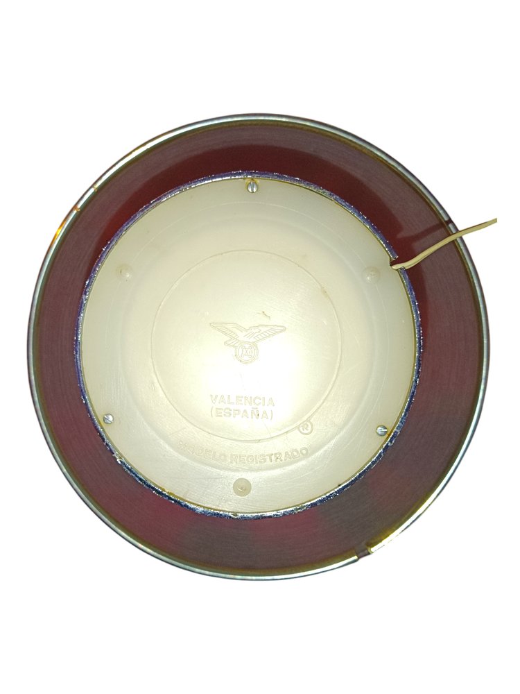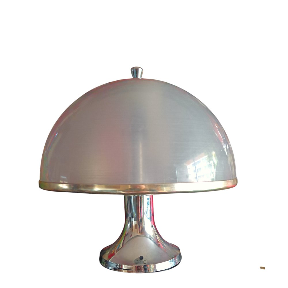 Esta impresionante lámpara de mesa vintage es una pieza original de los años 60-70, representativa del icónico diseño Space Age. Su estructura en plástico gris y su pantalla semiesférica con ribete cromado en plateado evocan la estética futurista de la época, fusionando elegancia y funcionalidad en un solo objeto.