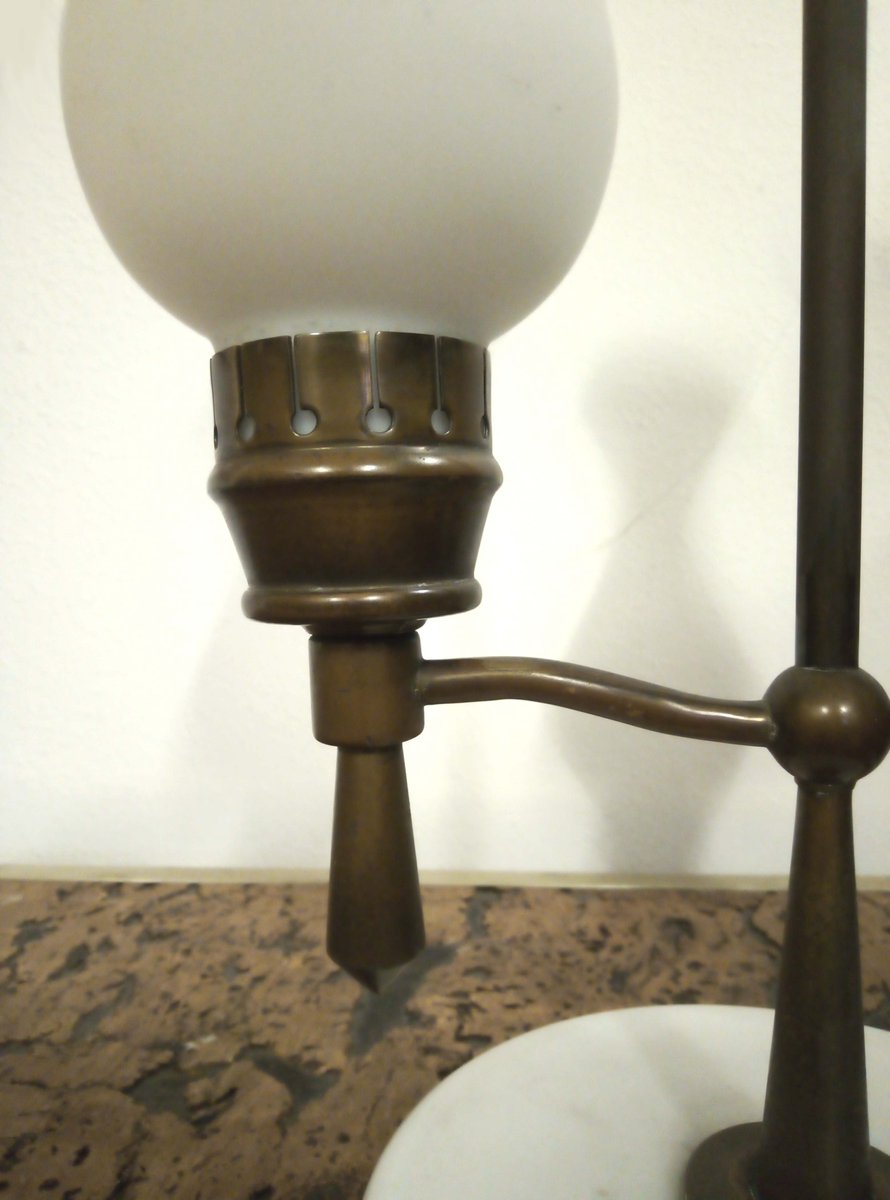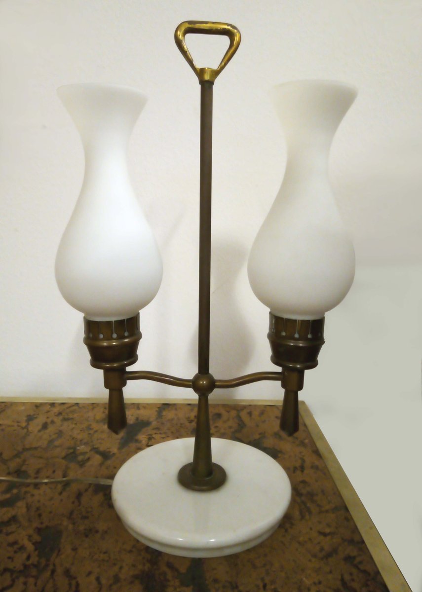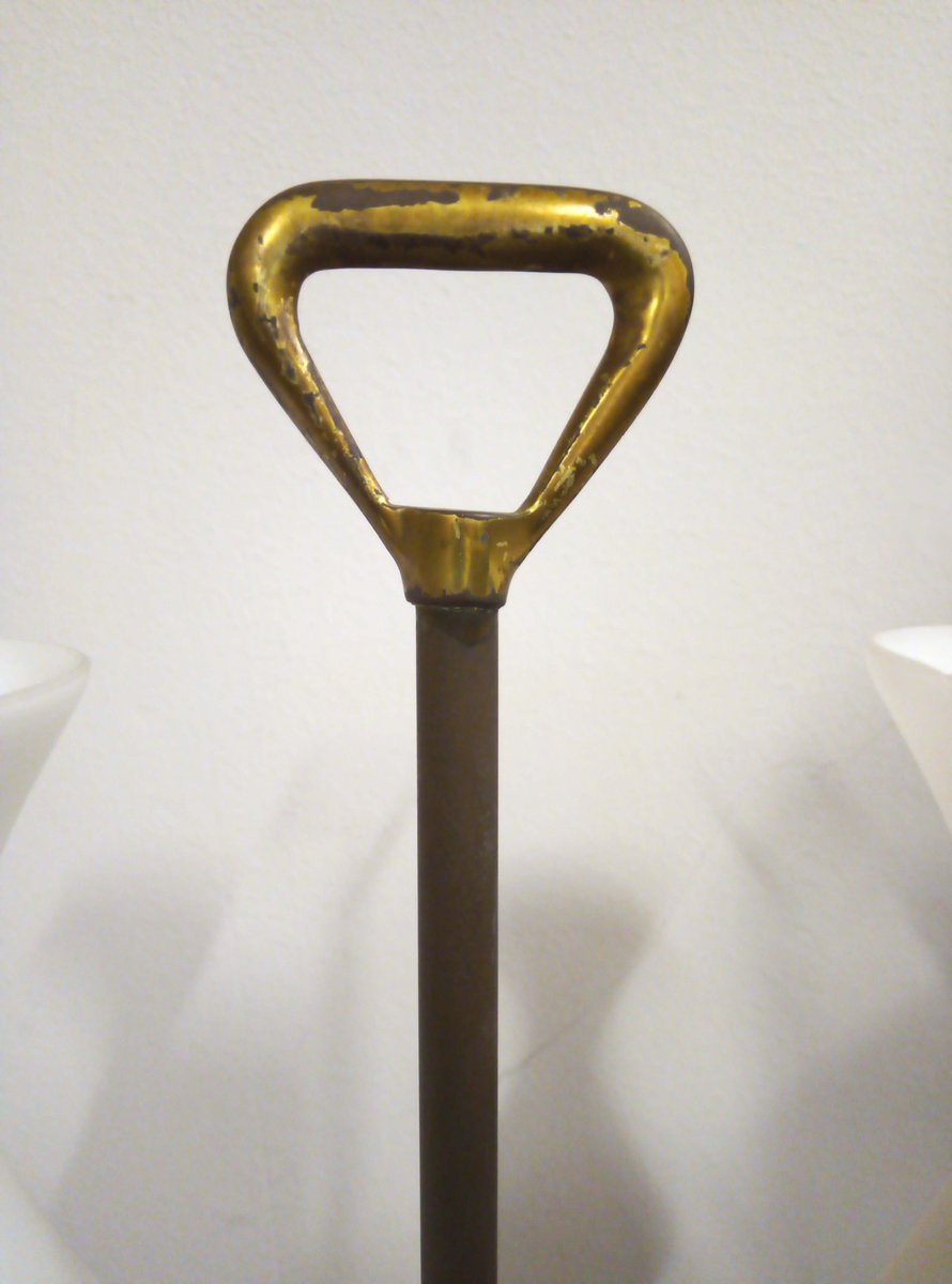 , many of which were designed by Lelli himself. Other iconic designers who worked with Arredoluce included Franco Albini, Achille and Pier Castiglioni, Vico Magistretti, Gio Ponti, Ettore Sottsass, Mario Tedeschi, and Nanda Vigo. Whereas many Arredoluce chandeliers and pendants are made from brass and feature opaline glass shades, the floor lamps and table lamps tend to be more minimalist in style, often featuring adjustable shades and articulated arms.