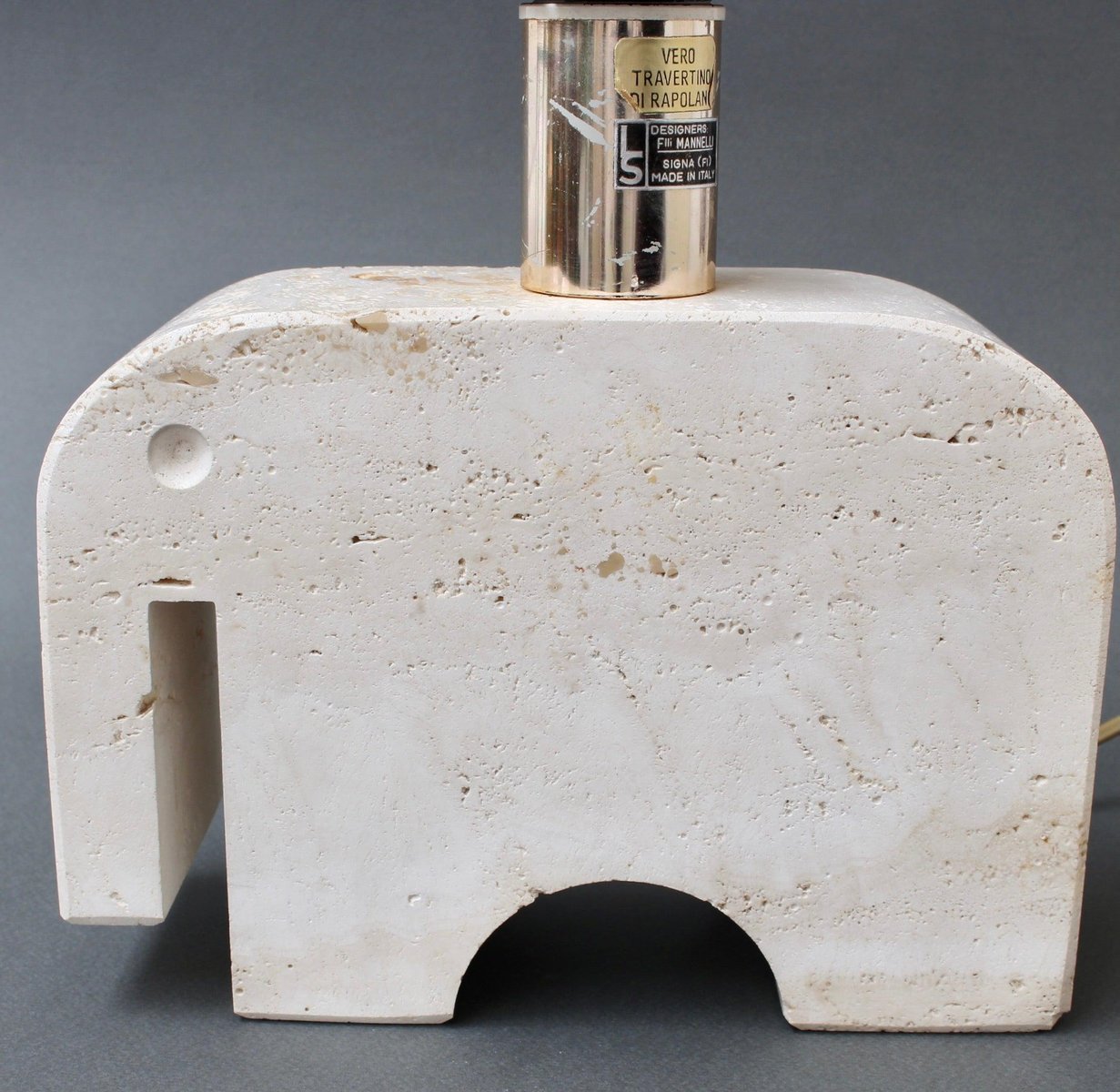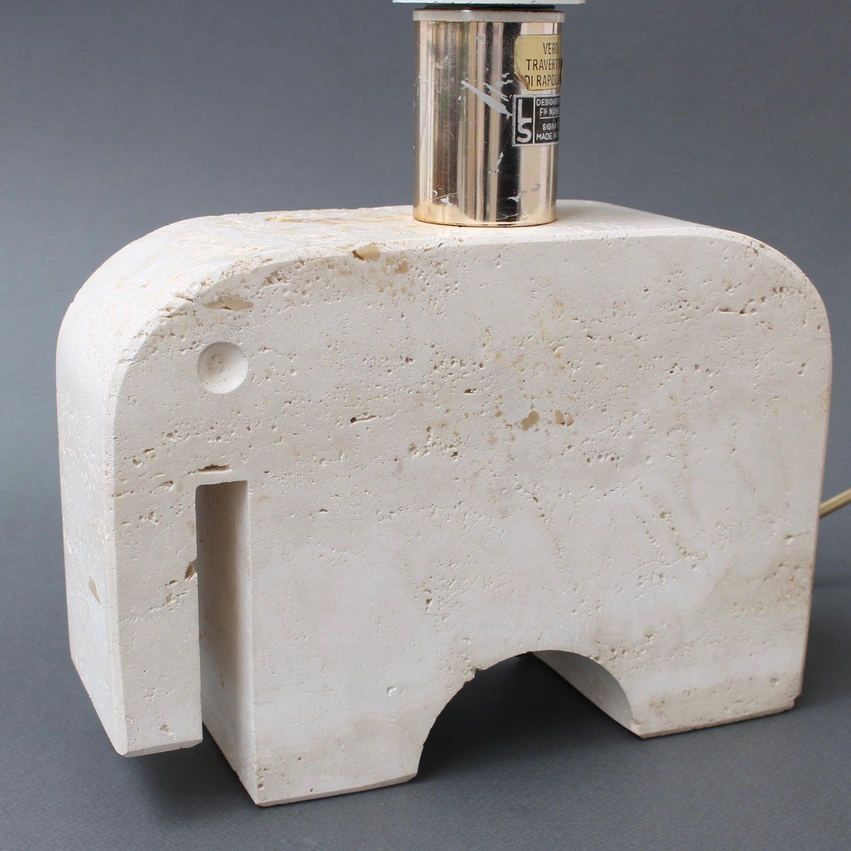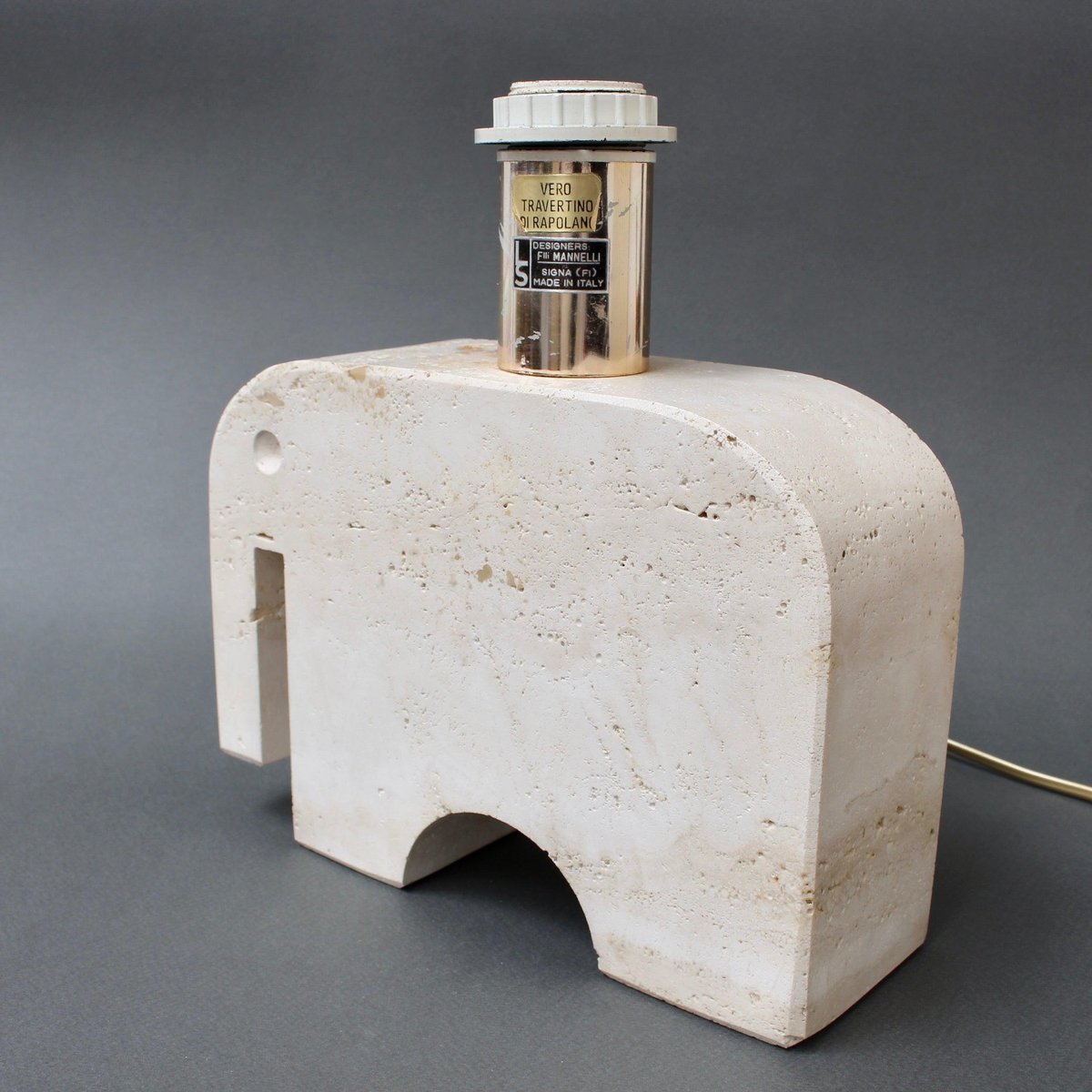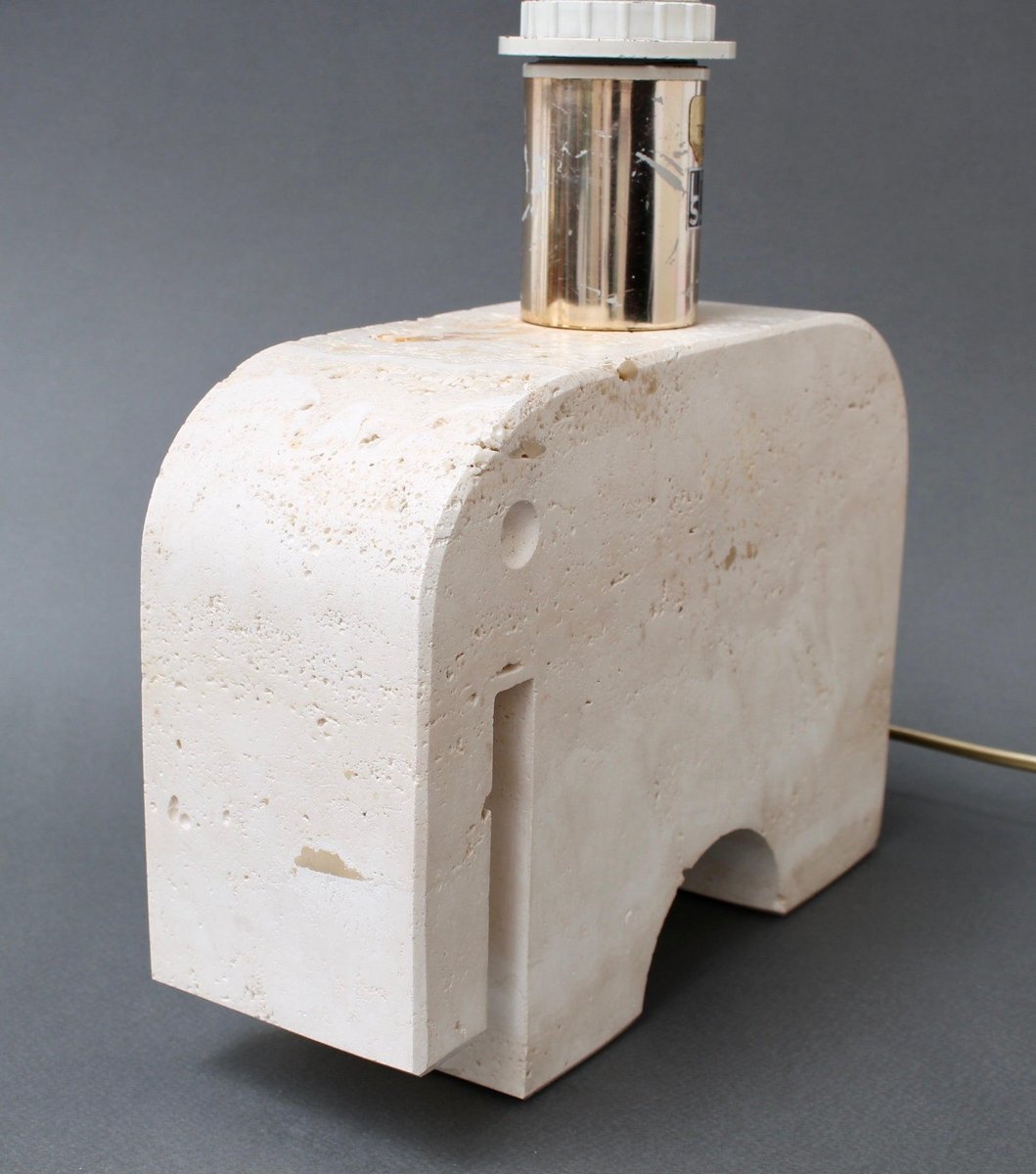 A vintage travertine whimsical elephant table lamp by Mannelli Bros., Florence, Italy (circa 1970s). A joyful, real travertine stylised elephant will delight art lovers and collectors and provide lighting at the same time! Minimalist in style with soft curves and lines, this sculptural lighting could even be displayed as a work of art or used functionally as designed. Very weighty and beautifully tactile with characterful marbling and natural cracking. The Designers' mark appears on the lamp holder. Currently rewired for UK use. The contemporary lampshade is included. About the Artists : The Mannelli brothers created wonderful pieces from Travertine, a form of limestone found in several places in Europe. In Italy it is located in the heart of the Province of Siena, in the quaint village of Rapolano Terme. Not all pieces are signed or marked. If you see these pieces marked with 'Raymor', this was the label of the American importer of the Brothers Mannelli's pieces. Fratelli Mannelli also designed for Marble Art, from Marta in the Province of Viterbo in the region of Latium, Italy. Dimensions of travertine elephant only, excluding bulb holder : H 17cm / 6.7" W 24cm / 9.4" D 8 cm / 3.1" Overall dimensions including lampshade : H 41 cm / 16.1" W 30 cm / 11.8" D 19 cm / 7.5"