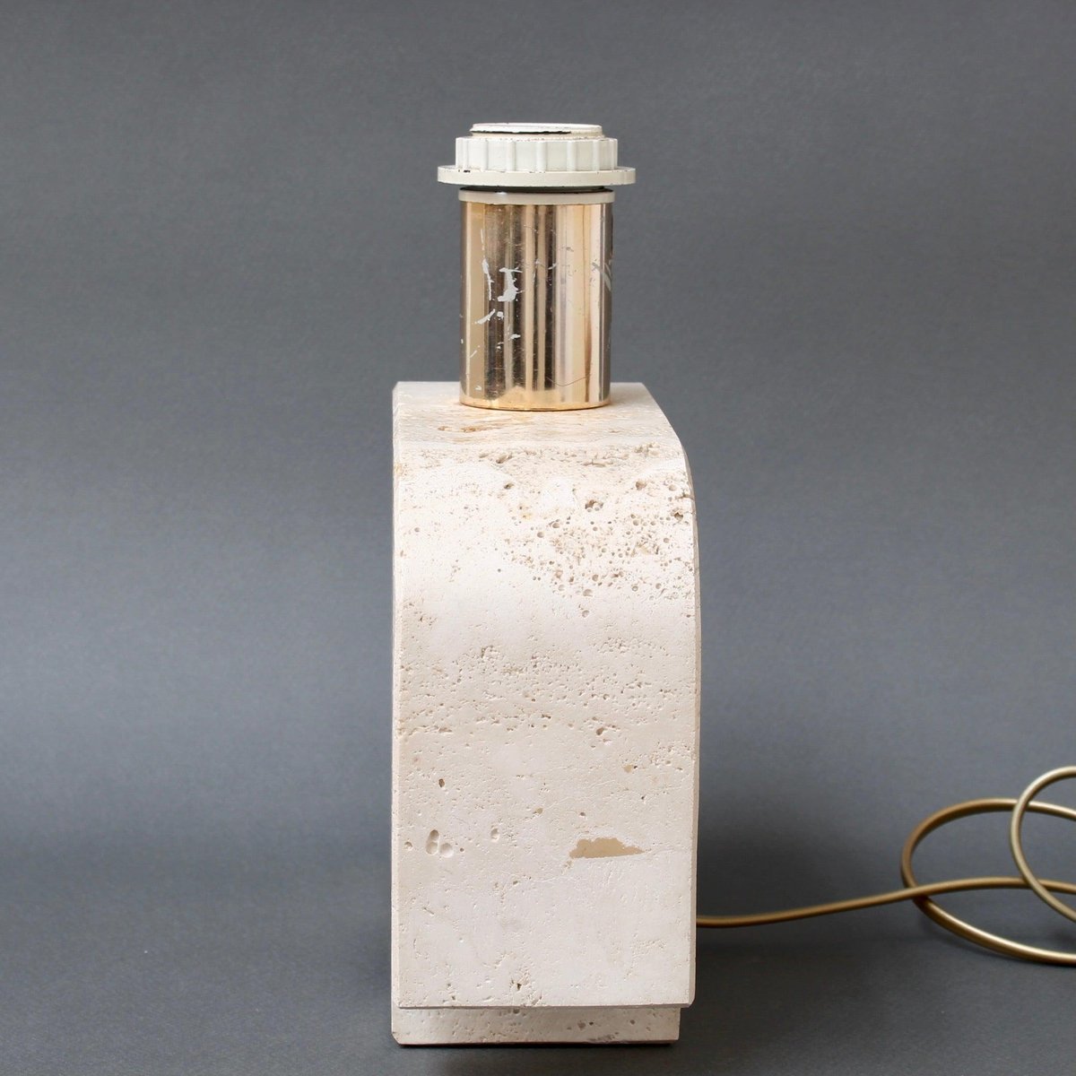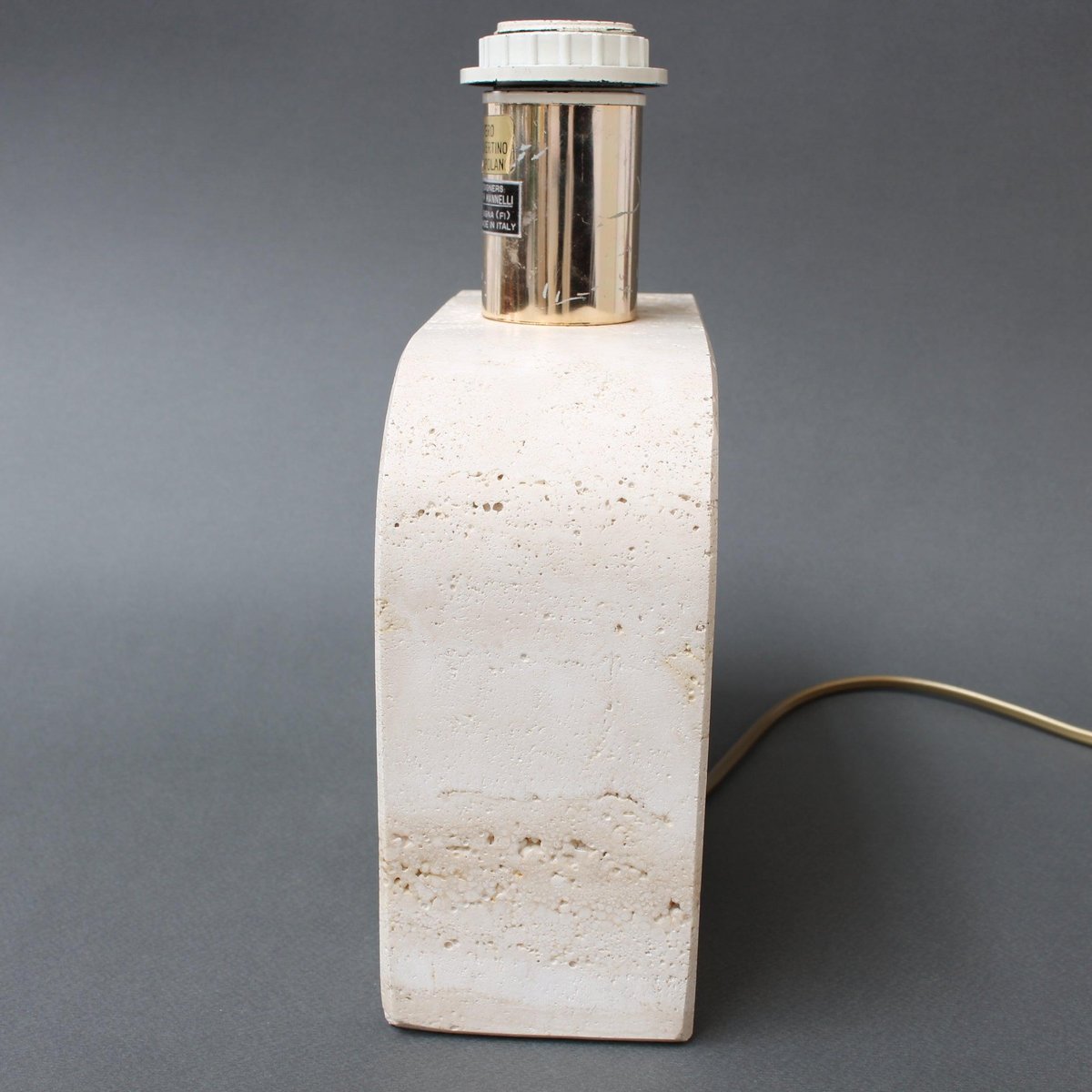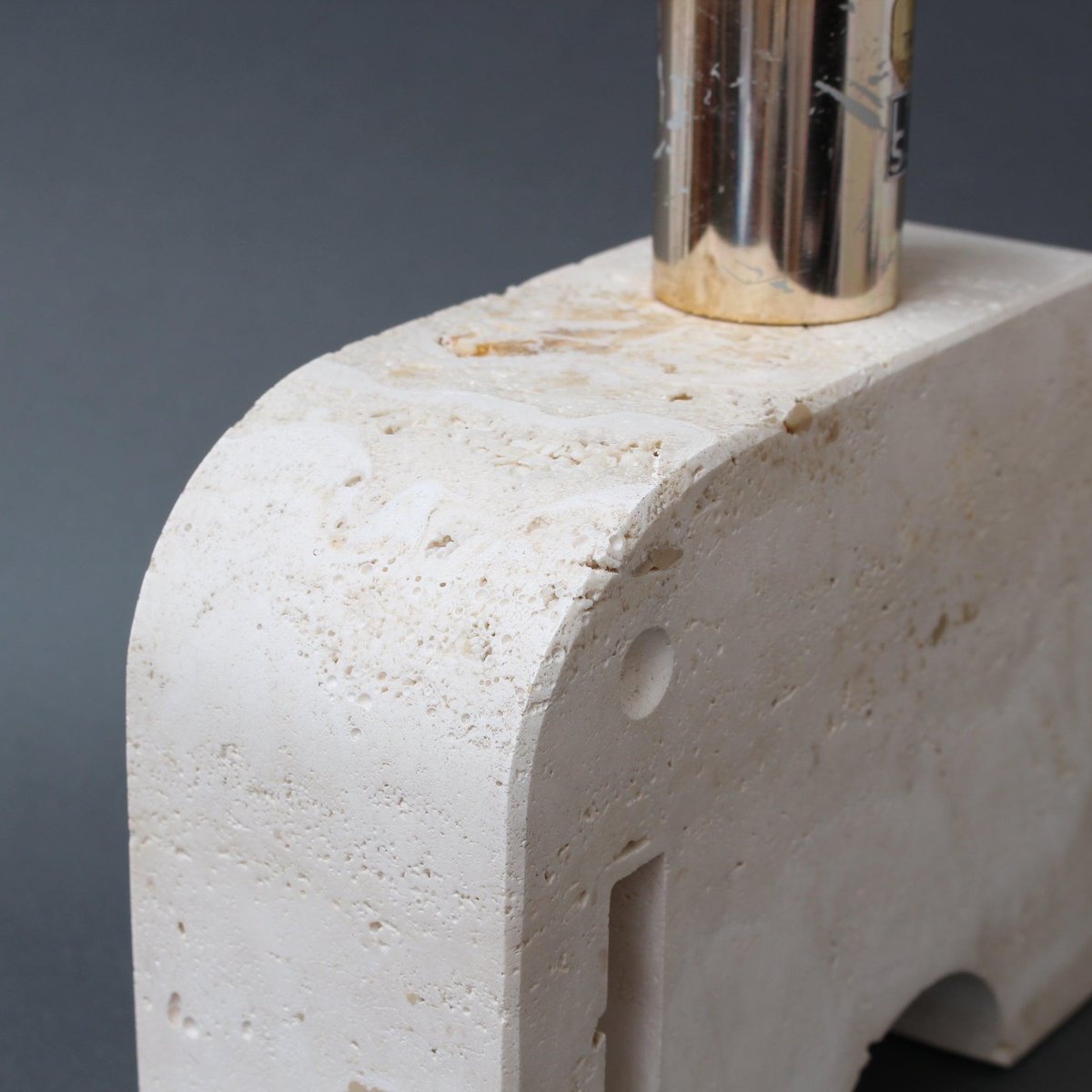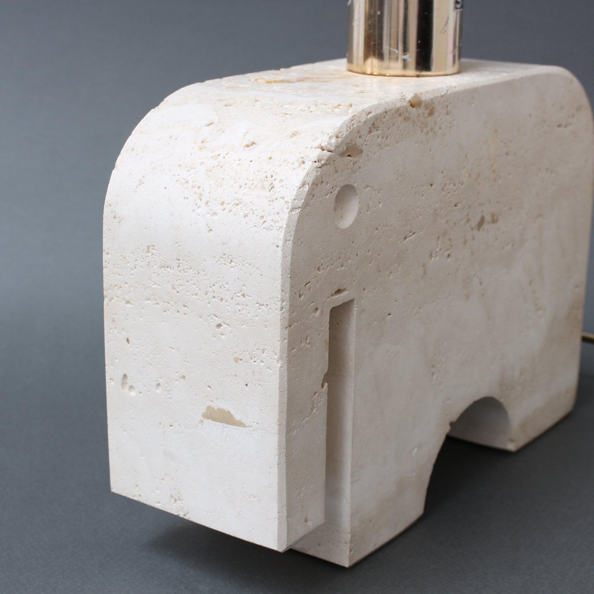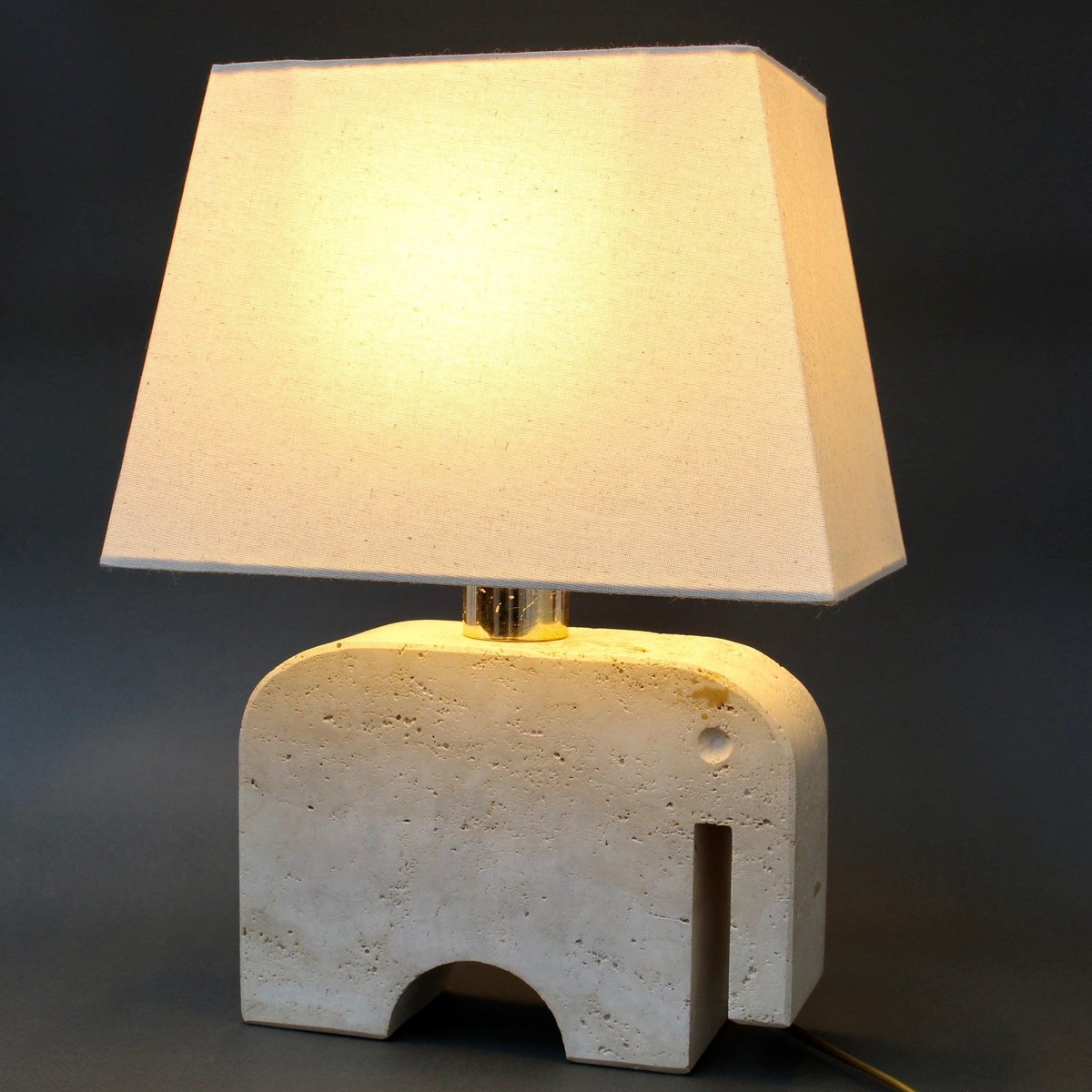 A vintage travertine whimsical elephant table lamp by Mannelli Bros., Florence, Italy (circa 1970s). A joyful, real travertine stylised elephant will delight art lovers and collectors and provide lighting at the same time! Minimalist in style with soft curves and lines, this sculptural lighting could even be displayed as a work of art or used functionally as designed. Very weighty and beautifully tactile with characterful marbling and natural cracking. The Designers' mark appears on the lamp holder. Currently rewired for UK use. The contemporary lampshade is included. About the Artists : The Mannelli brothers created wonderful pieces from Travertine, a form of limestone found in several places in Europe. In Italy it is located in the heart of the Province of Siena, in the quaint village of Rapolano Terme. Not all pieces are signed or marked. If you see these pieces marked with 'Raymor', this was the label of the American importer of the Brothers Mannelli's pieces. Fratelli Mannelli also designed for Marble Art, from Marta in the Province of Viterbo in the region of Latium, Italy. Dimensions of travertine elephant only, excluding bulb holder : H 17cm / 6.7" W 24cm / 9.4" D 8 cm / 3.1" Overall dimensions including lampshade : H 41 cm / 16.1" W 30 cm / 11.8" D 19 cm / 7.5"