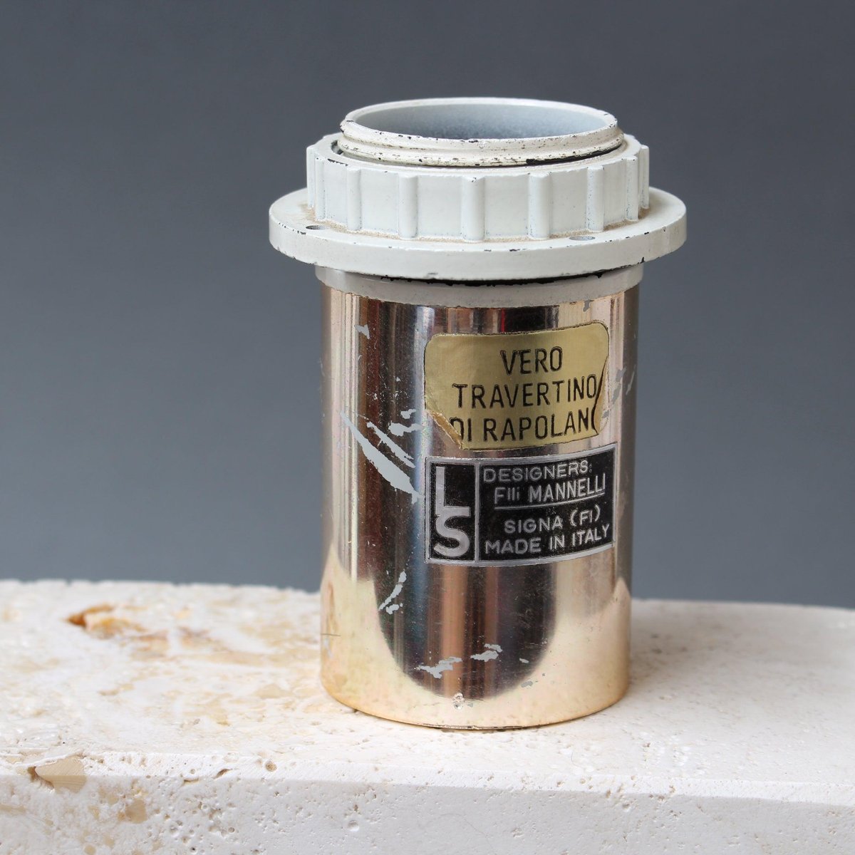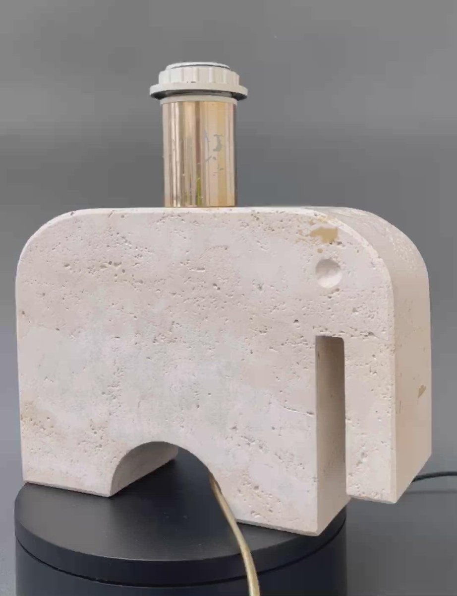 Lámpara de mesa vintage de travertino con forma de elefante de Mannelli Bros., Florencia, Italia (alrededor de los años 70). Un alegre elefante estilizado de travertino real hará las delicias de los amantes del arte y de los coleccionistas y proporcionará iluminación al mismo tiempo De estilo minimalista, con curvas y líneas suaves, esta iluminación escultórica podría exponerse como obra de arte o utilizarse funcionalmente tal y como está diseñada. Tiene mucho peso y es muy agradable al tacto, con un jaspeado de carácter y un agrietamiento natural. La marca de los diseñadores aparece en el portalámparas. Actualmente está recableada para su uso en el Reino Unido. Se incluye la pantalla contemporánea. Sobre los artistas : Los hermanos Mannelli crearon maravillosas piezas de Travertino, una forma de piedra caliza que se encuentra en varios lugares de Europa. En Italia se encuentra en el corazón de la provincia de Siena, en el pintoresco pueblo de Rapolano Terme. No todas las piezas están firmadas o marcadas. Si ve estas piezas marcadas con "Raymor", ésta era la etiqueta del importador americano de las piezas de los hermanos Mannelli. Los hermanos Mannelli también diseñaron para Marble Art, de Marta, en la provincia de Viterbo, en la región del Lacio, Italia. Dimensiones del elefante de travertino únicamente, sin incluir el portalámparas: H 17cm / 6.7" W 24cm / 9.4" D 8 cm / 3.1" Dimensiones totales incluyendo la pantalla : H 41 cm / 16.1" W 30 cm / 11.8" D 19 cm / 7.5"