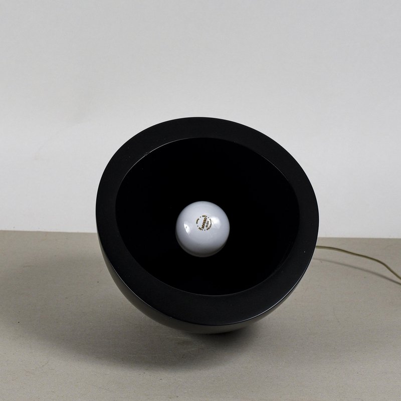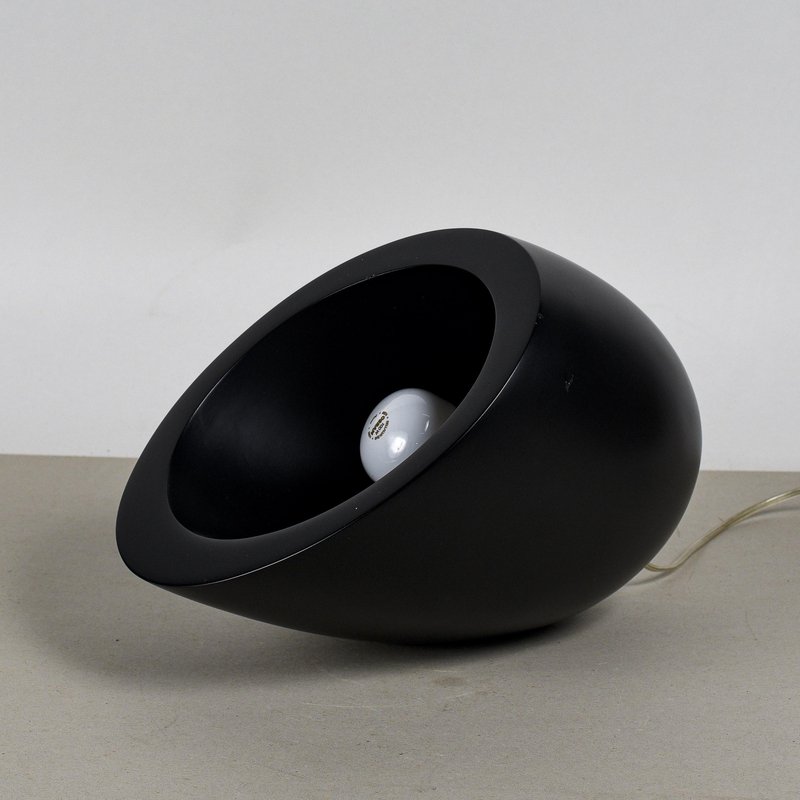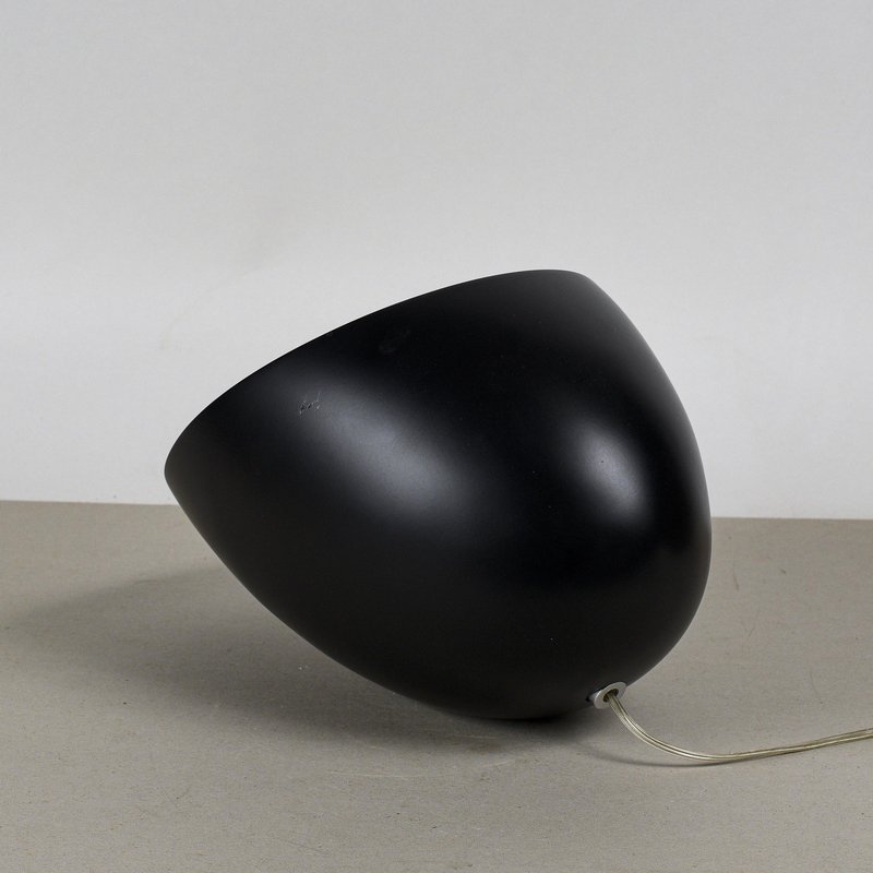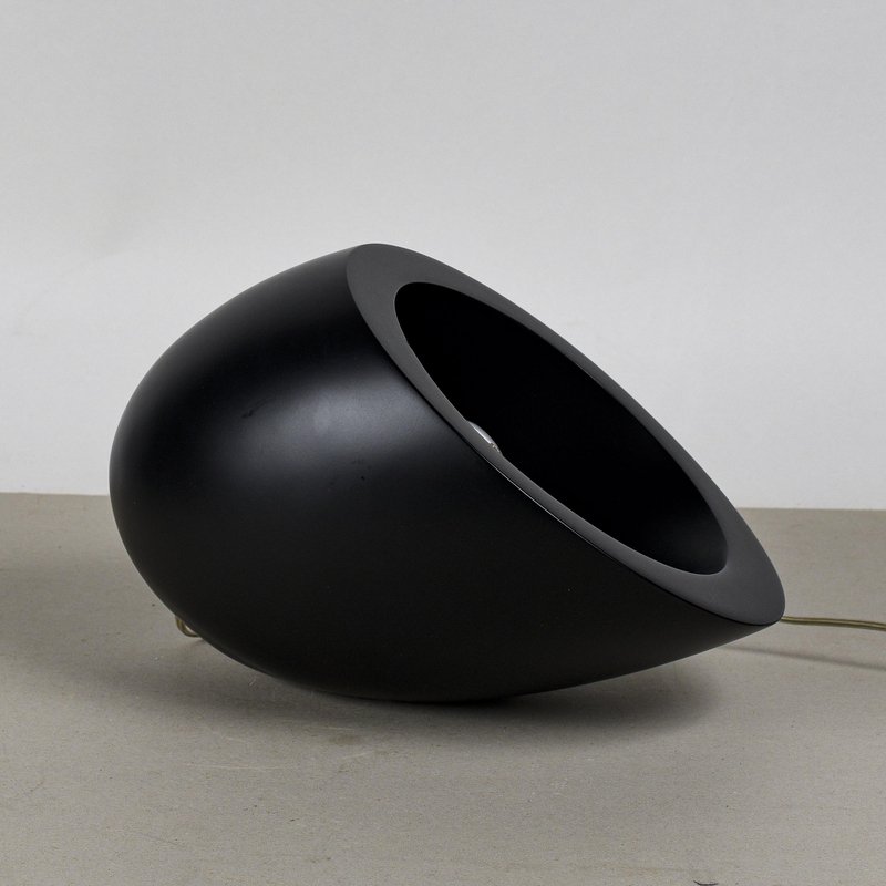 This table lamp perfectly embodies the Midcentury Modern aesthetic, with a minimalist and sculptural design. Its inverted teardrop or semi-spherical shape, crafted from a matte black lacquered material, makes it a visually striking piece of modern art. The lack of a flat base and the inclined geometry allow the lamp to direct the light, lending it a dynamic feel. The distinctive feature of this lamp is its pure aesthetic functionality: the lighting element is recessed within the cavity, projecting an indirect and controlled light. The matte black color emphasizes the contrast with the light emitted. This object is not just a light source, but a true luminous sculpture. Perfect for bedside tables, desks, or bookcases, it adds a vintage and designer touch to any contemporary or period setting. A great opportunity for collectors of modern art. Dimensions: Width 35 cm, Depth 24 cm, Height 23 cm CATEGORY: Lamp STYLE: Vintage DIMENSIONS: HEIGHT 23 cm WIDTH 35 cm DEPTH 24 cm COLOR: Black MATERIAL: Wood, Metal CONDITION: Excellent This vintage piece is in near-original condition. It may show minor traces of use and/or minor restorations.