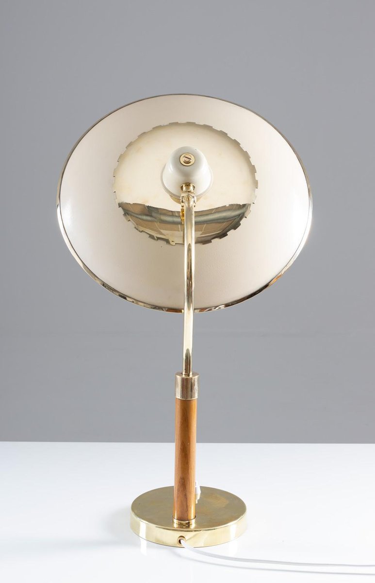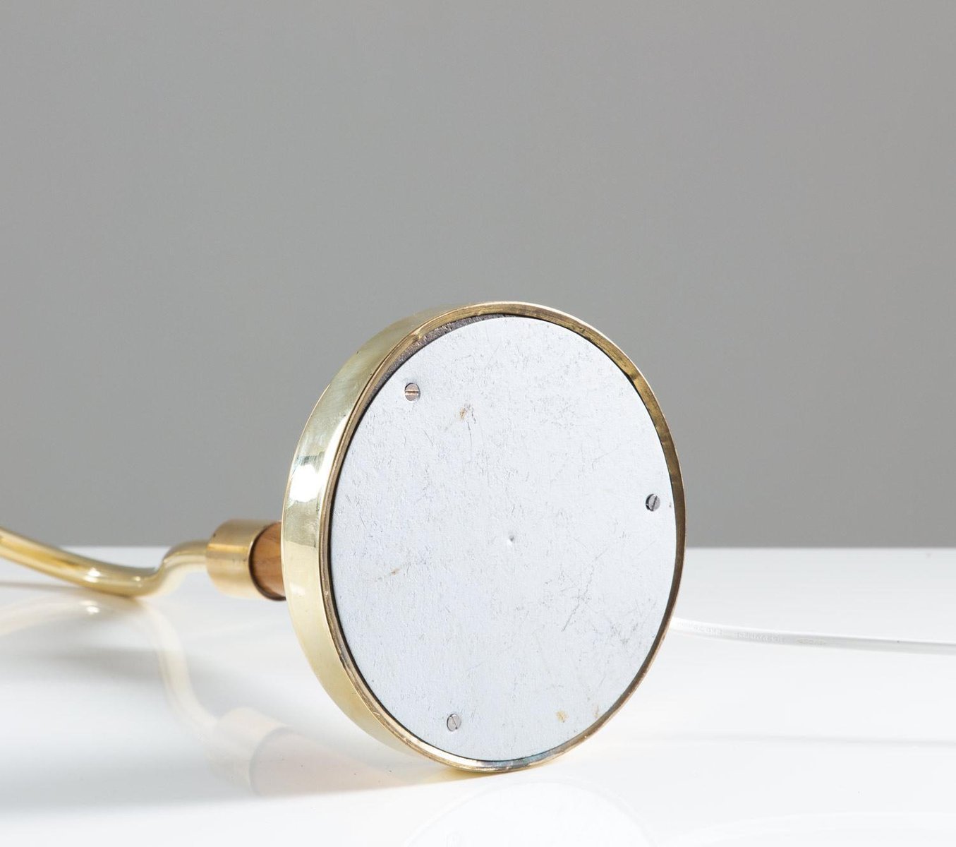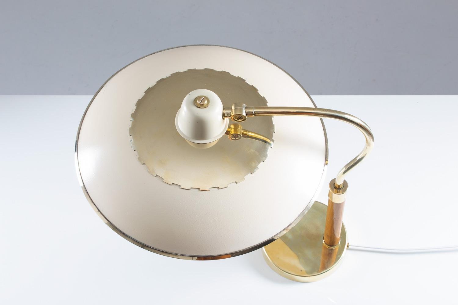 Lámpara de mesa sueca de mediados de siglo en latón, cristal y madera, producida por Boréns, años 40. La lámpara consta de una gran pantalla pintada en blanco, decorada con detalles de latón pulido. La bombilla está rodeada por una segunda pantalla de vidrio opalino esmerilado. Esta rara lámpara es con su gran tamaño y gran diseño un punto de atracción en cualquier habitación. La calidad es excelente, todas las piezas son de latón macizo. La lámpara da una luz acogedora y ambiental cuando está encendida. Estado: Muy buen estado de restauración. Las partes de latón han sido pulidas, pero para las partes pintadas hemos mantenido el color original.