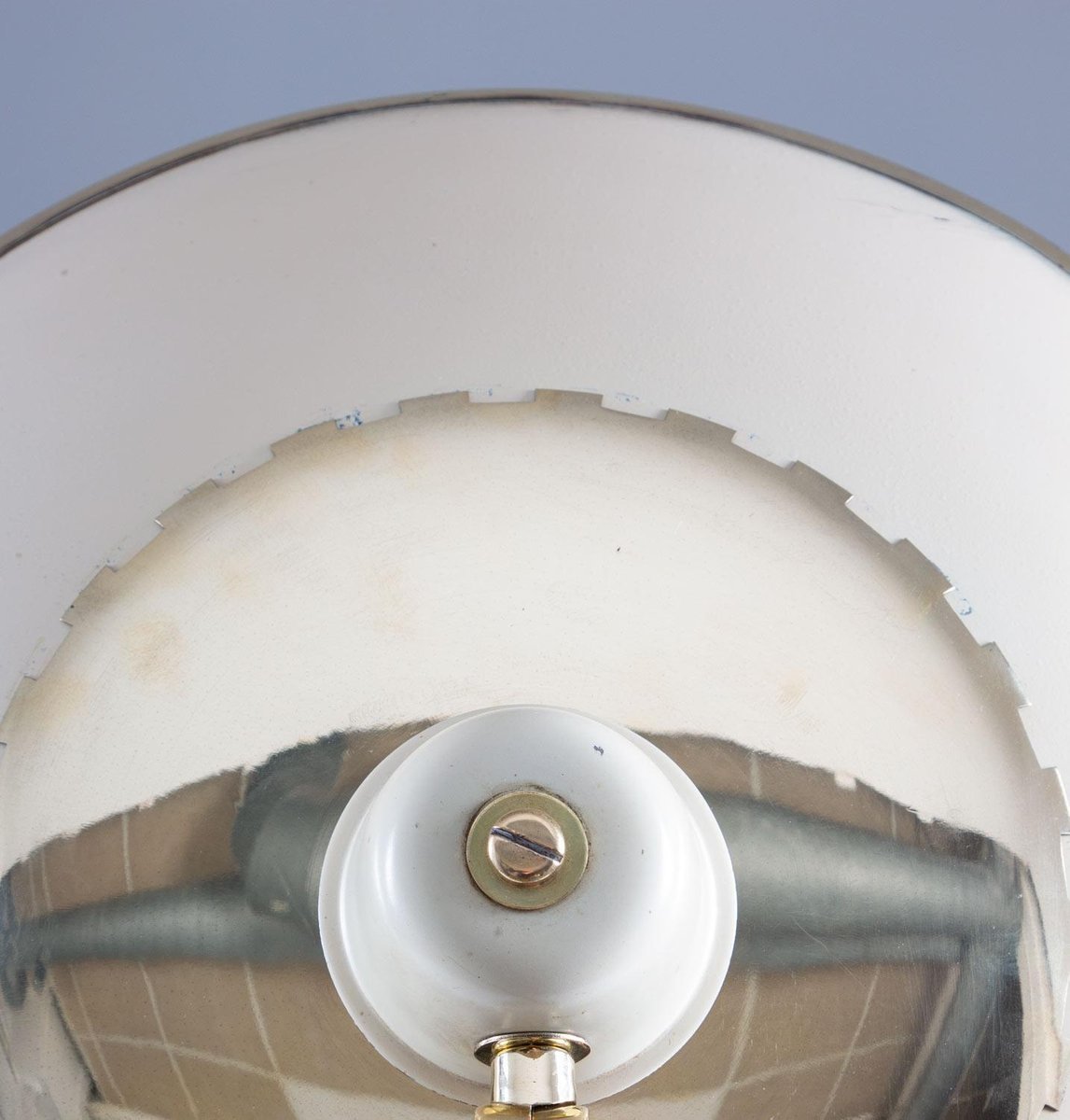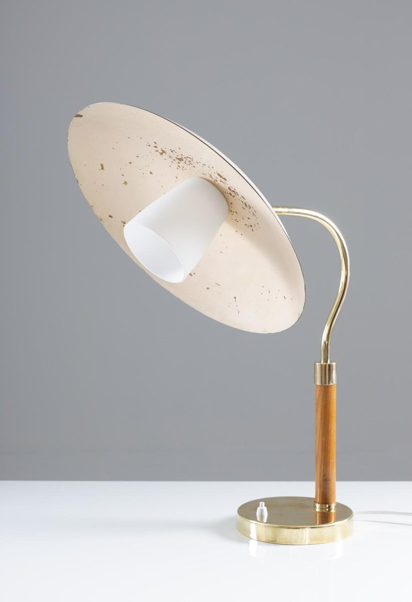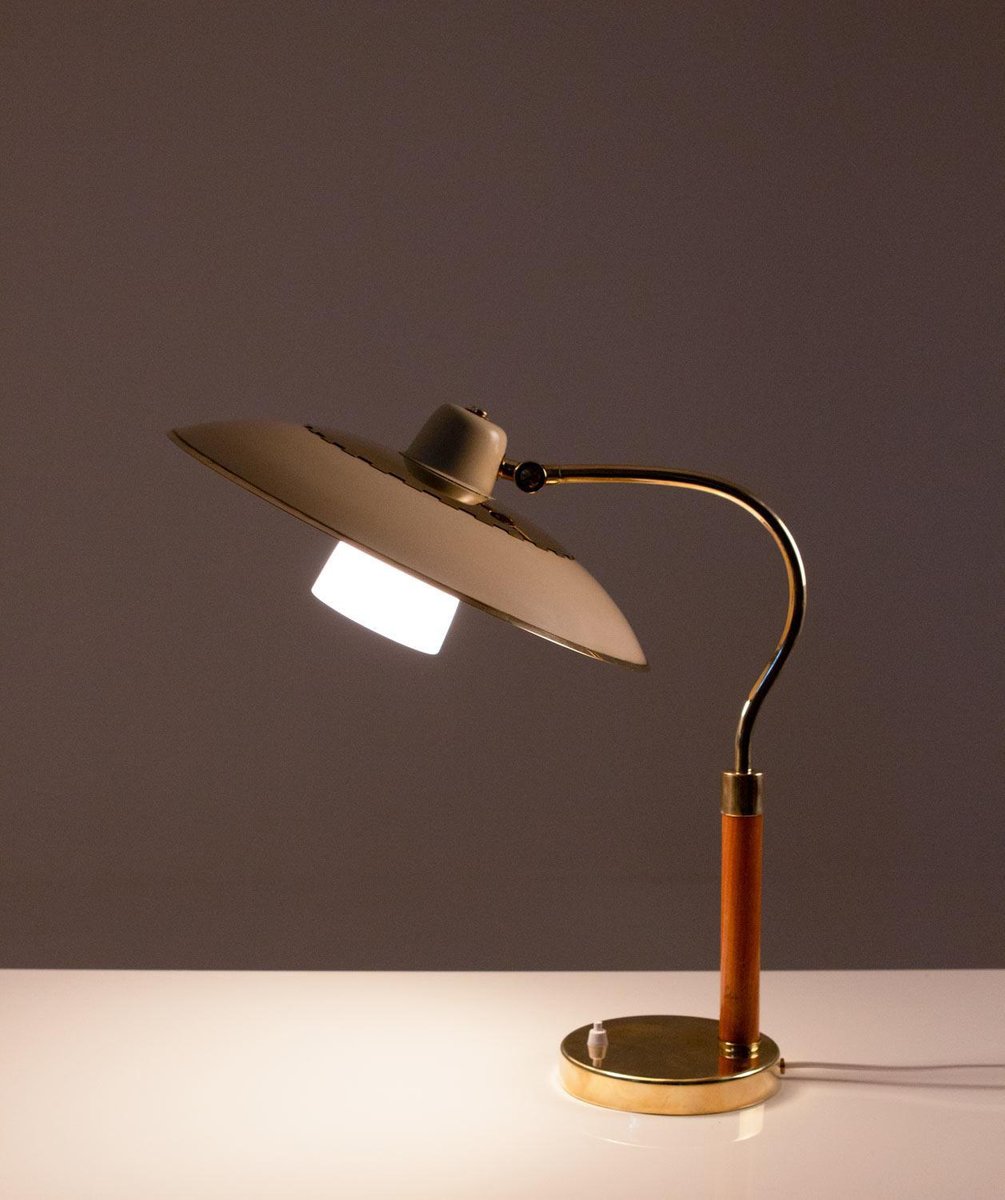 Lámpara de mesa sueca de mediados de siglo en latón, cristal y madera, producida por Boréns, años 40. La lámpara consta de una gran pantalla pintada en blanco, decorada con detalles de latón pulido. La bombilla está rodeada por una segunda pantalla de vidrio opalino esmerilado. Esta rara lámpara es con su gran tamaño y gran diseño un punto de atracción en cualquier habitación. La calidad es excelente, todas las piezas son de latón macizo. La lámpara da una luz acogedora y ambiental cuando está encendida. Estado: Muy buen estado de restauración. Las partes de latón han sido pulidas, pero para las partes pintadas hemos mantenido el color original.