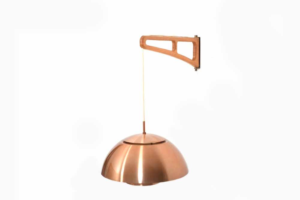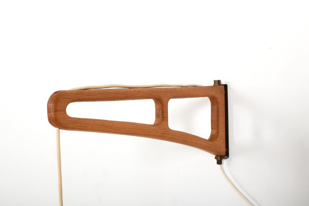Lámpara de pared danesa de roble y cobre, años 60