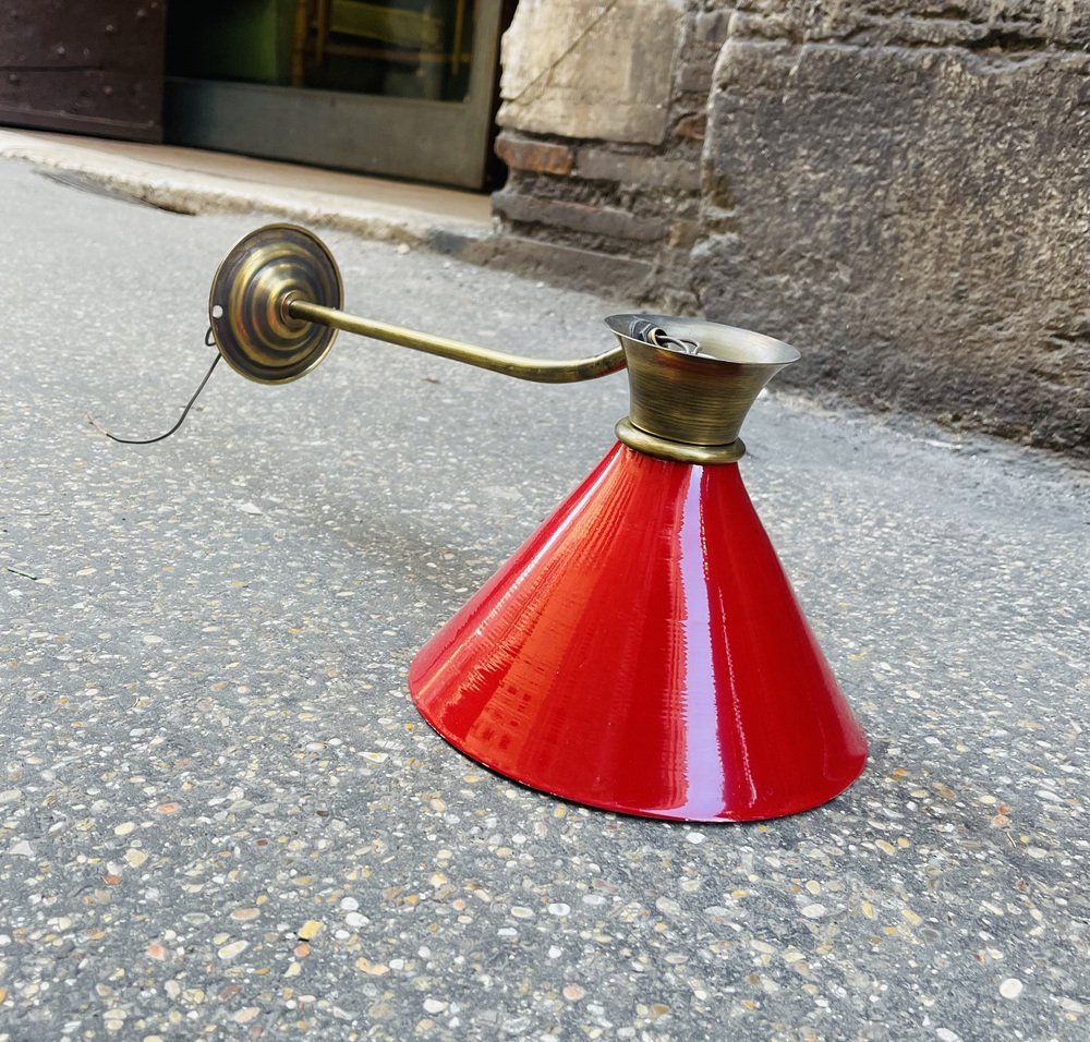 Elegant original Italian wall lights from the 1960s, made of polished brass and burgundy painted aluminum, completely restored in keeping with the period design.