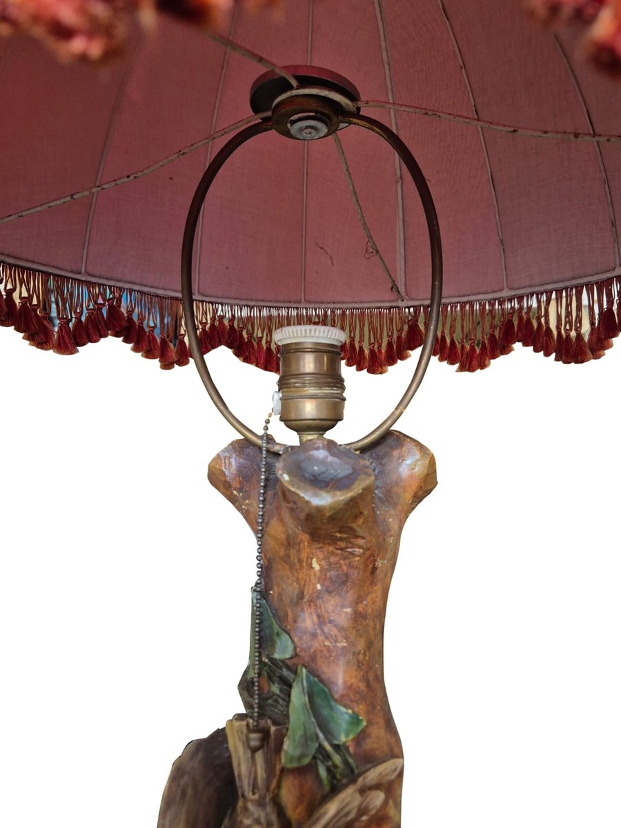 Rara lámpara de pie retorcida tallada en una sola pieza de madera maciza, que data de mediados del siglo XIX. Ricamente decorada con querubines, pájaros y motivos de enredaderas en un estilo barroco tardío ornamentado, esta pieza es un verdadero tesoro decorativo y coleccionable. Diseñada originalmente como una columna ornamental, más tarde se convirtió en una lámpara de pie, conservando todo el encanto de la artesanía original. Se completa con una pantalla de tela roja en forma de cúpula con flecos decorativos, ideal para añadir calidez y elegancia a cualquier interior clásico. Buen estado vintage, con signos de antigüedad acordes con su historia. Época: mediados del siglo XIX. Material: madera maciza tallada a mano, base ornamentada, pantalla de tela. Elementos decorativos: querubines, pájaros, motivos de enredaderas.