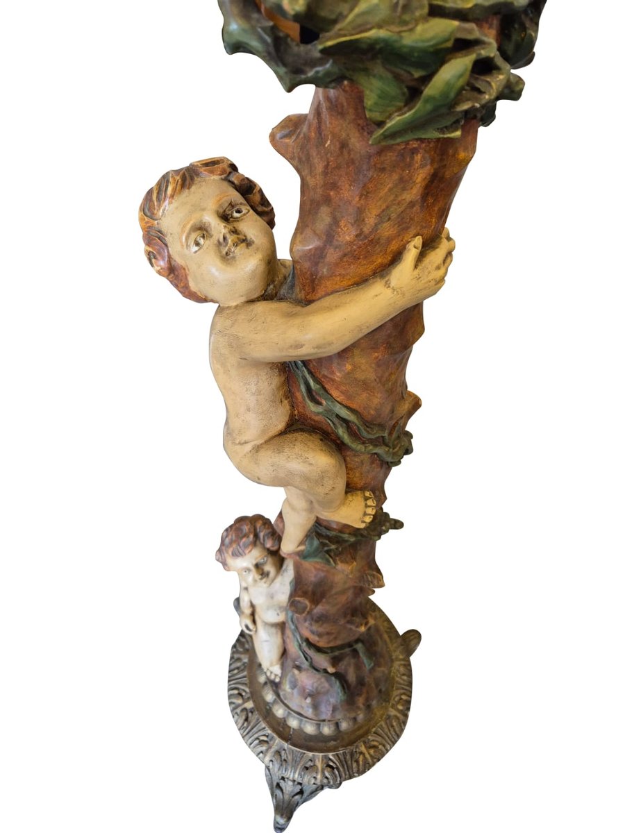 Rare twisted floor lamp carved from a single piece of solid wood, dating back to the mid-19th century. Richly decorated with putti, birds, and vine motifs in an ornate late Baroque style, this piece is a true decorative and collectible treasure.