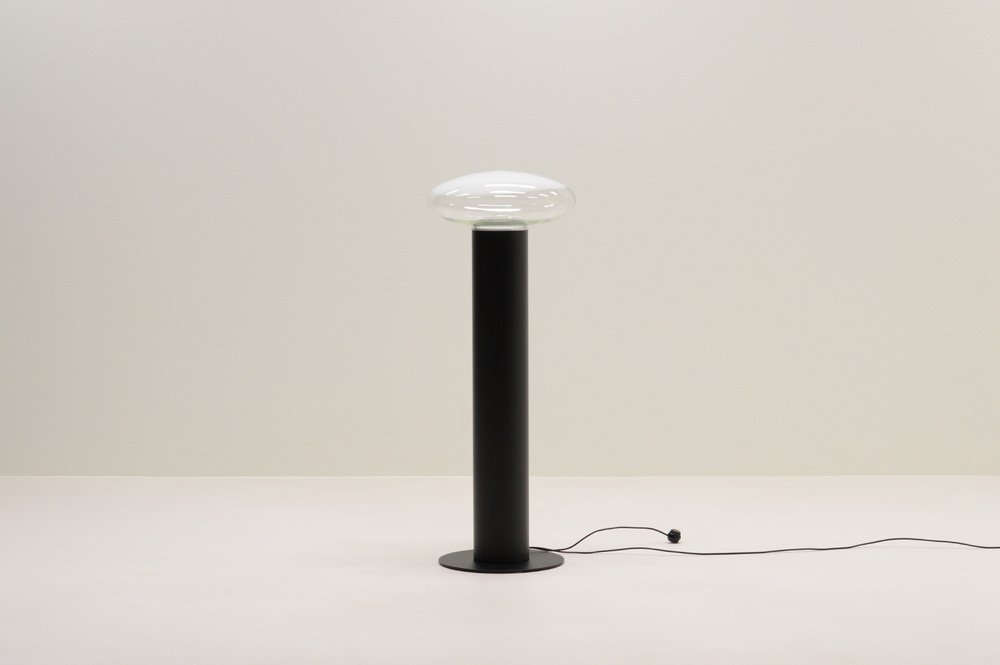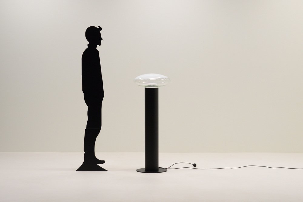 lámpara de pie "Gill" de Roberto Pamio para Leucos, años 60 Itay. Roberto Pamio es licenciado por la facultad de Arquitectura de la Universidad de Venecia. Estudió bajo la dirección de profesores como: Carlo Scarpa, Samonà, Gardella, De Carlo, Piccinato, Astengo y Zevi. Ha participado en numerosas conferencias y concursos nacionales e internacionales, recibiendo prestigiosos reconocimientos. Se trata de una lámpara muy rara, ya que se fabricó a medida para un cliente, normalmente no existen lámparas de pie Gill. La pesada base de metal ha sido repintada profesionalmente con pintura en polvo negra mate y de textura fina como la original. La pantalla de cristal de Murano es transparente con la parte superior blanca. Conserva el regulador de intensidad original de Leucos. La lámpara está marcada en la pantalla y en el regulador. En muy buen estado vintage.