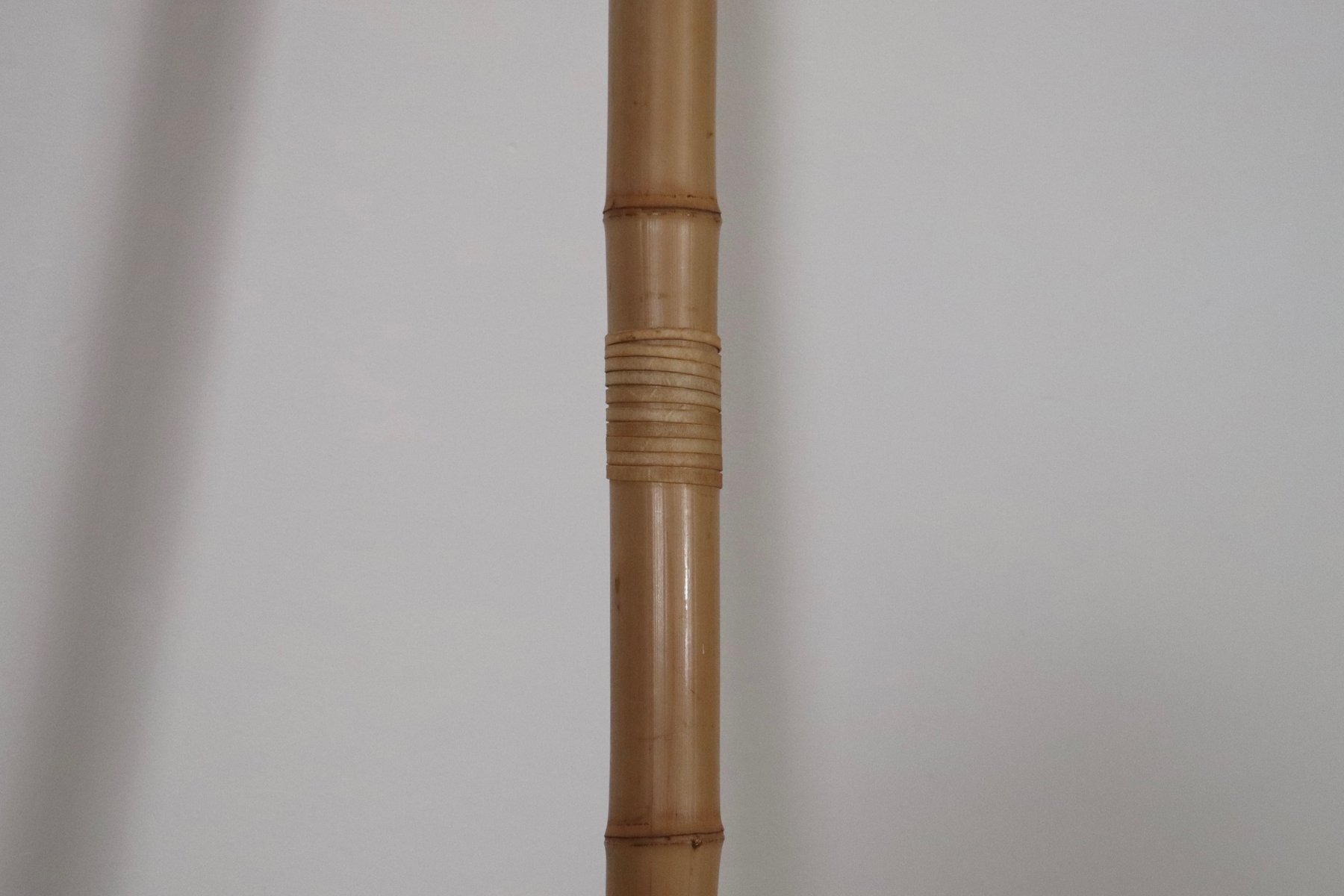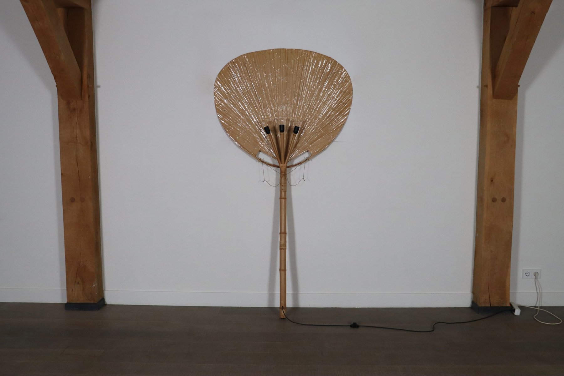 A breathtaking design which is handmade from bamboo, rice paper and metal. The beautiful large floor lamp edition of the iconic Uchiwa series is a true collectors item and statement piece in any interior. The rice paper is gracefully enforced with concealed metal wires due to its large size. The lamp leans against the wall and can be connected to the wall with two ropes to enhance stability. On the backside there are three light sockets illuminating the rice paper fan. Once turned on, the shade creates an enchanting silhouette when illuminated. Light seeps gracefully through the rice paper, casting soft, diffused radiance, while the bamboo elements cast intriguing shadows, creating an immersive lighting experience. Either switched on or off, this lamp will elevate any space with its striking appearance.