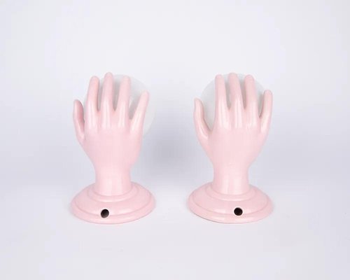 Introducing a luxurious pair of Pink Ceramic Hand Lamps, crafted to adorn your walls with elegance. These lamps feature delicate sculptures of pink ceramic hands, cradling lamp sockets designed for light bulbs. Originating from The Netherlands in the 1970s, they offer a rare blend of vintage charm and timeless allure.